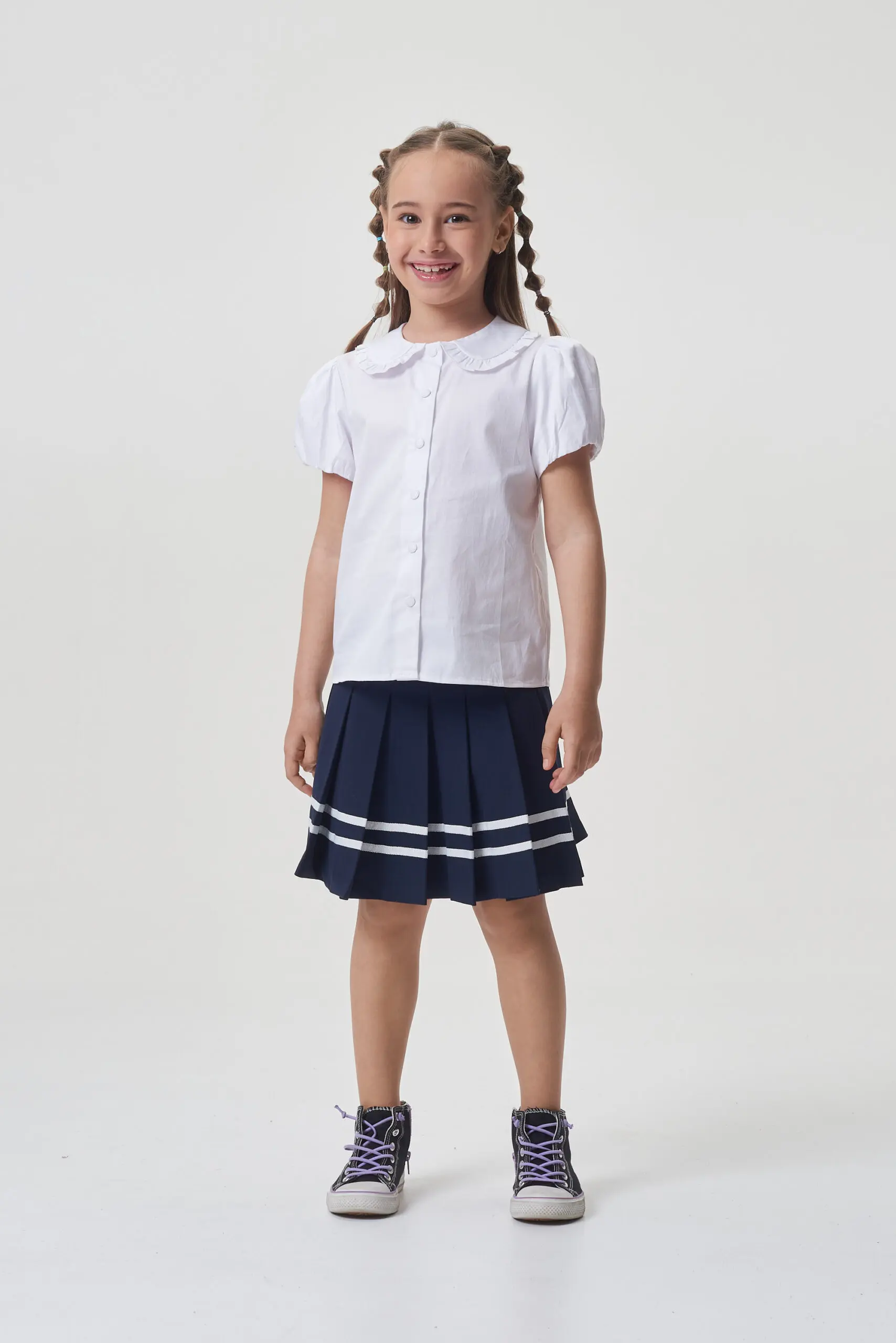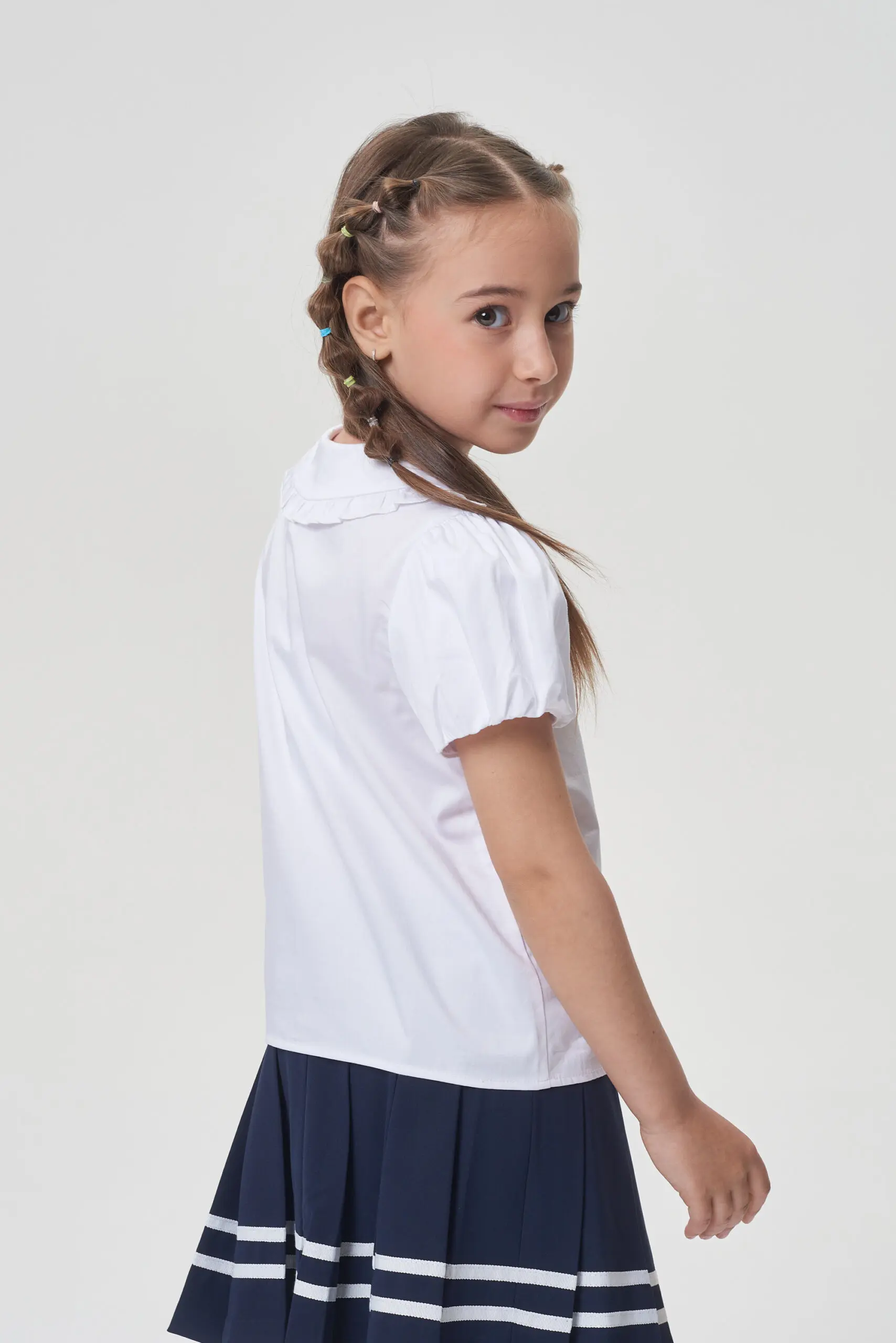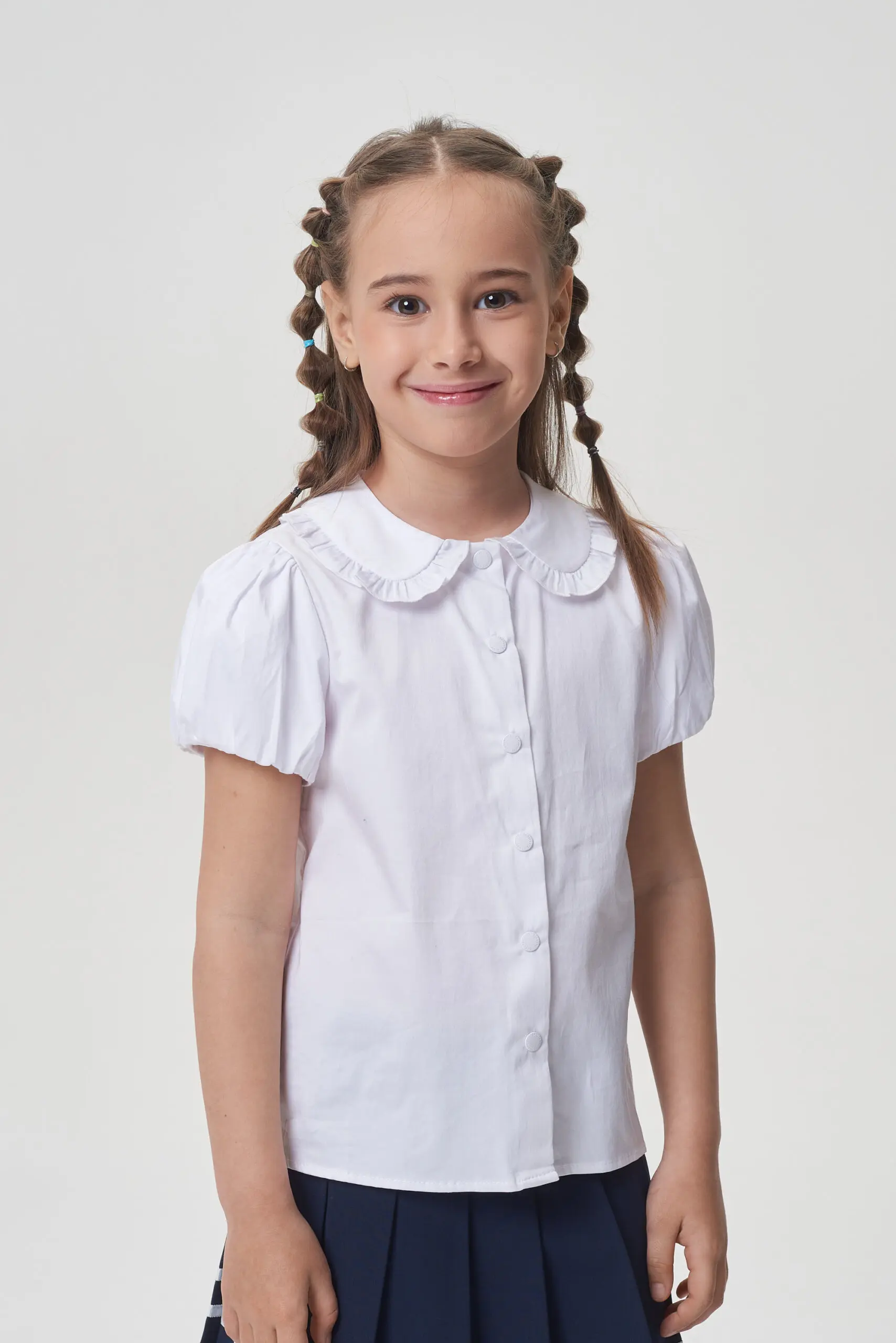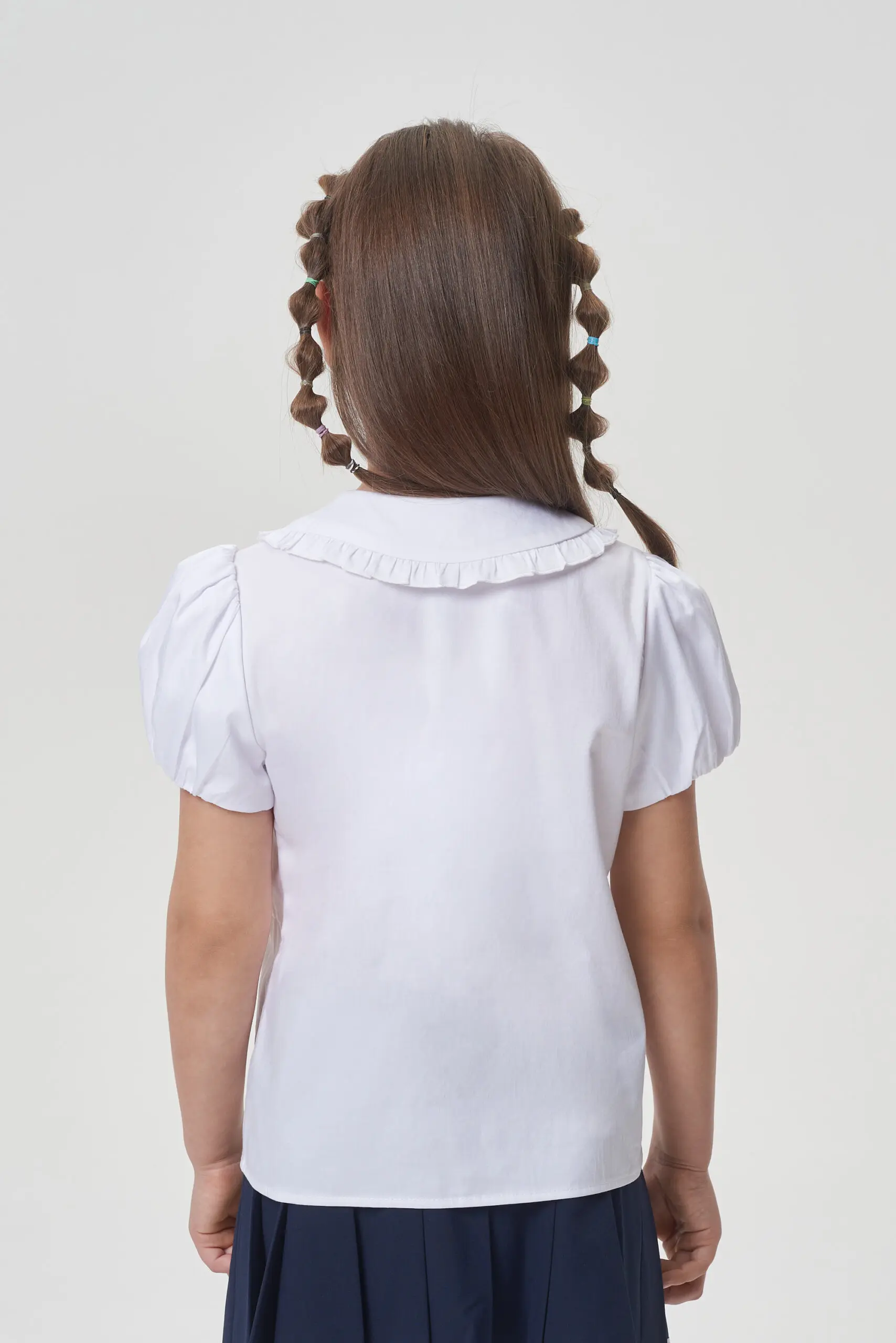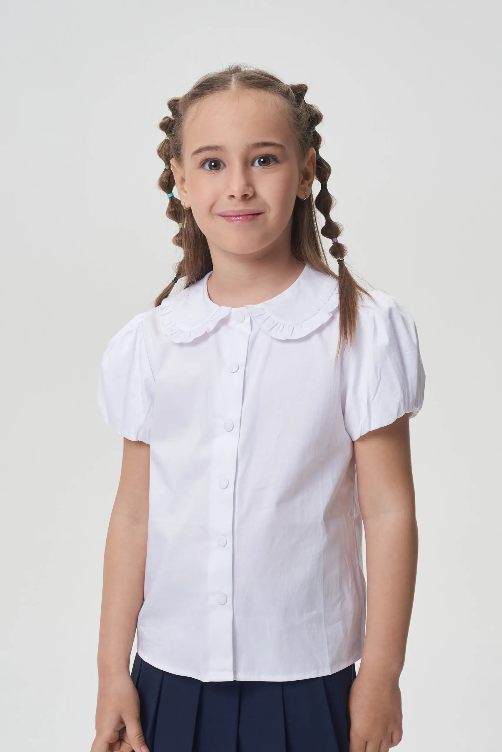 Очаровательная школьная блузка на основе хлопка. Модель имеет полуприлегающий силуэт и короткие рукава в форме фонариков. Закругленный отложной воротник украшен изящными рюшами. Застежка на кнопках по ... всей длине обеспечивает легкость в использовании. Эта базовая блузка станет незаменимой и удобной вещью в повседневном школьном гардеробе.