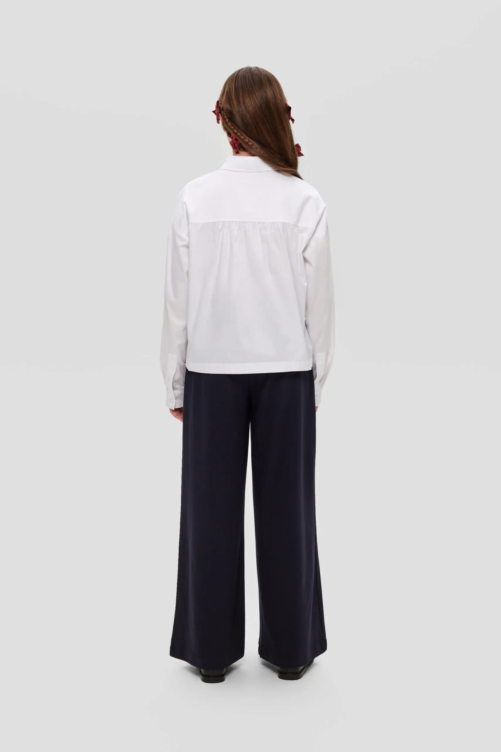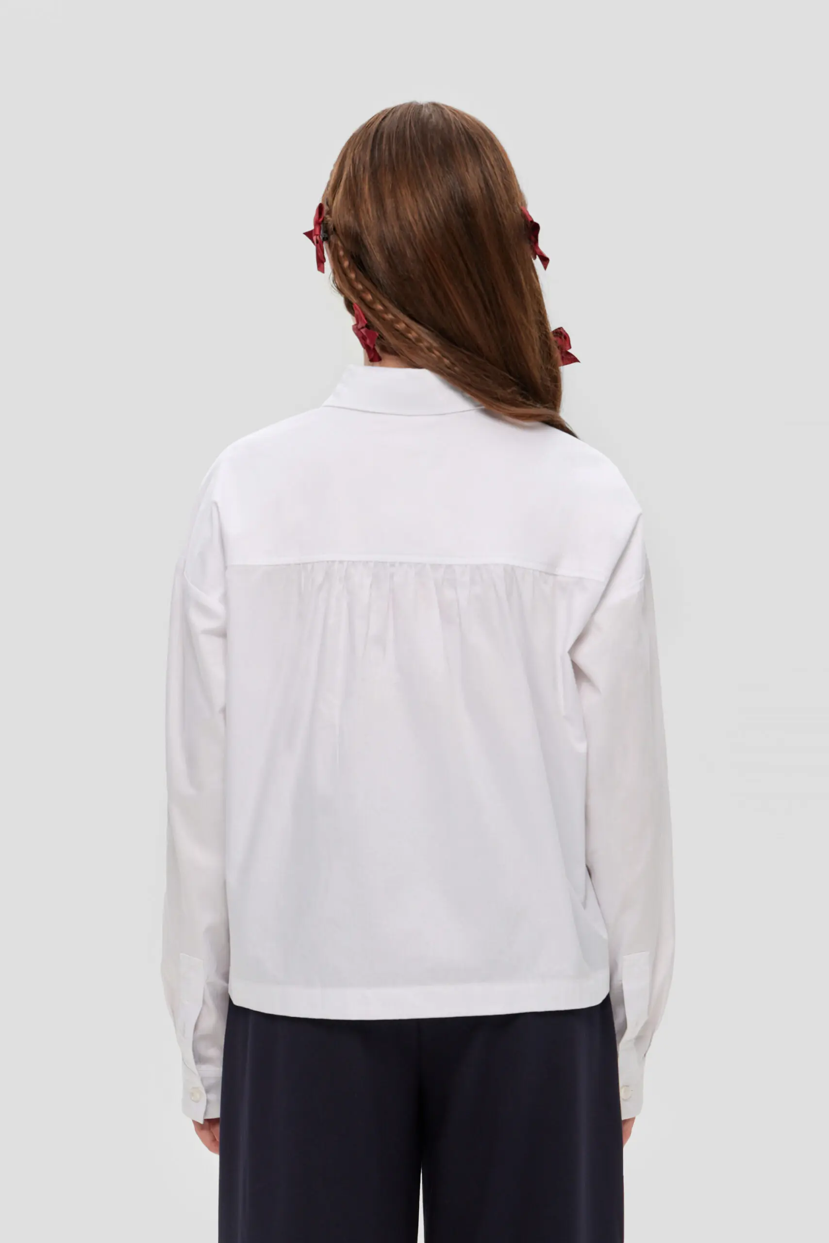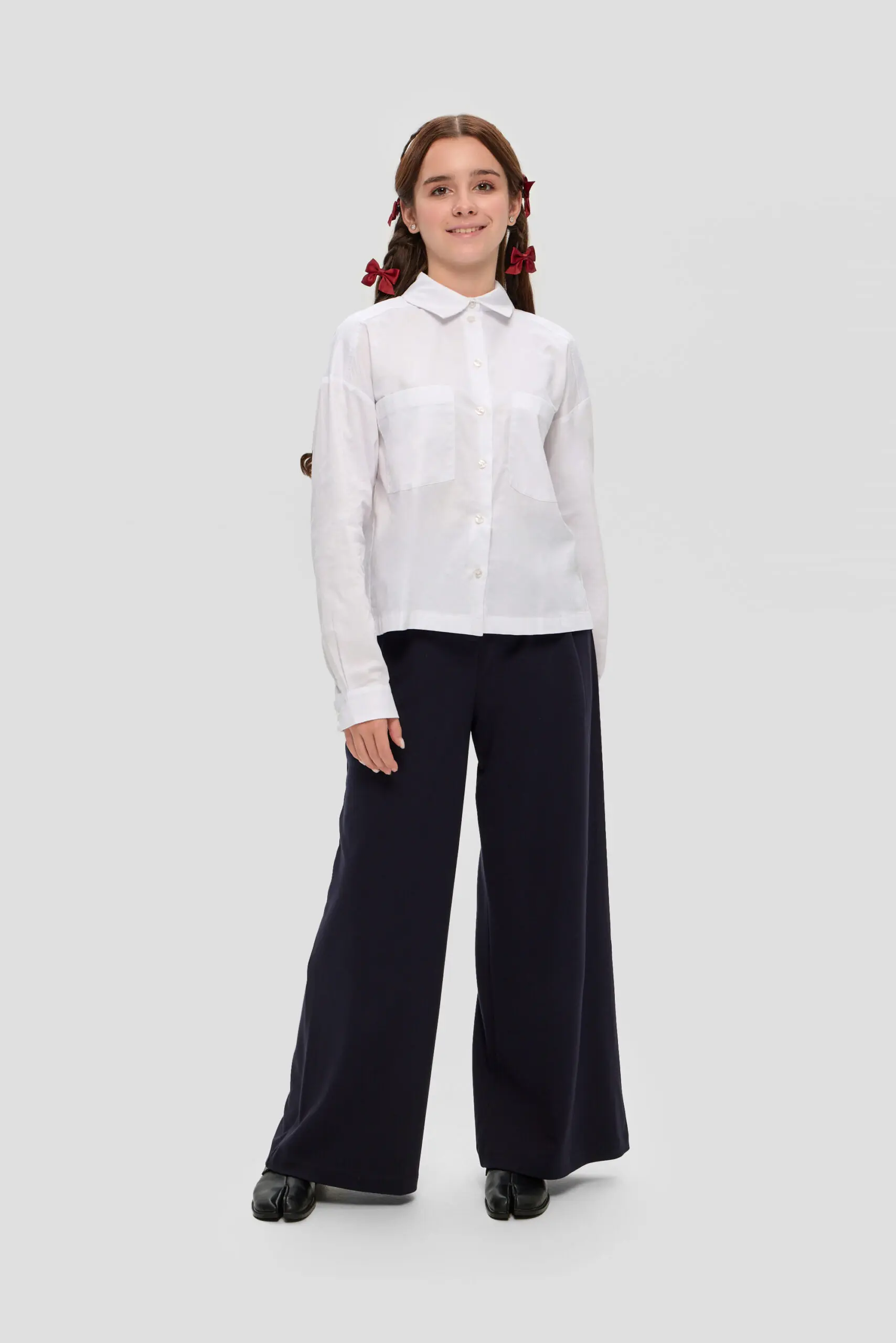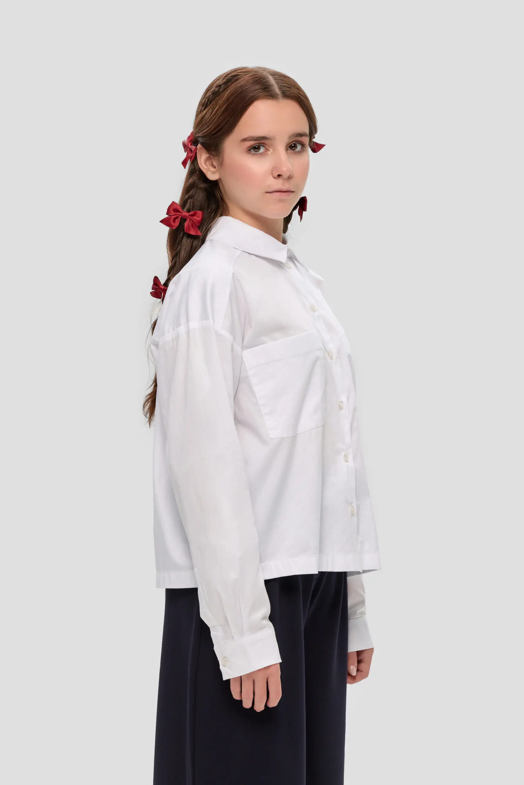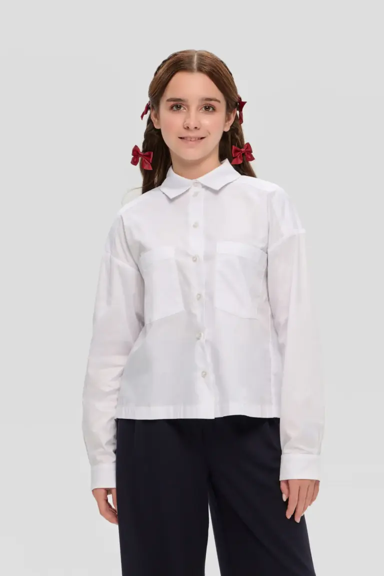 Хлопковая блуза белого цвета – обязательная вещь в школьном гардеробе девочке. Данная модель, имеющая удлиненный крой и созданная в духе мужской моды, характеризуется свободным фасоном. Длинные ... рукава завершаются манжетами. Классический отложной воротник и застежка на пуговицах, проходящая по всей длине изделия, добавляют выразительности. Накладные карманы придают блузе оригинальность, делая её не только удобной, но и модной. Блузу можно носить навыпуск, комбинируя с повседневной одеждой.