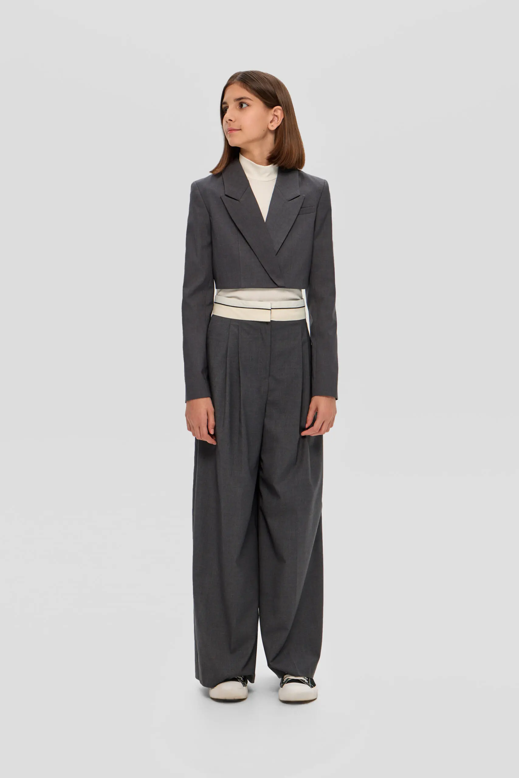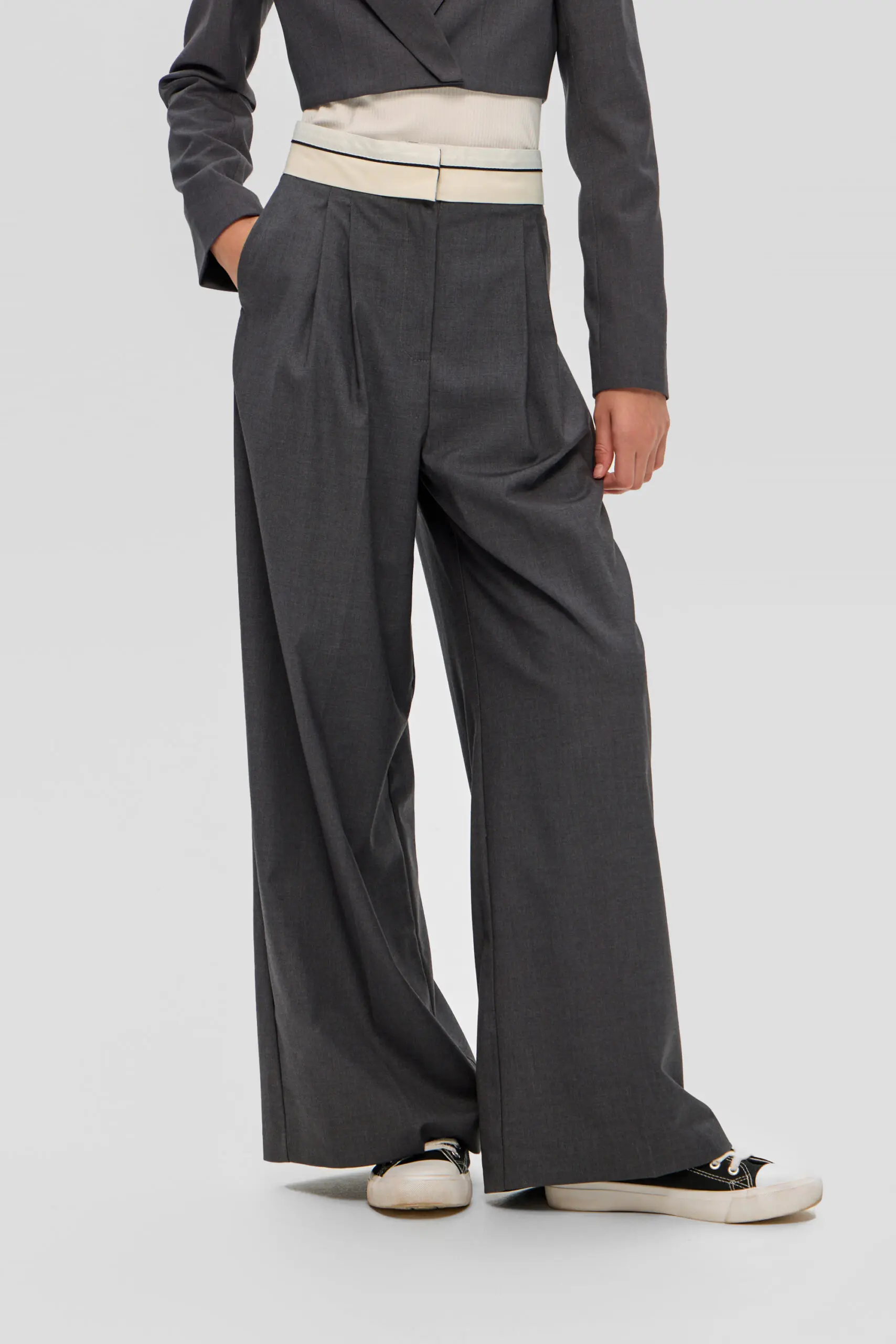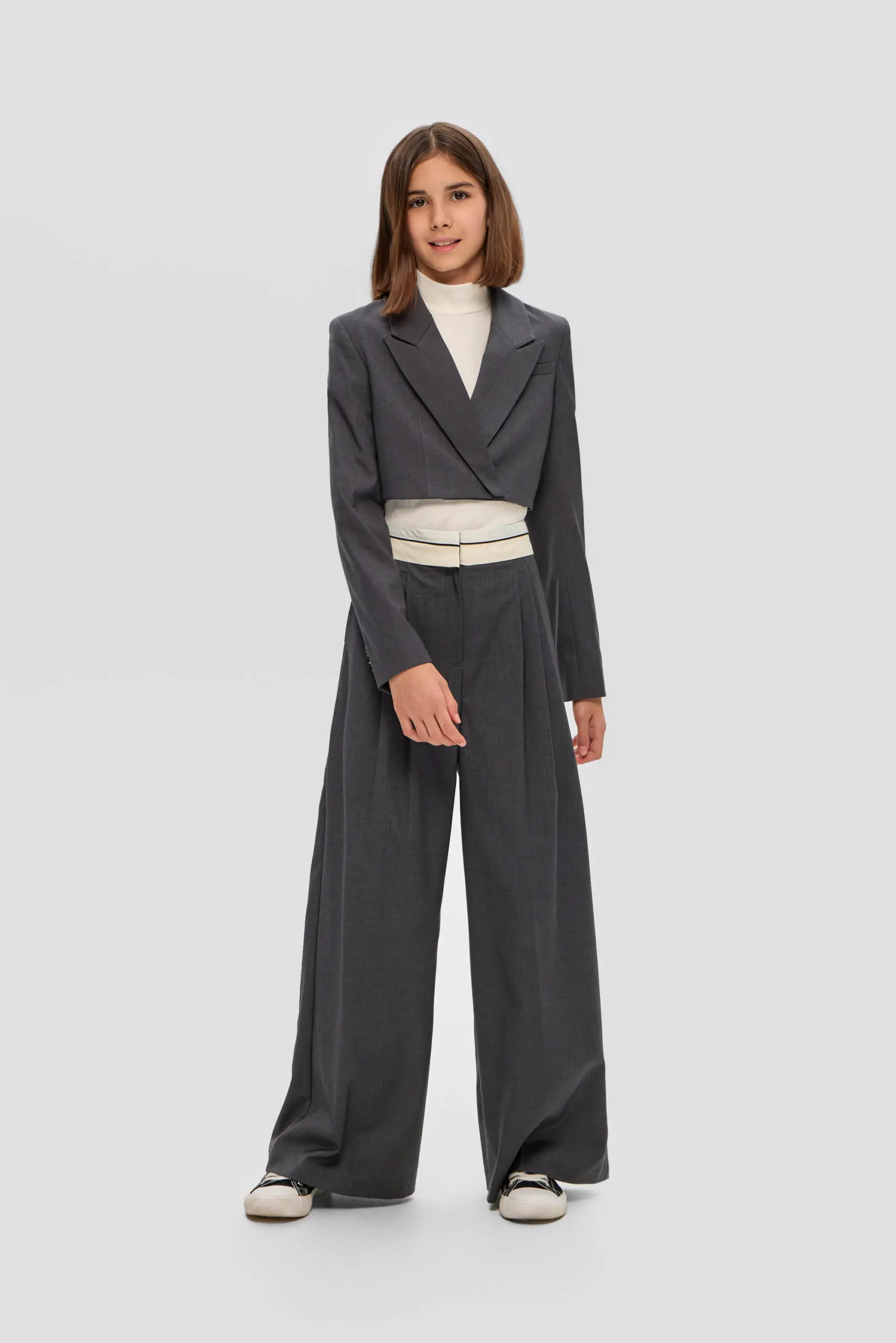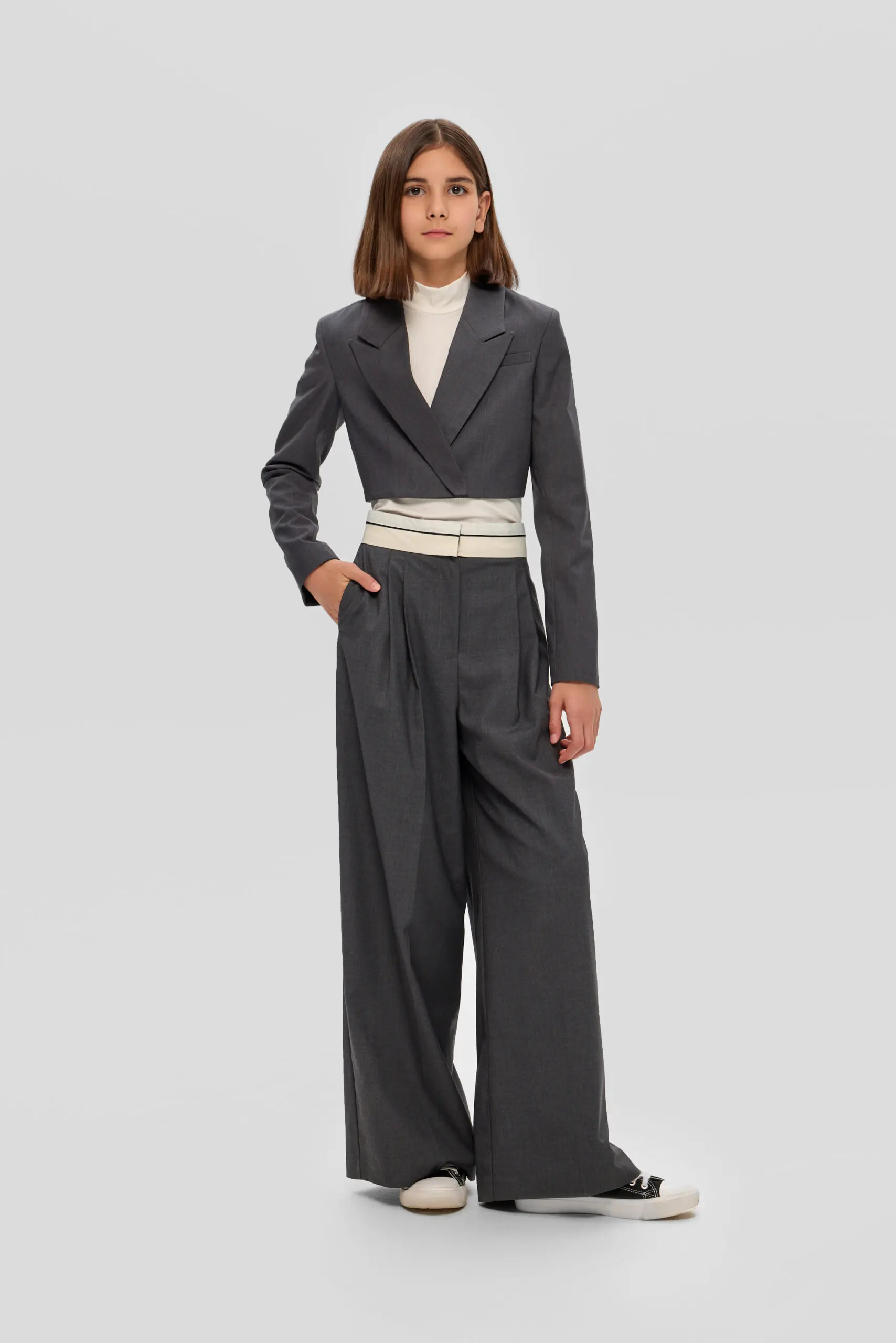 Для школьного гардероба девочки превосходным выбором станут широкие брюки с корсажным поясом, гарантирующие безупречный внешний вид и удобство. Серый цвет делает их универсальной вещью, без труда ... комбинируемой с блузами, рубашками и пиджаками, что открывает возможности для создания множества модных школьных ансамблей. Свободный силуэт брюк не сковывает движений, обеспечивая комфорт в течение всего дня занятий. Конструкции пояса уделено особое внимание: корсажный пояс подчеркивает линию талии обеспечивая надеждную фиксацию. Подкладка из вискозы создает приятные тактильные ощущения и обеспечивает ребенку максимальный комфорт на протяжении всего дня.