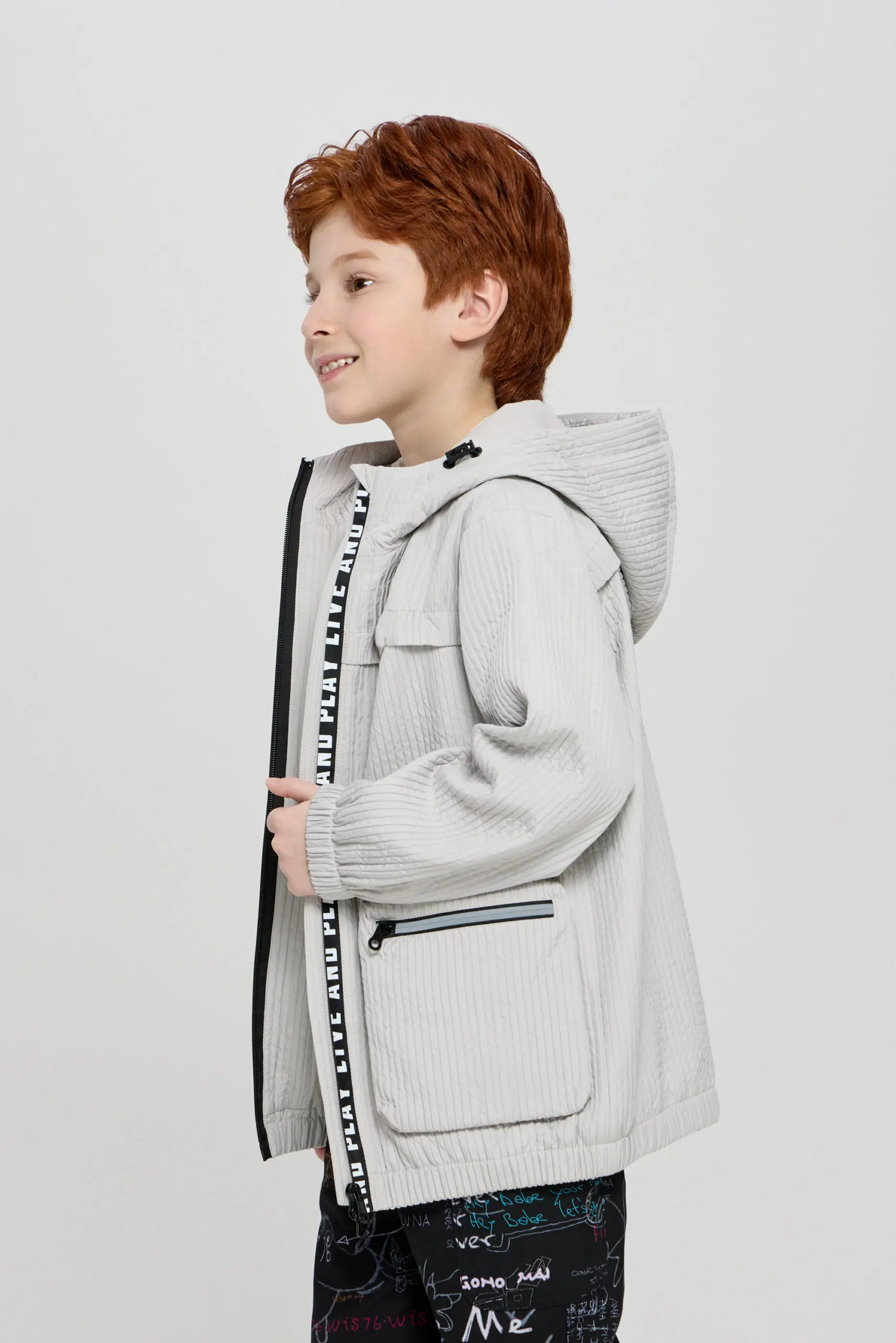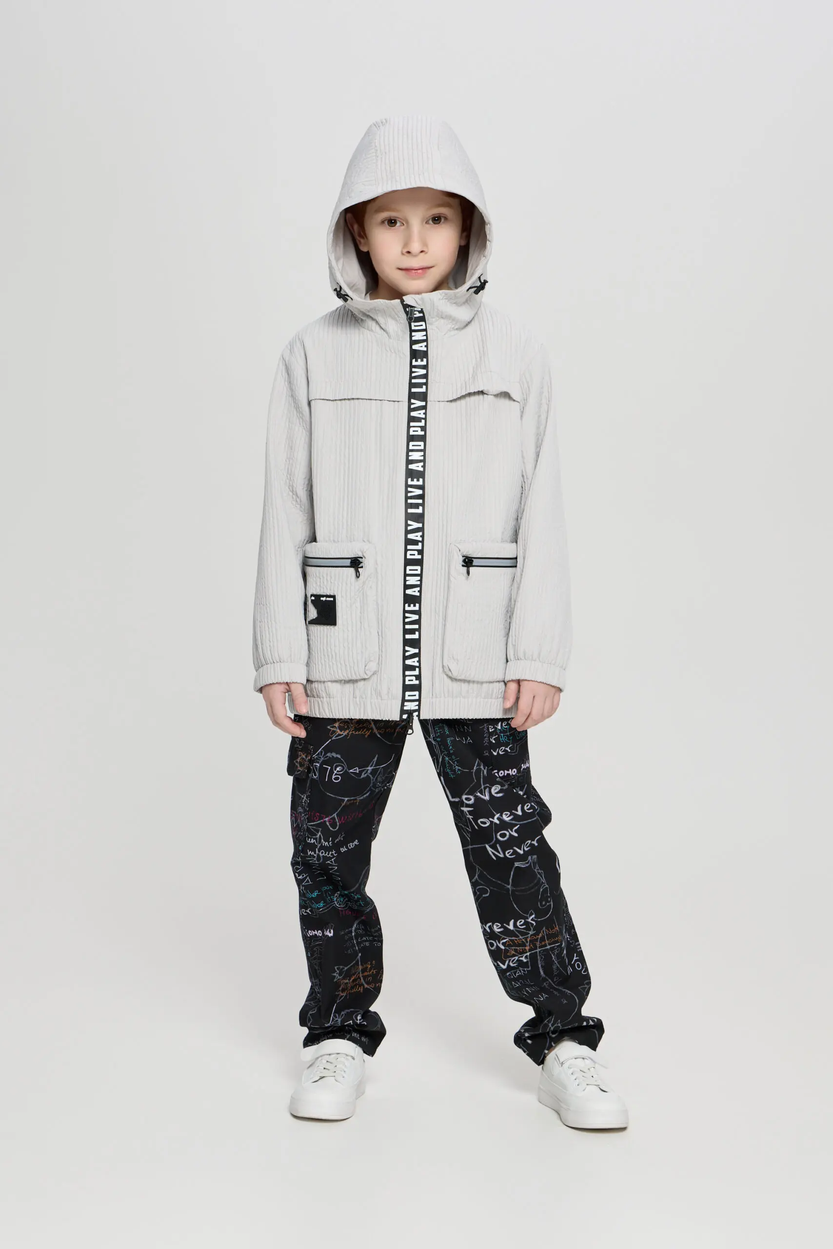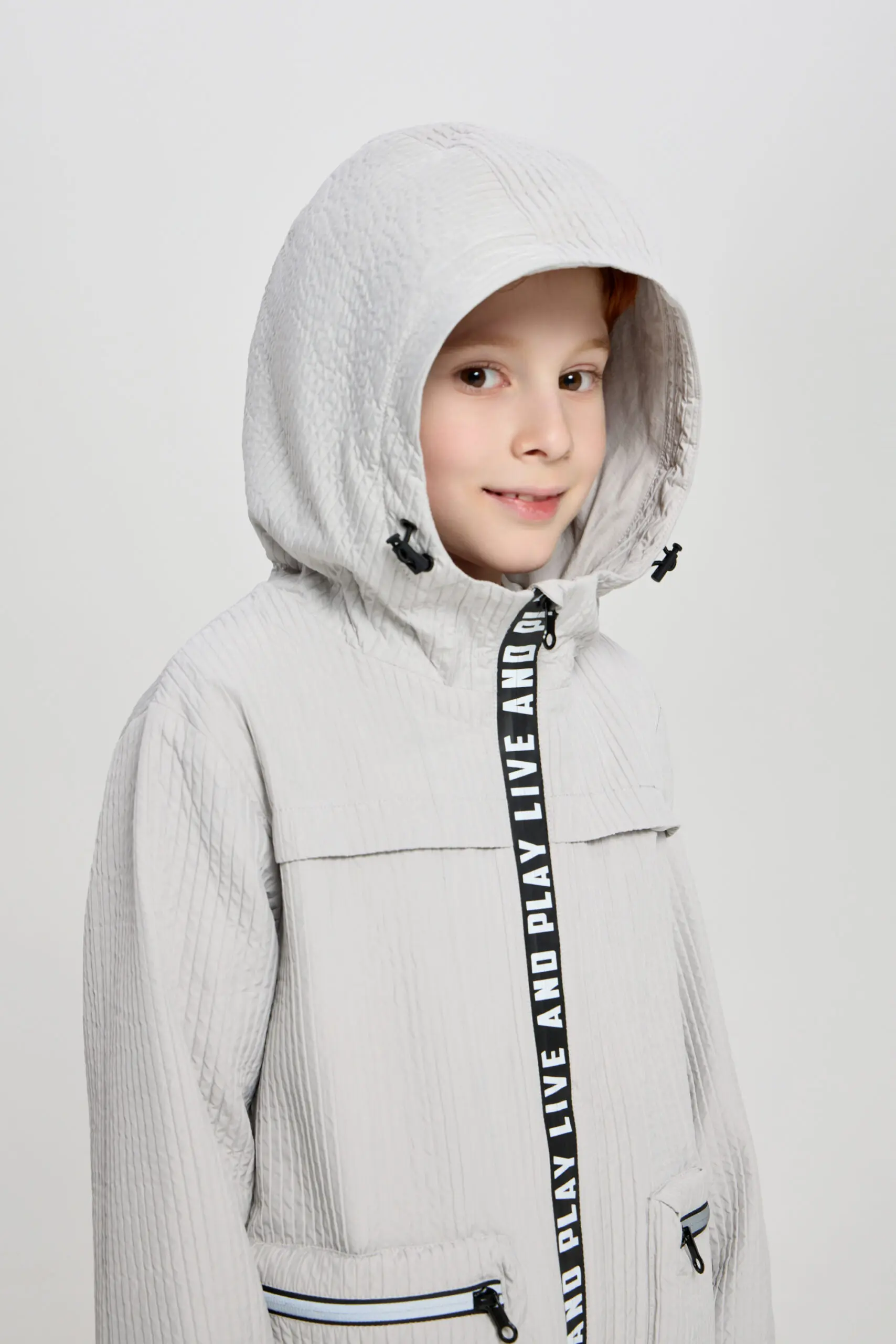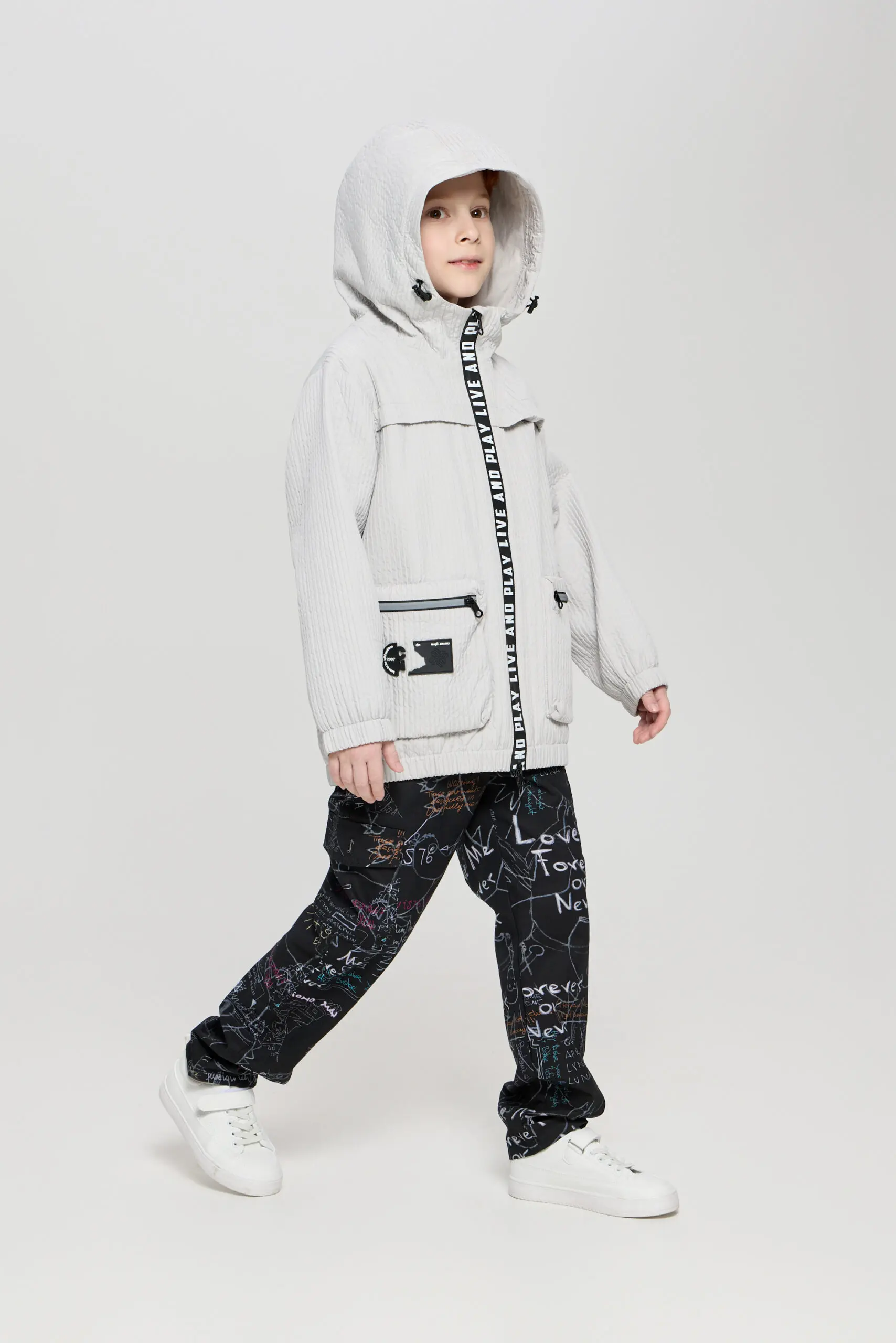 Дизайнерская ветровка для мальчика отлично подходит для прогулок, как в солнечную, так и дождливую погоду. Модель удобного кроя с подкладкой из вискозы и хлопка . Стильная ... легкая куртка изготовлена из ткани светло-серого цвета и дополнена капюшоном. Отделка − контрастная молния на карманах и дизайнерский декор. Интересную нотку образу добавляет оригинальная застёжка с текстовым принтом.