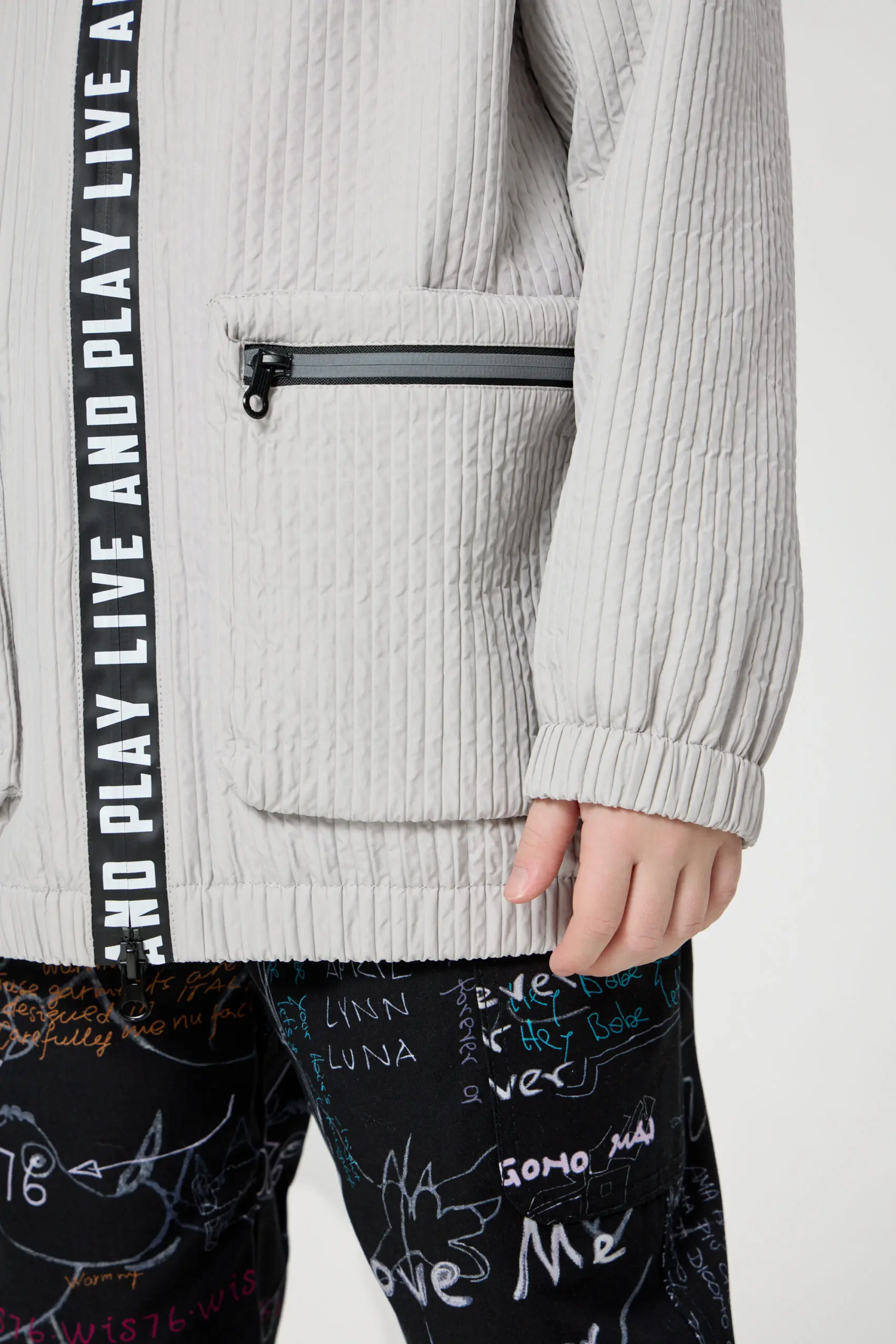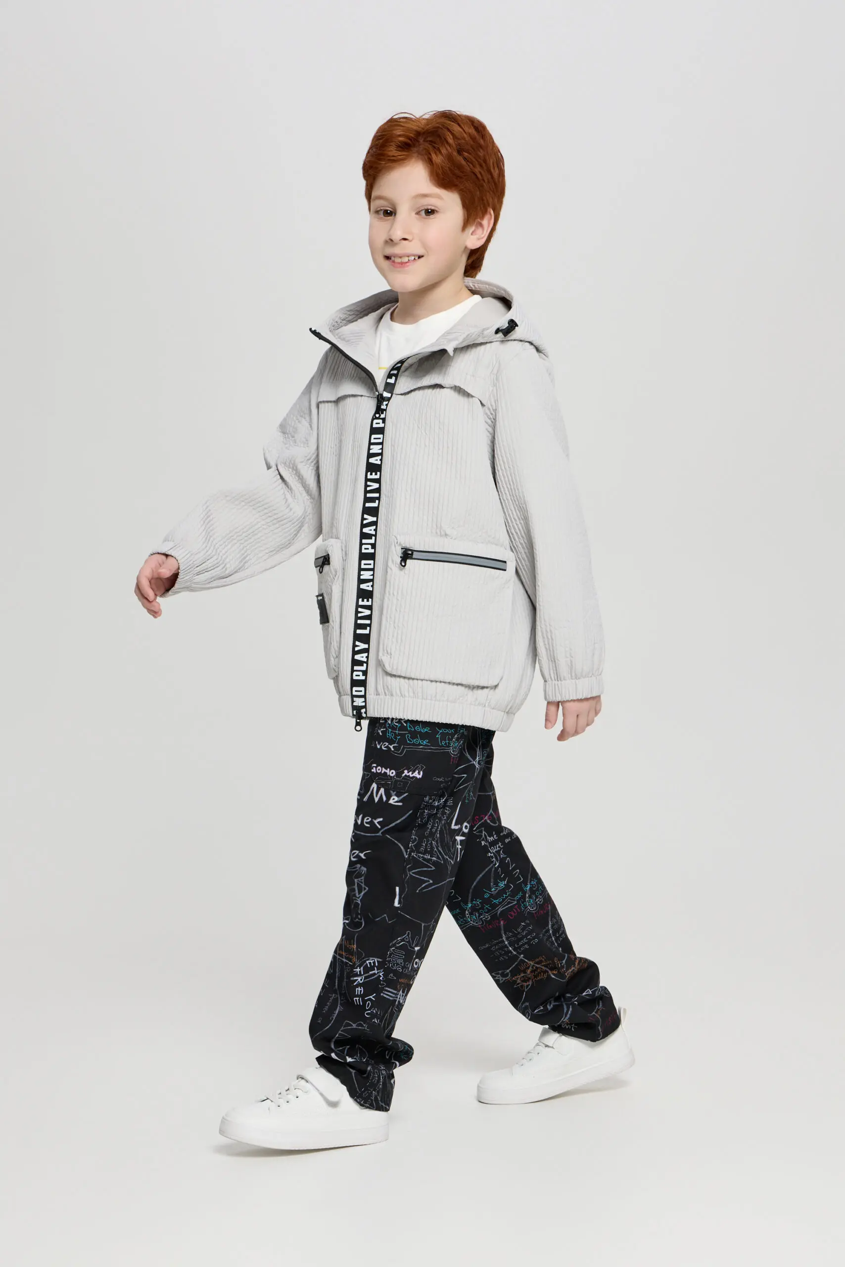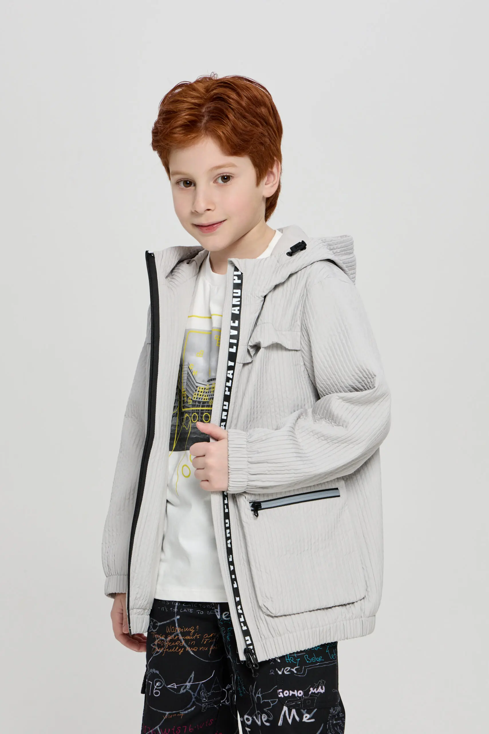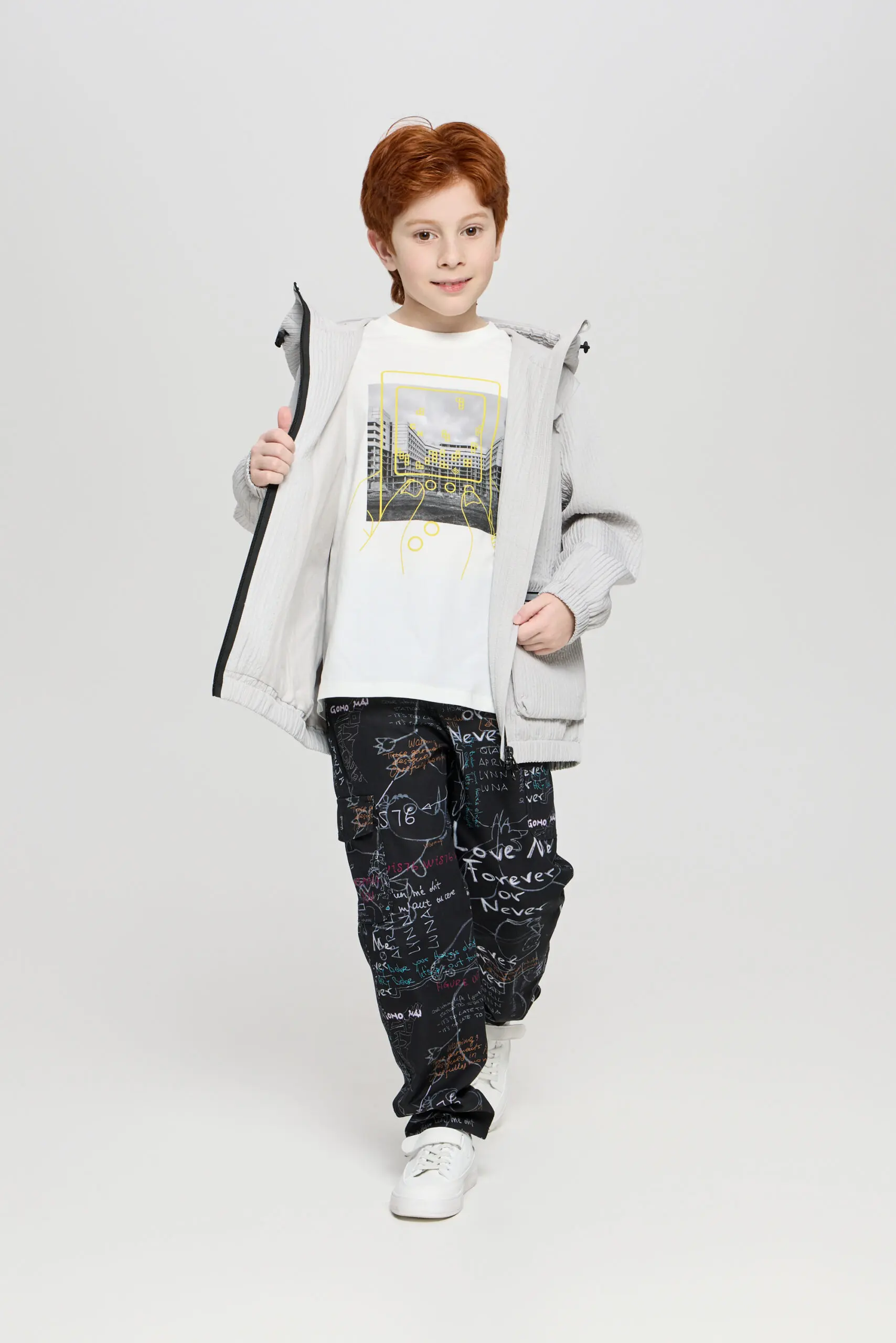 Дизайнерская ветровка для мальчика отлично подходит для прогулок, как в солнечную, так и дождливую погоду. Модель удобного кроя с подкладкой из вискозы и хлопка . Стильная ... легкая куртка изготовлена из ткани светло-серого цвета и дополнена капюшоном. Отделка − контрастная молния на карманах и дизайнерский декор. Интересную нотку образу добавляет оригинальная застёжка с текстовым принтом.