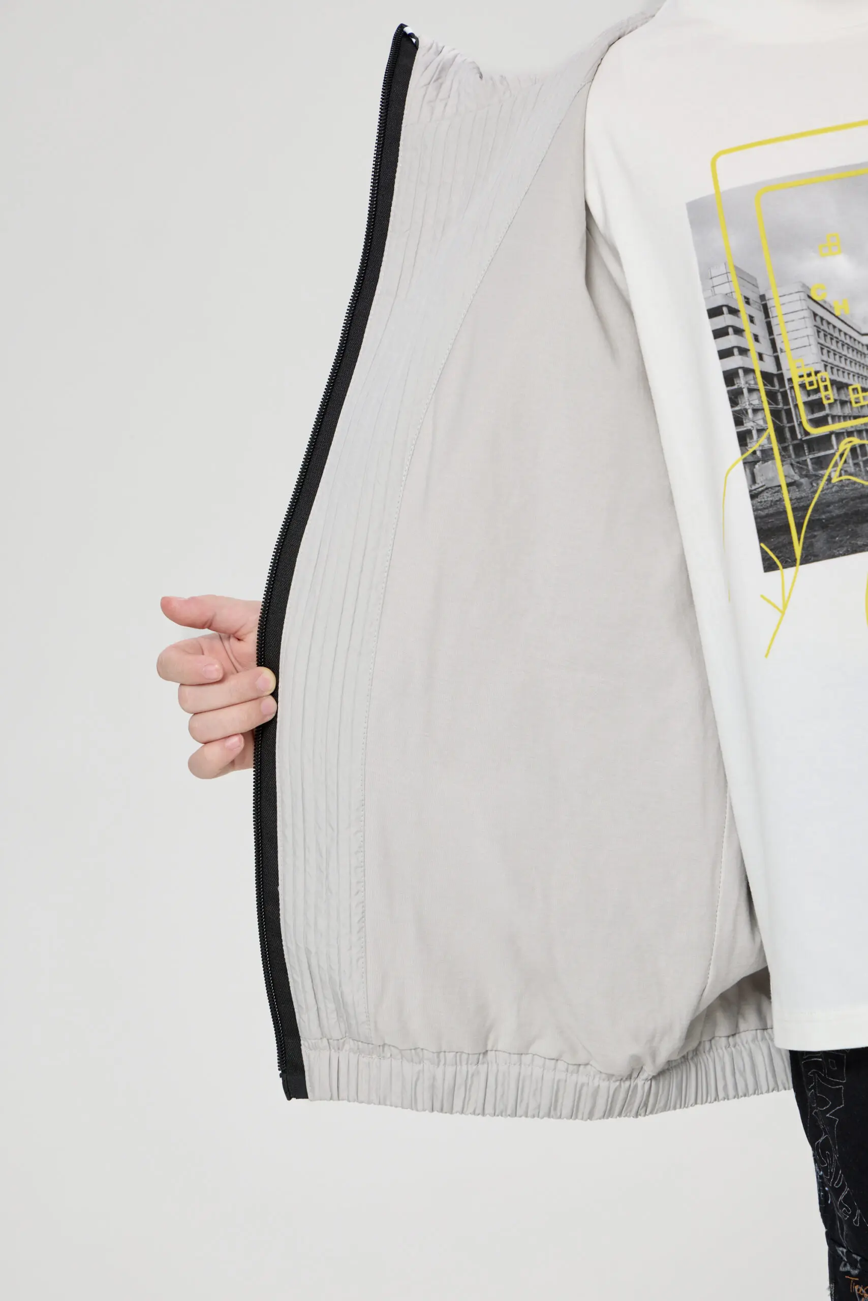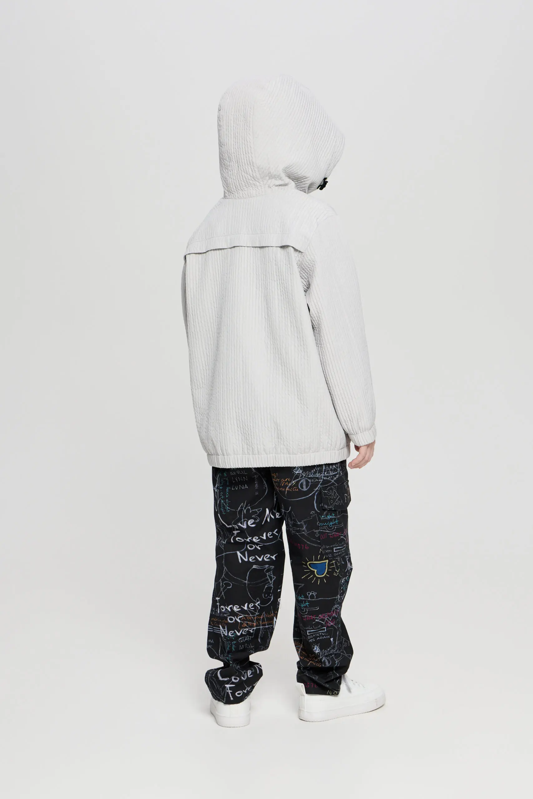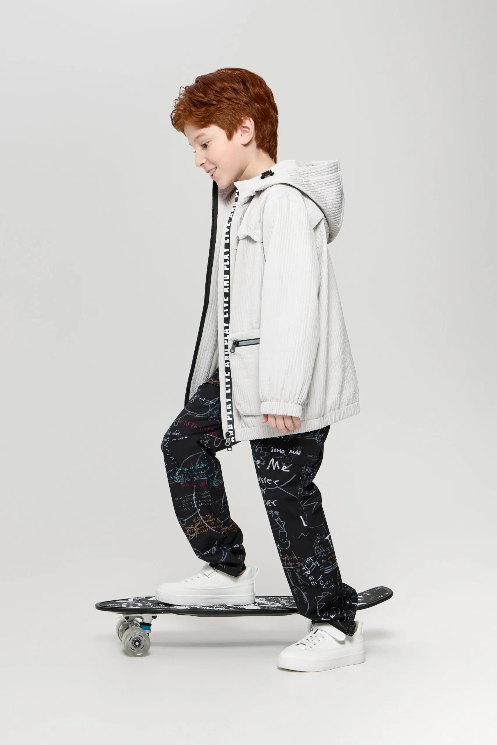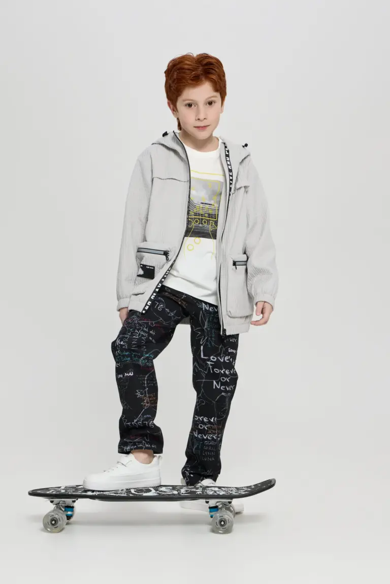 Дизайнерская ветровка для мальчика отлично подходит для прогулок, как в солнечную, так и дождливую погоду. Модель удобного кроя с подкладкой из вискозы и хлопка . Стильная ... легкая куртка изготовлена из ткани светло-серого цвета и дополнена капюшоном. Отделка − контрастная молния на карманах и дизайнерский декор. Интересную нотку образу добавляет оригинальная застёжка с текстовым принтом.