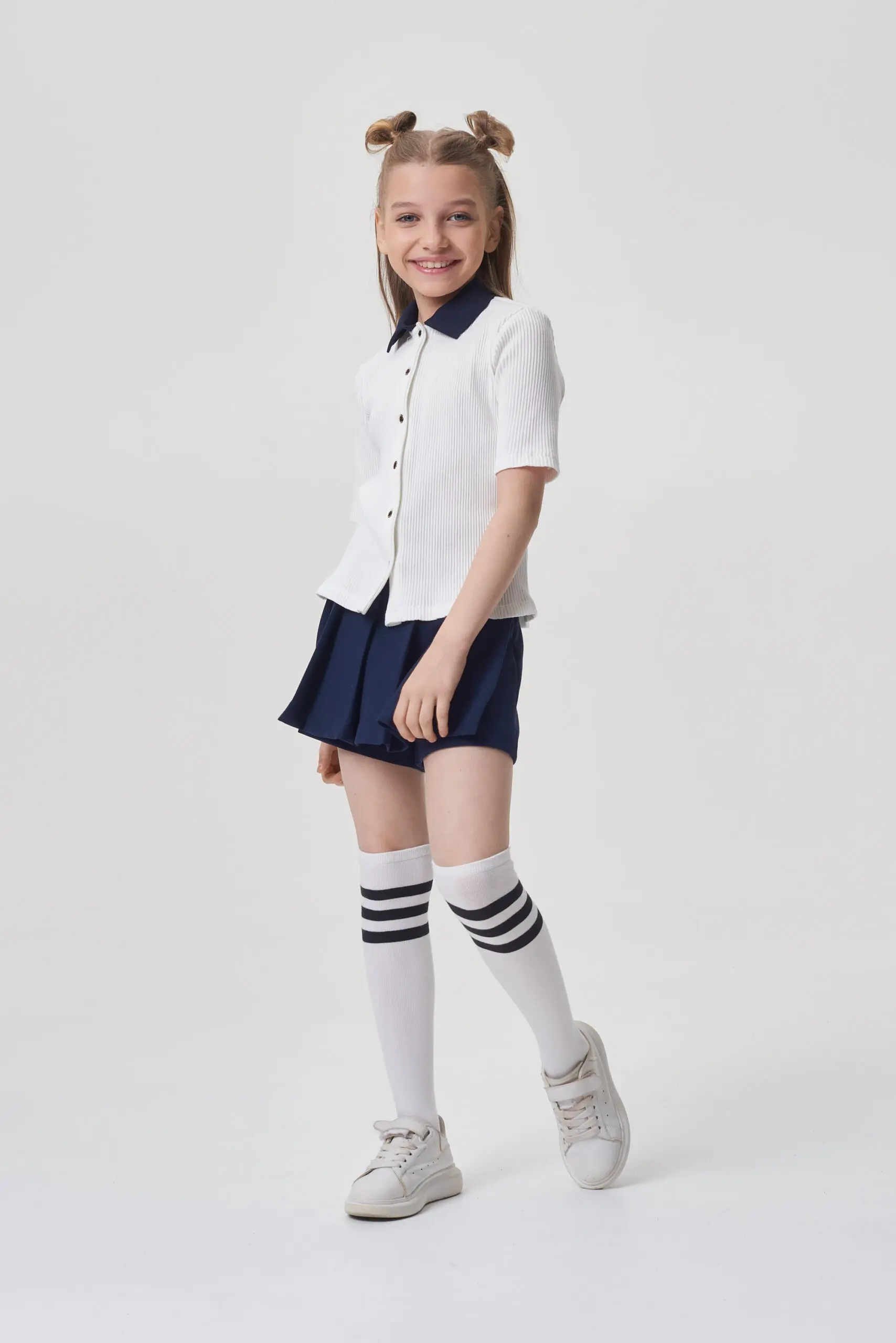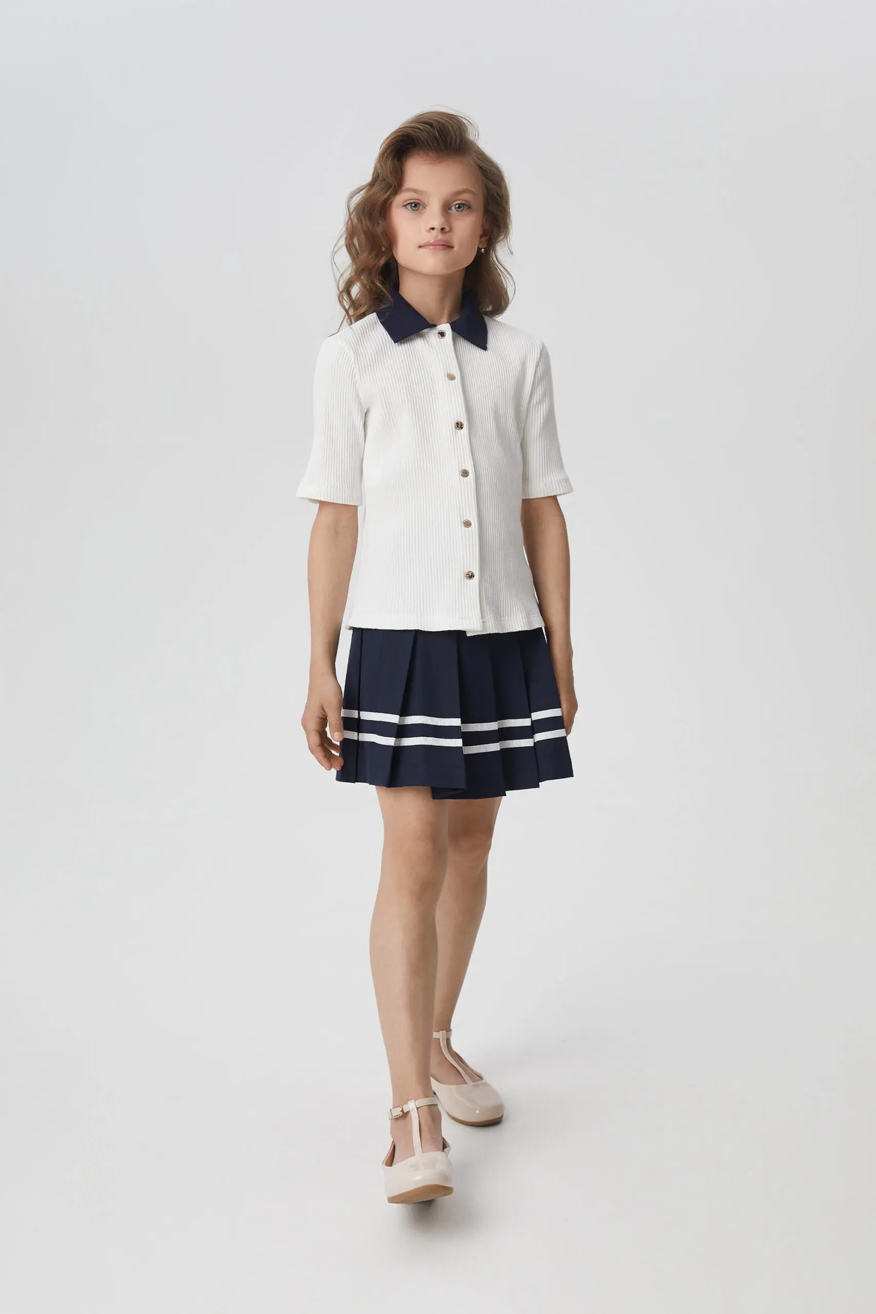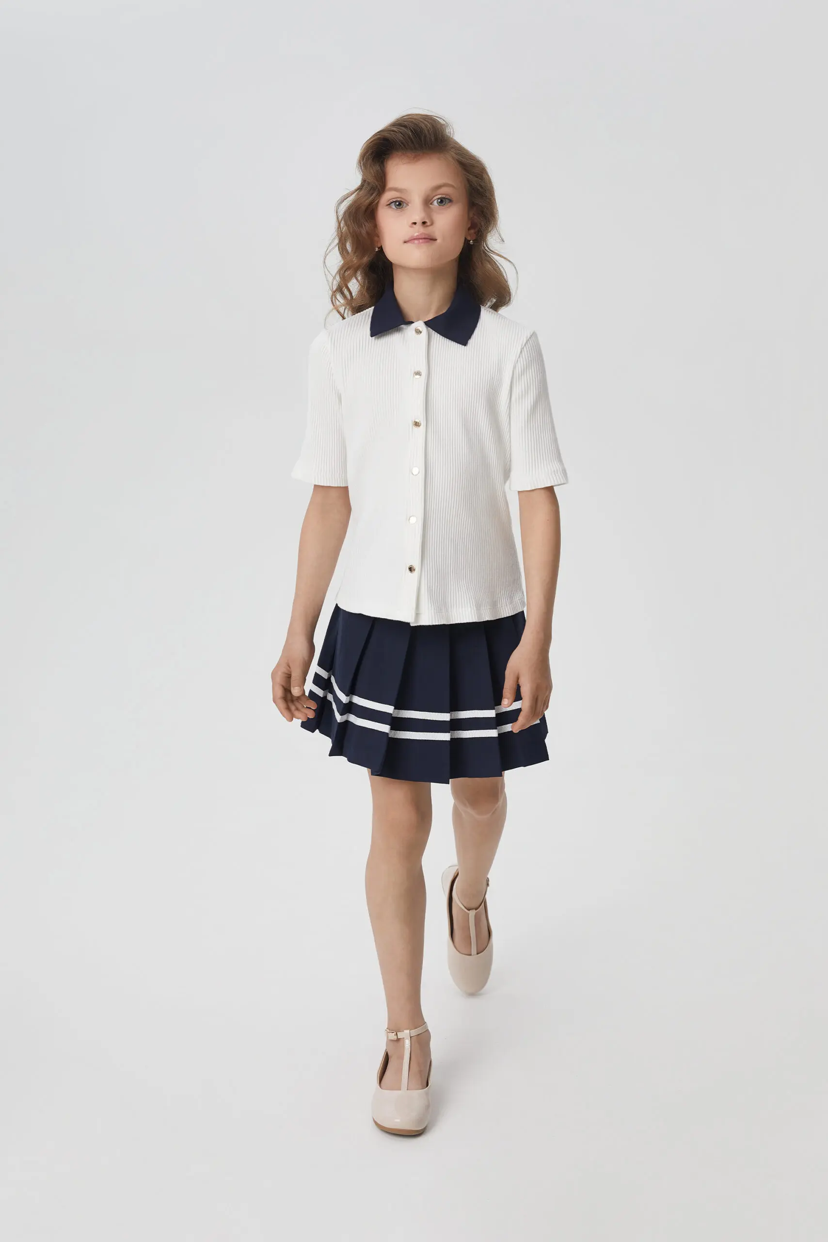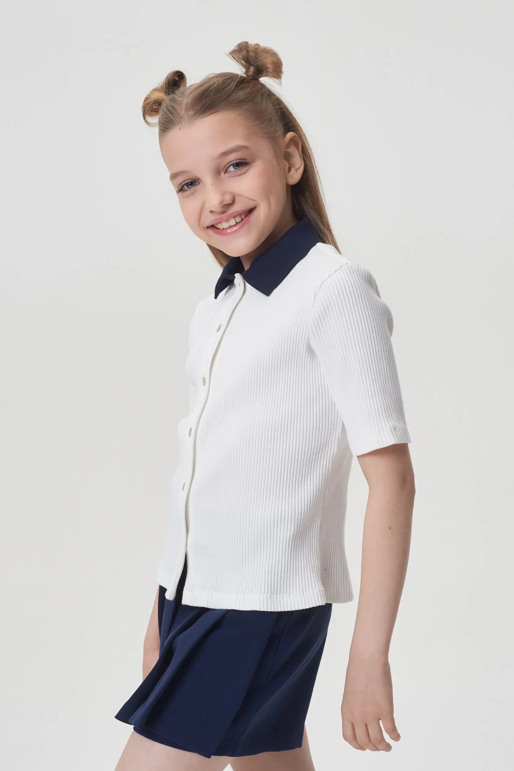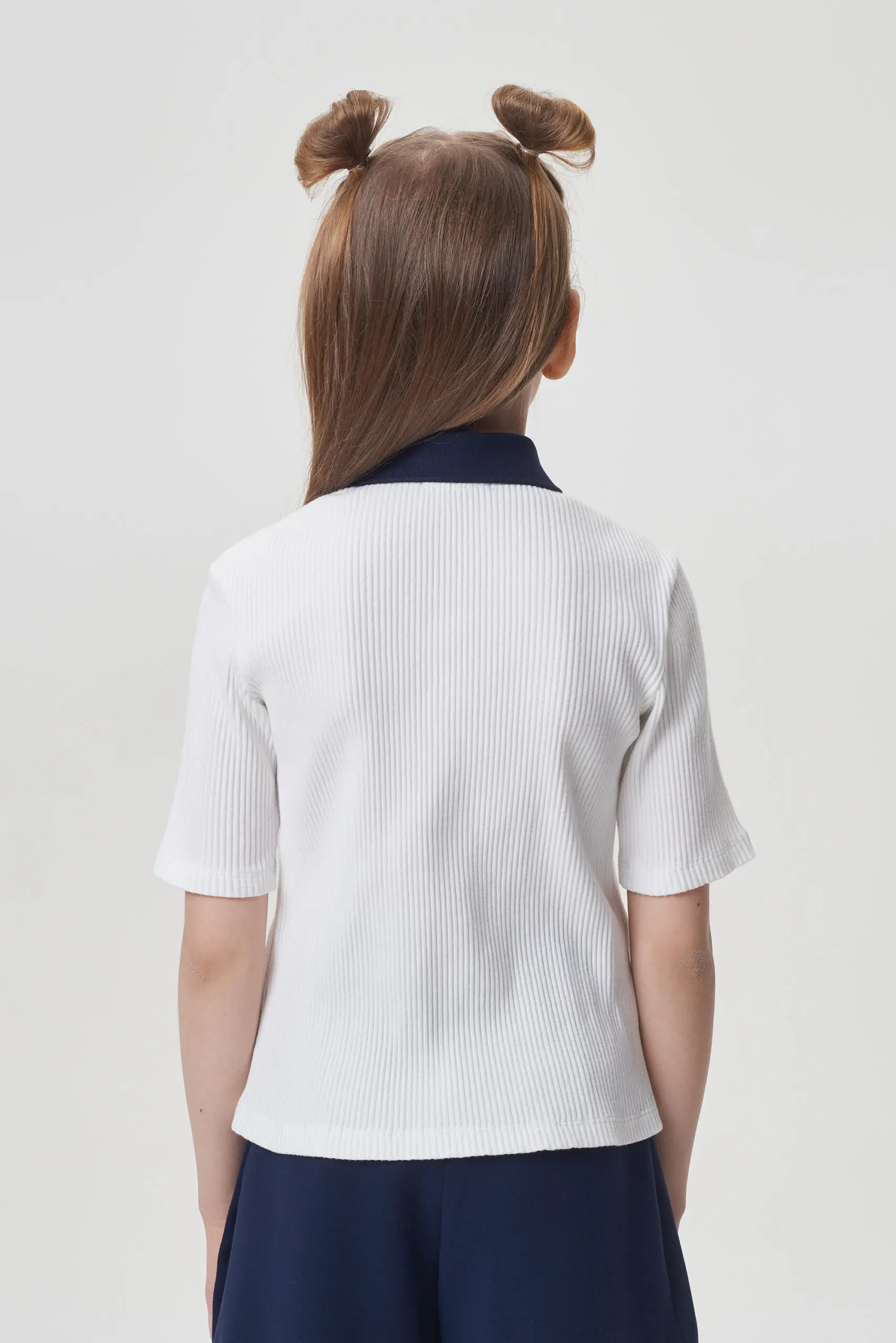 Трикотажная блузка для школы – отличная замена традиционной. Лаконичный внешний вид делает её незаменимой вещью для ежедневного гардероба девочки. Высокое содержание хлопка – 95%. Эластан в ... составе ткани облегчает уход за изделием и обеспечивает превосходное сохранение формы. Современный крой, укороченные рукава, контрастный воротник поло, практичная застёжка на пуговицы делают ее особенно привлекательной. Трикотажная блузка идеально сочетается с классическими юбками и брюками. Прекрасно гармонирует с жакетами и пиджаками.