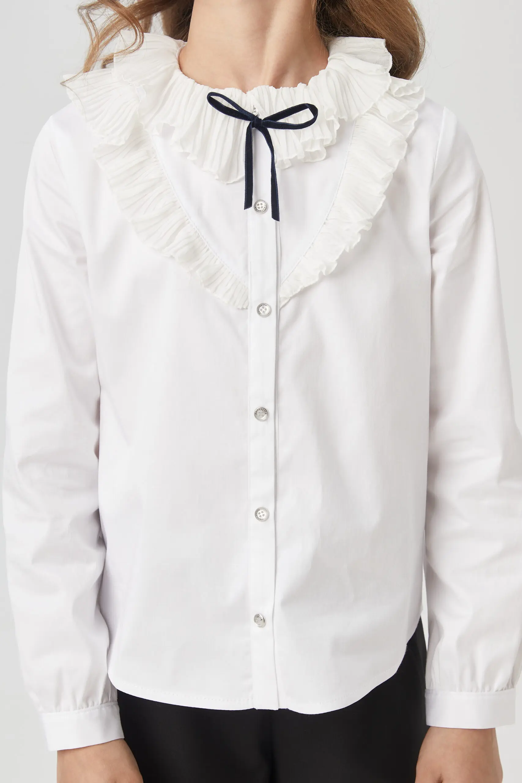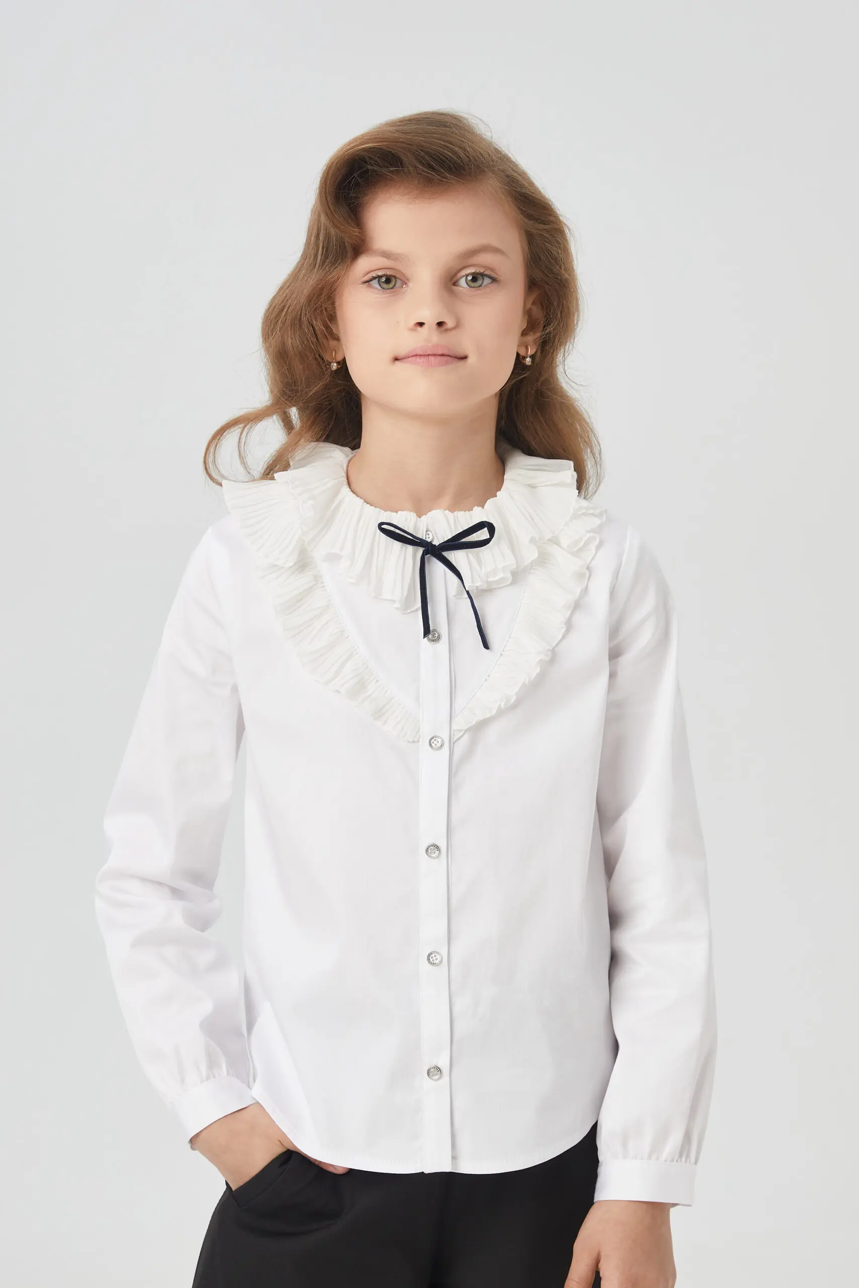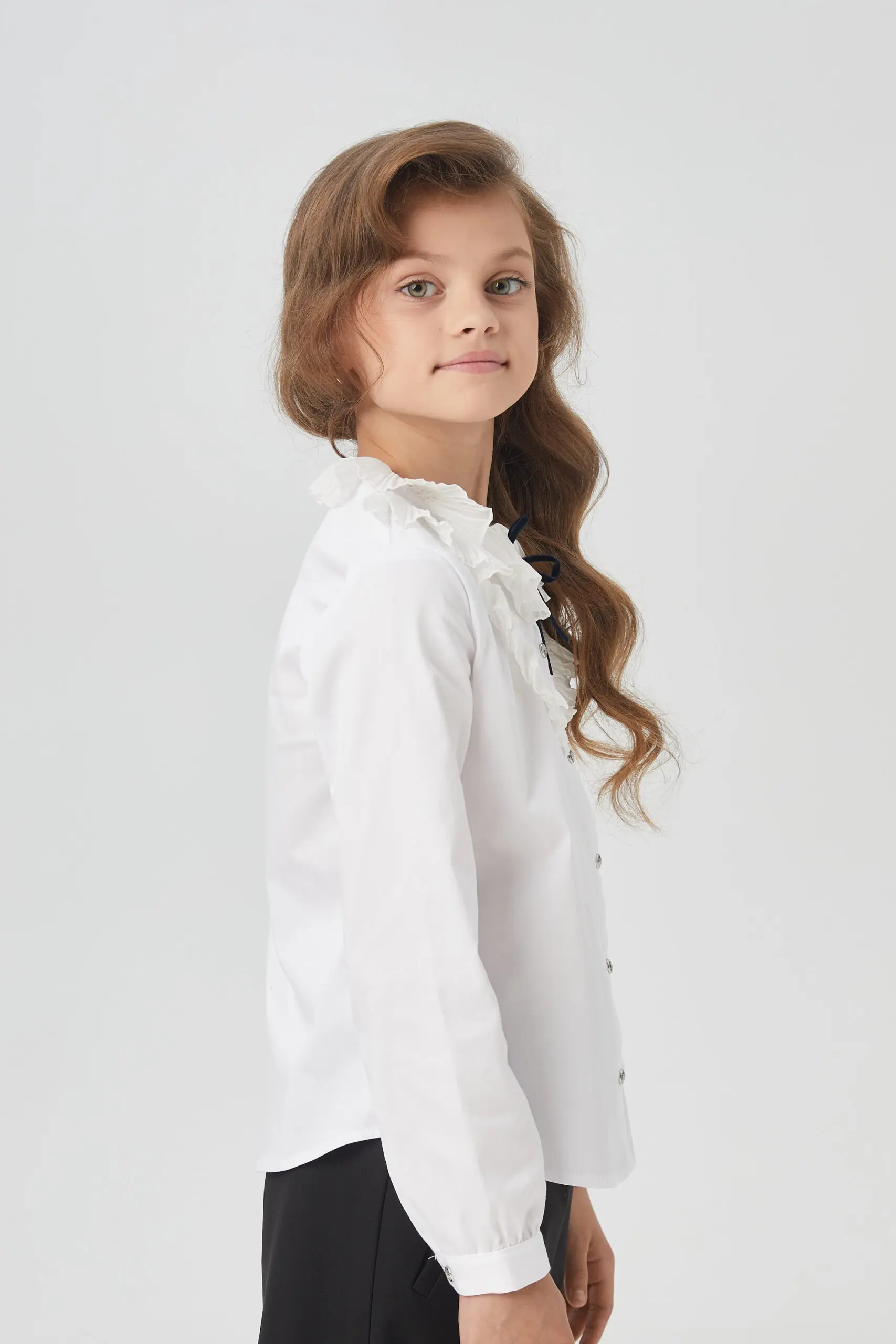 Элегантная блузка для девочки – комфортный и функциональный вариант для школьного комплекта одежды. Эта изысканная блузка изготовлена из ткани, в составе которой преобладает хлопок. Модель имеет ... прямой силуэт и украшена рюшами в области груди. Круглый вырез горловины декорирован изящными воланами. Рукава с манжетами имеют свободный фасон, не стесняющий движений. Нарядная блузка с воланами станет отличным выбором для девочки на 1 сентября, на последний звонок или на любой другое торжественное мероприятие.