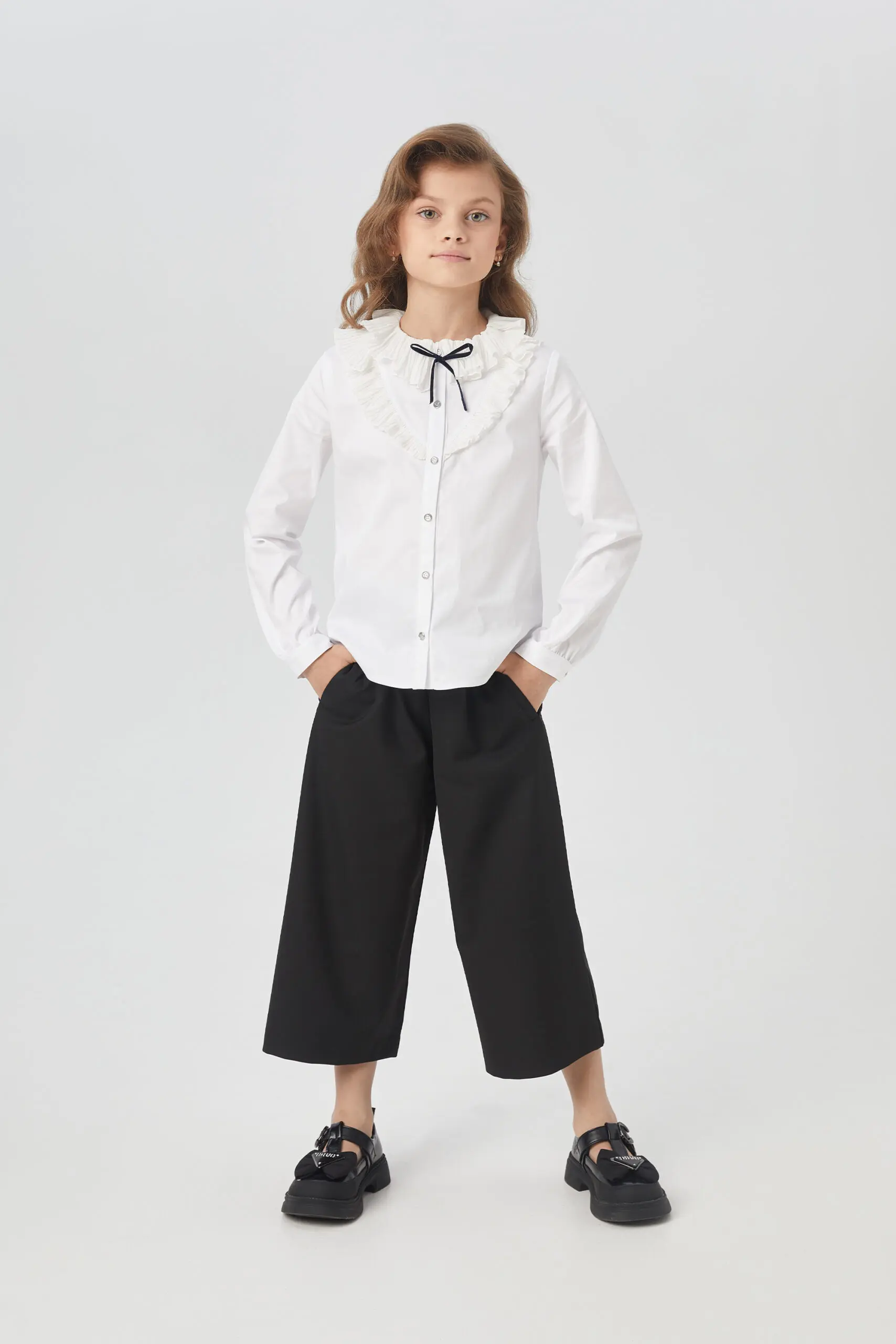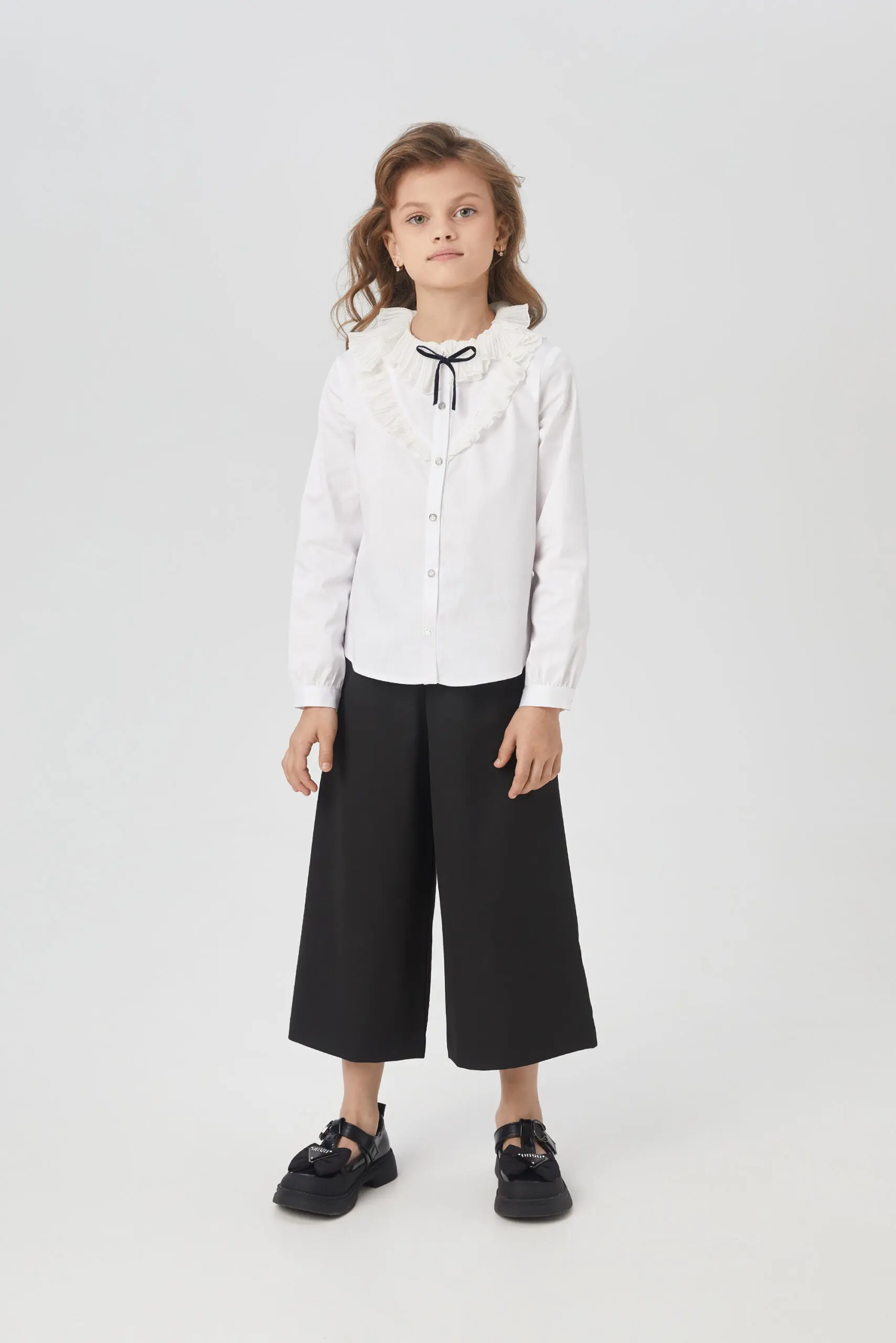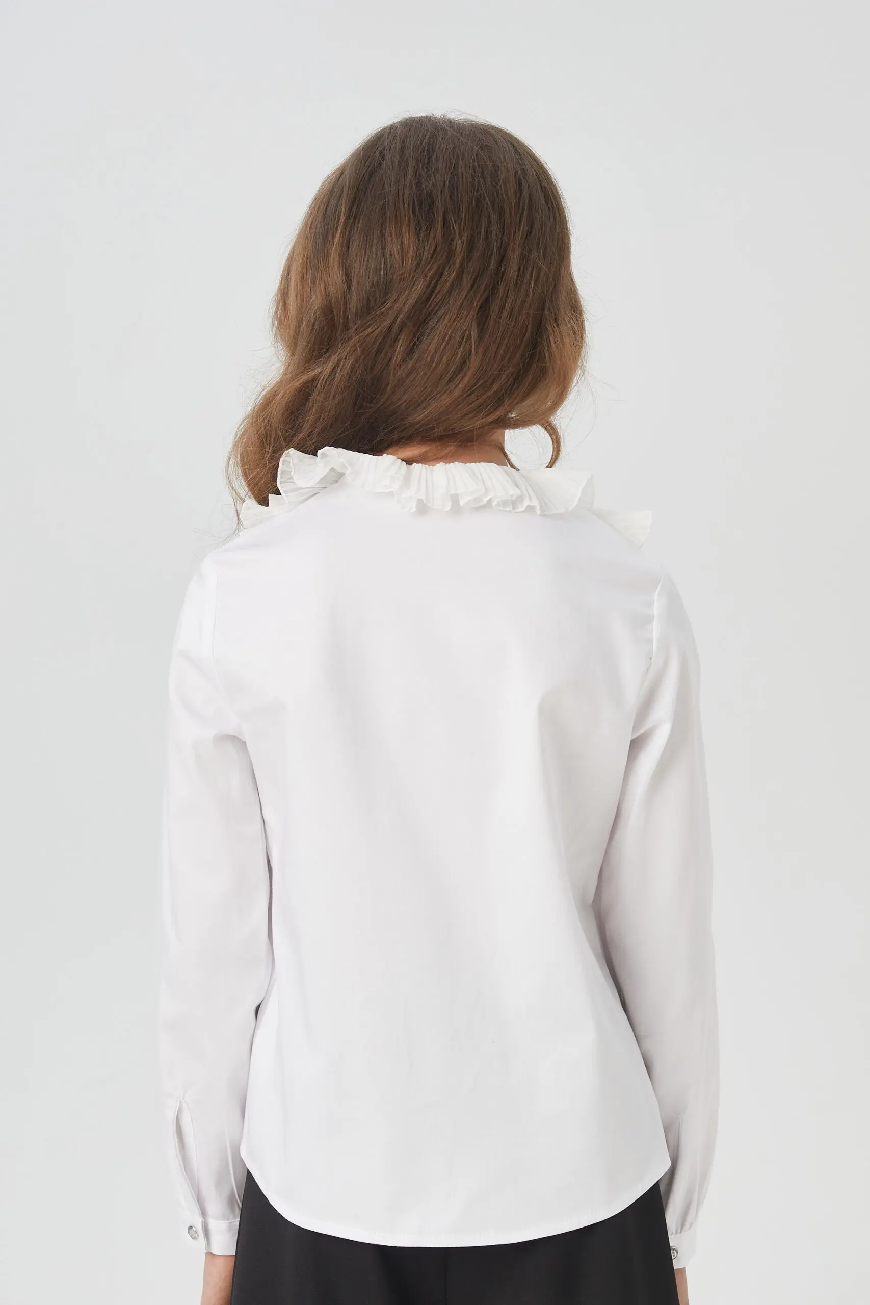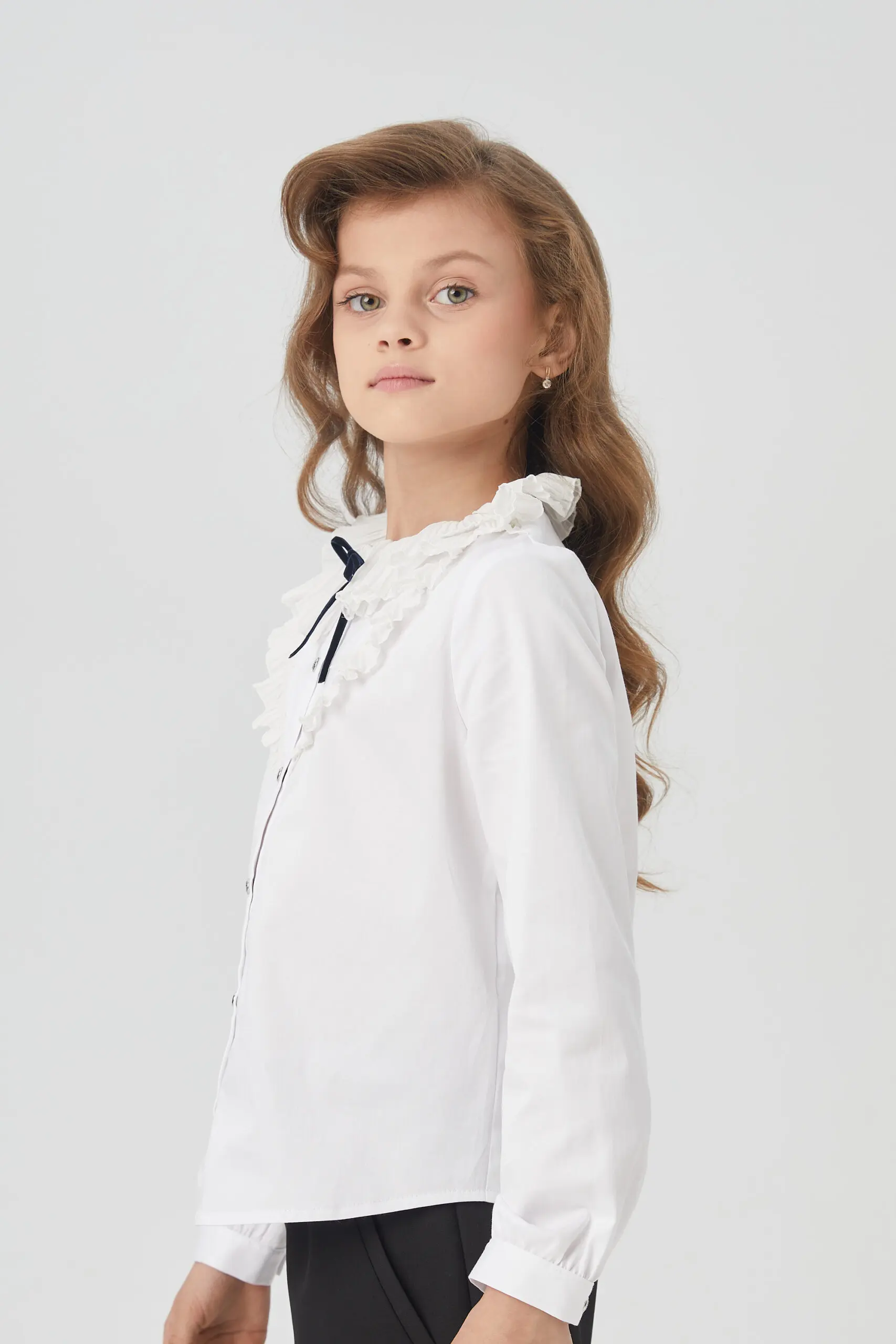 Элегантная блузка для девочки – комфортный и функциональный вариант для школьного комплекта одежды. Эта изысканная блузка изготовлена из ткани, в составе которой преобладает хлопок. Модель имеет ... прямой силуэт и украшена рюшами в области груди. Круглый вырез горловины декорирован изящными воланами. Рукава с манжетами имеют свободный фасон, не стесняющий движений. Нарядная блузка с воланами станет отличным выбором для девочки на 1 сентября, на последний звонок или на любой другое торжественное мероприятие.