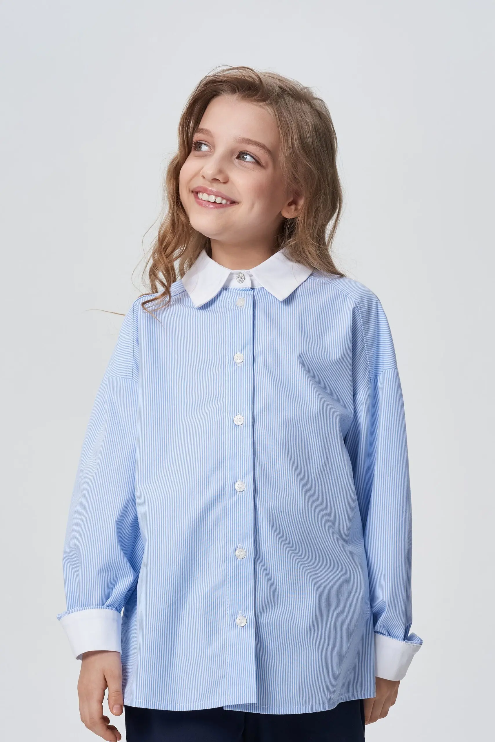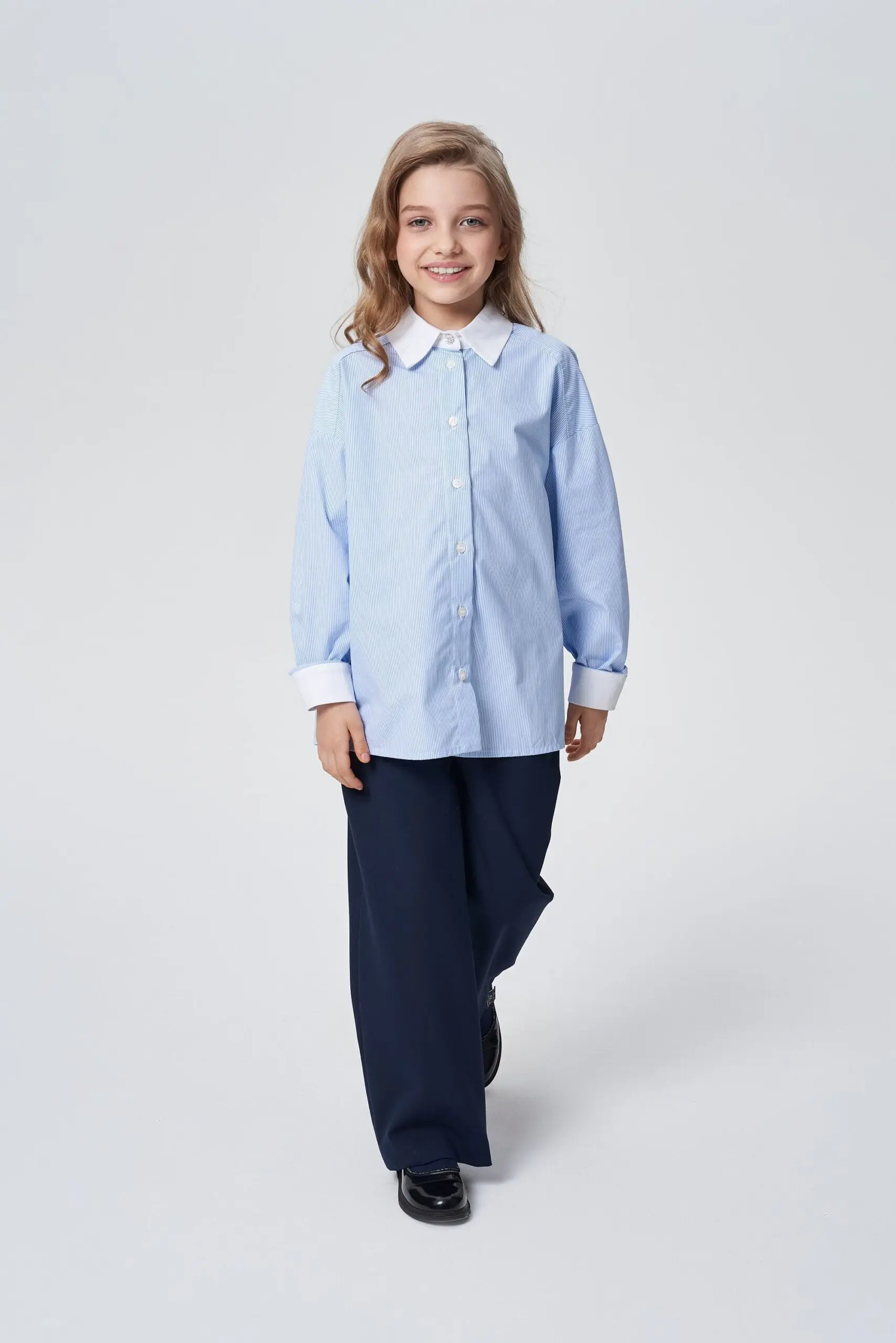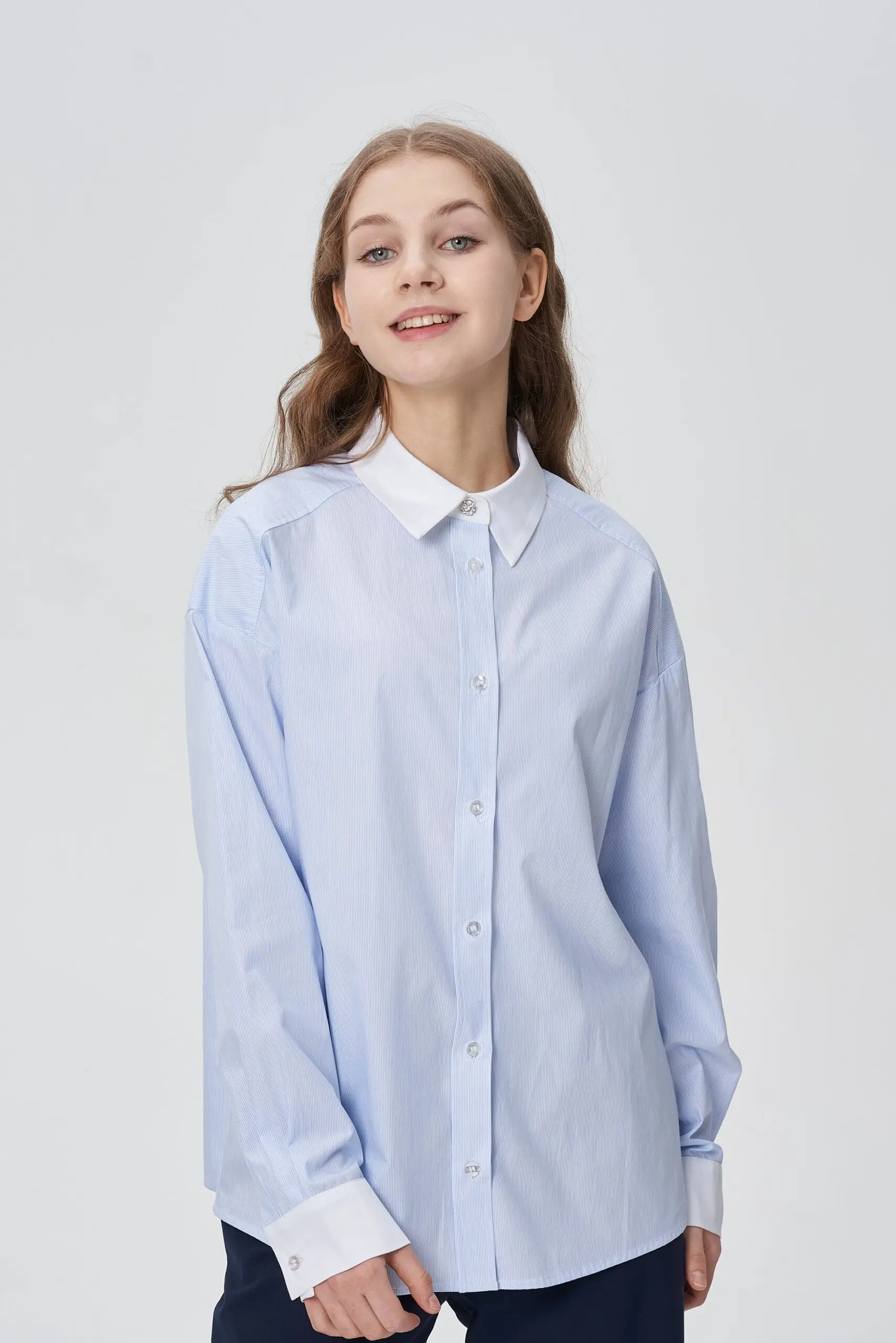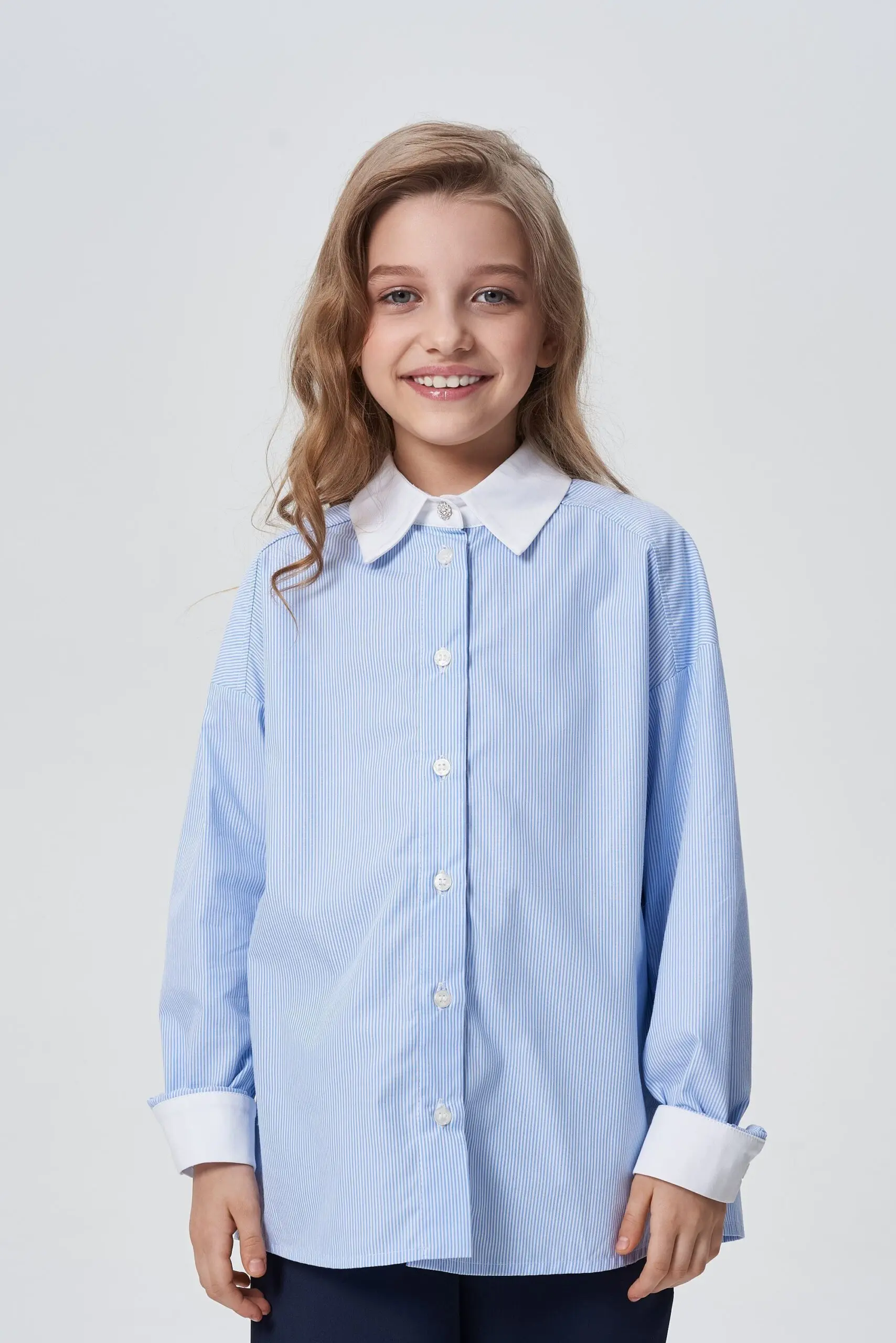 Замечательная хлопковая блузка светло-голубого оттенка будет базовым предметом гардероба школьницы.