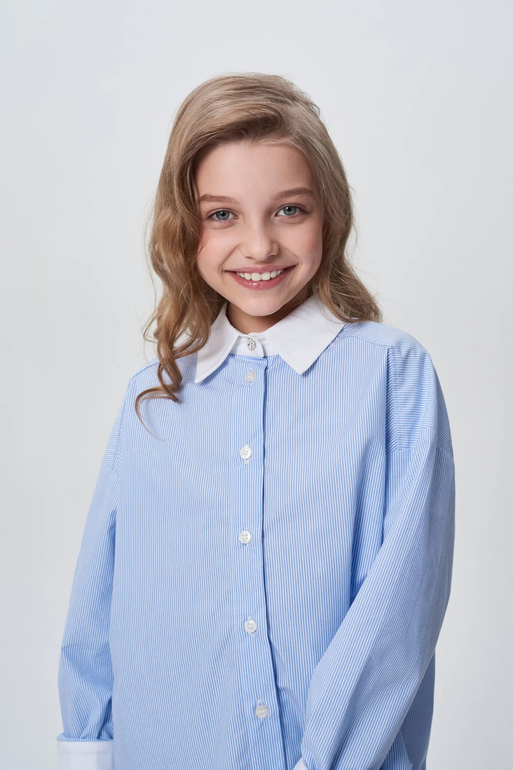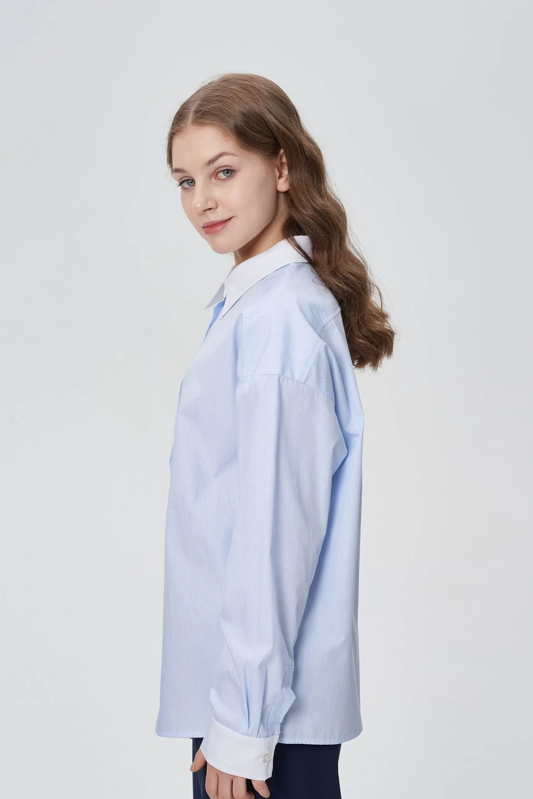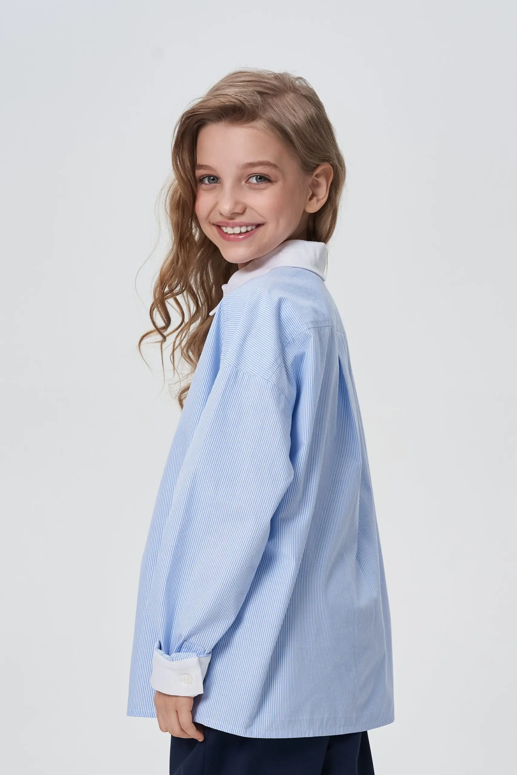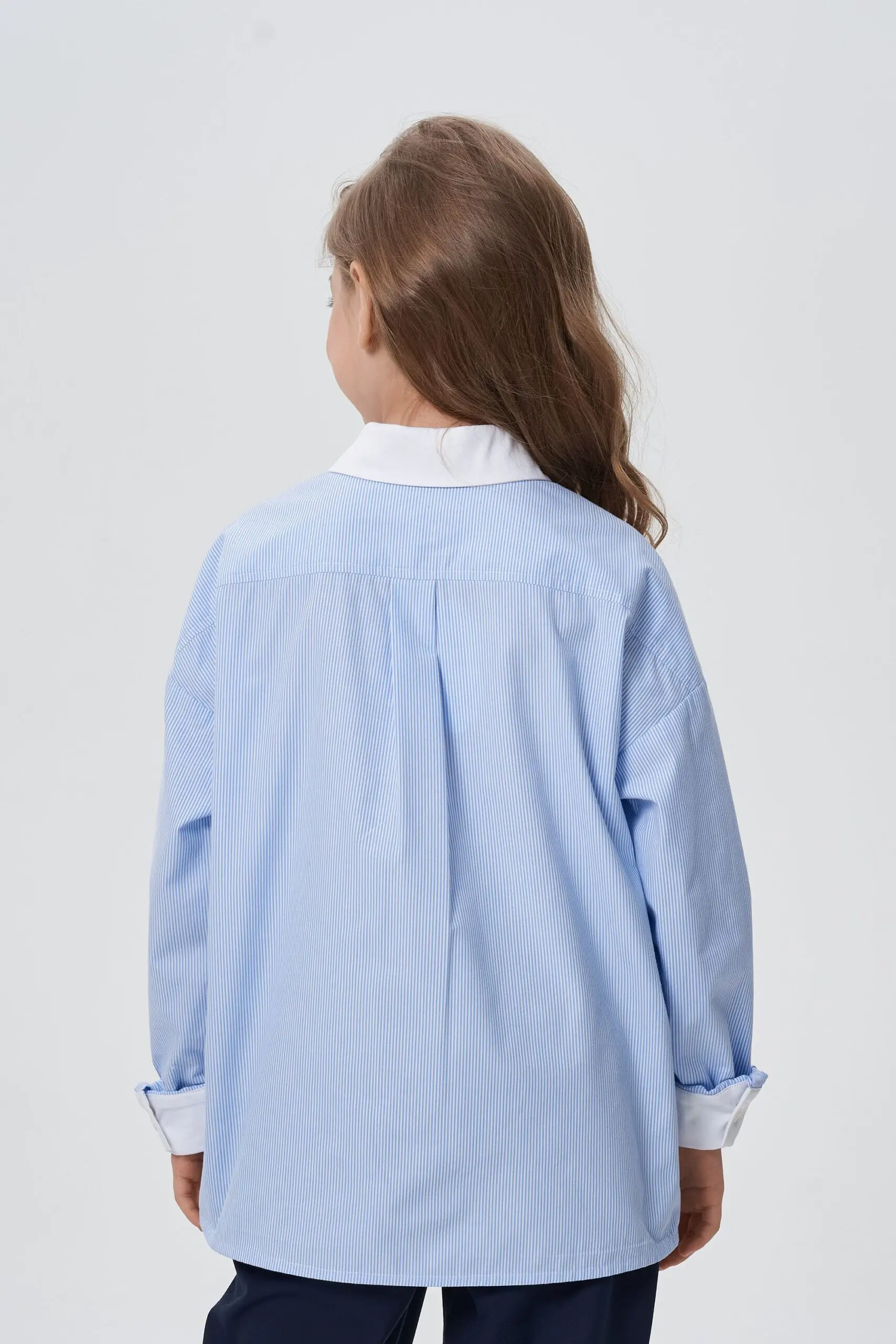 Замечательная хлопковая блузка светло-голубого оттенка будет базовым предметом гардероба школьницы.
