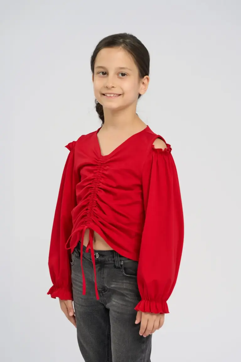 Эффектная блуза для девочки, выполненная в активном красном оттенке, станет акцентной частью детского образа. Модель с открытыми плечами и кокетливыми декоративными рюшами на длинных рукавах. По ... центру проходит утягивающая кулиса, благодаря которой можно видоизменять блузу по своему желанию. Натуральный хлопок добавляет изделию комфорта.