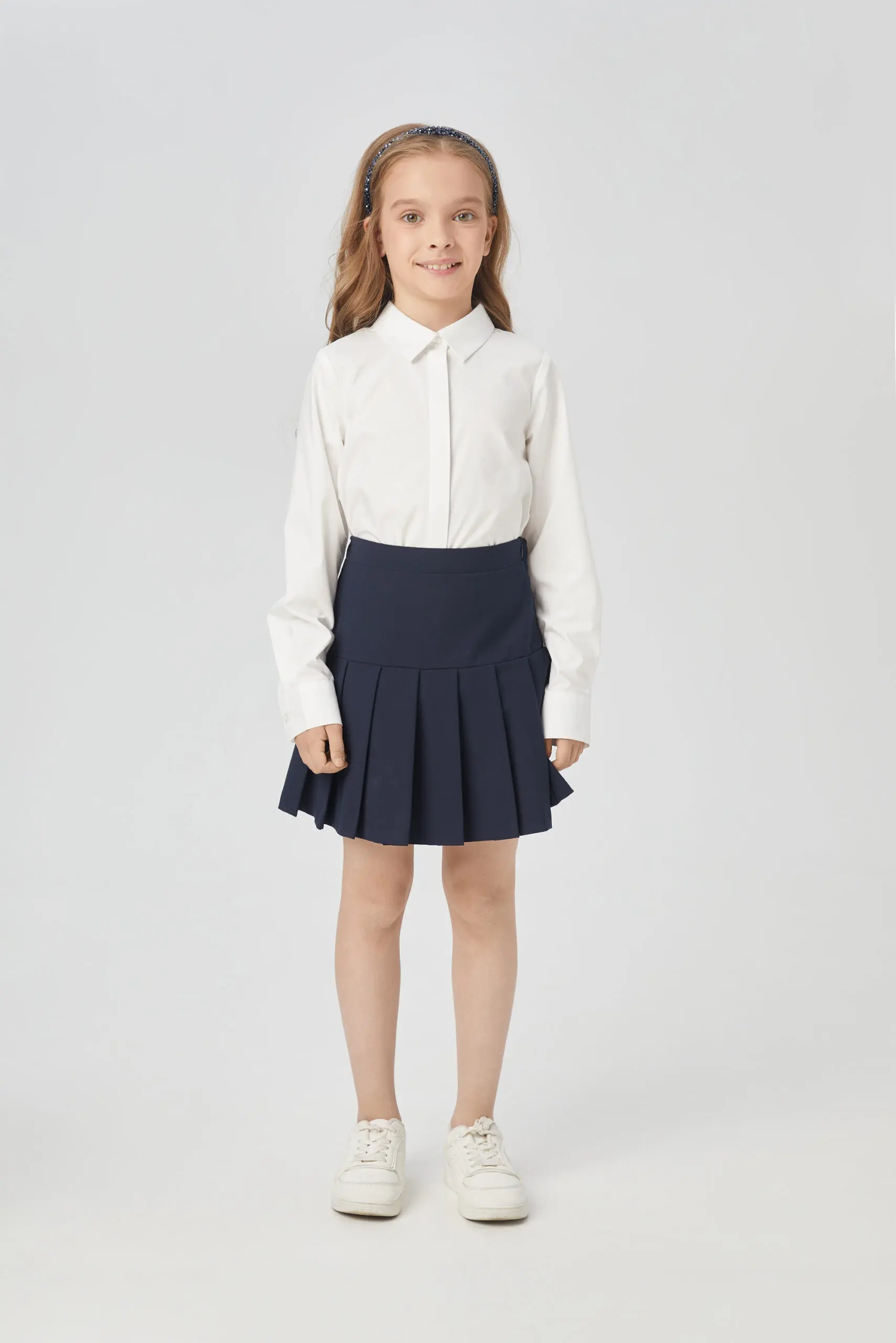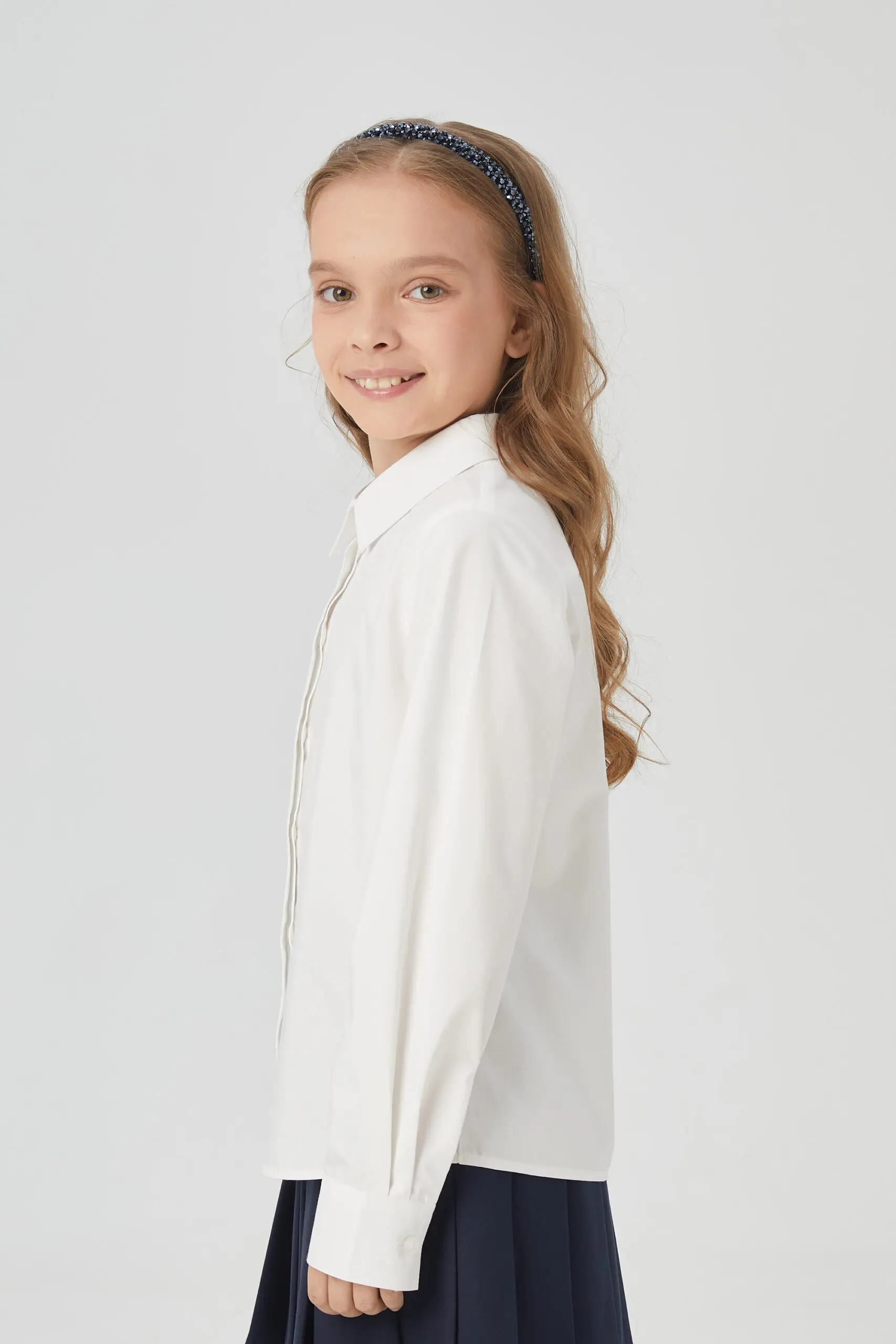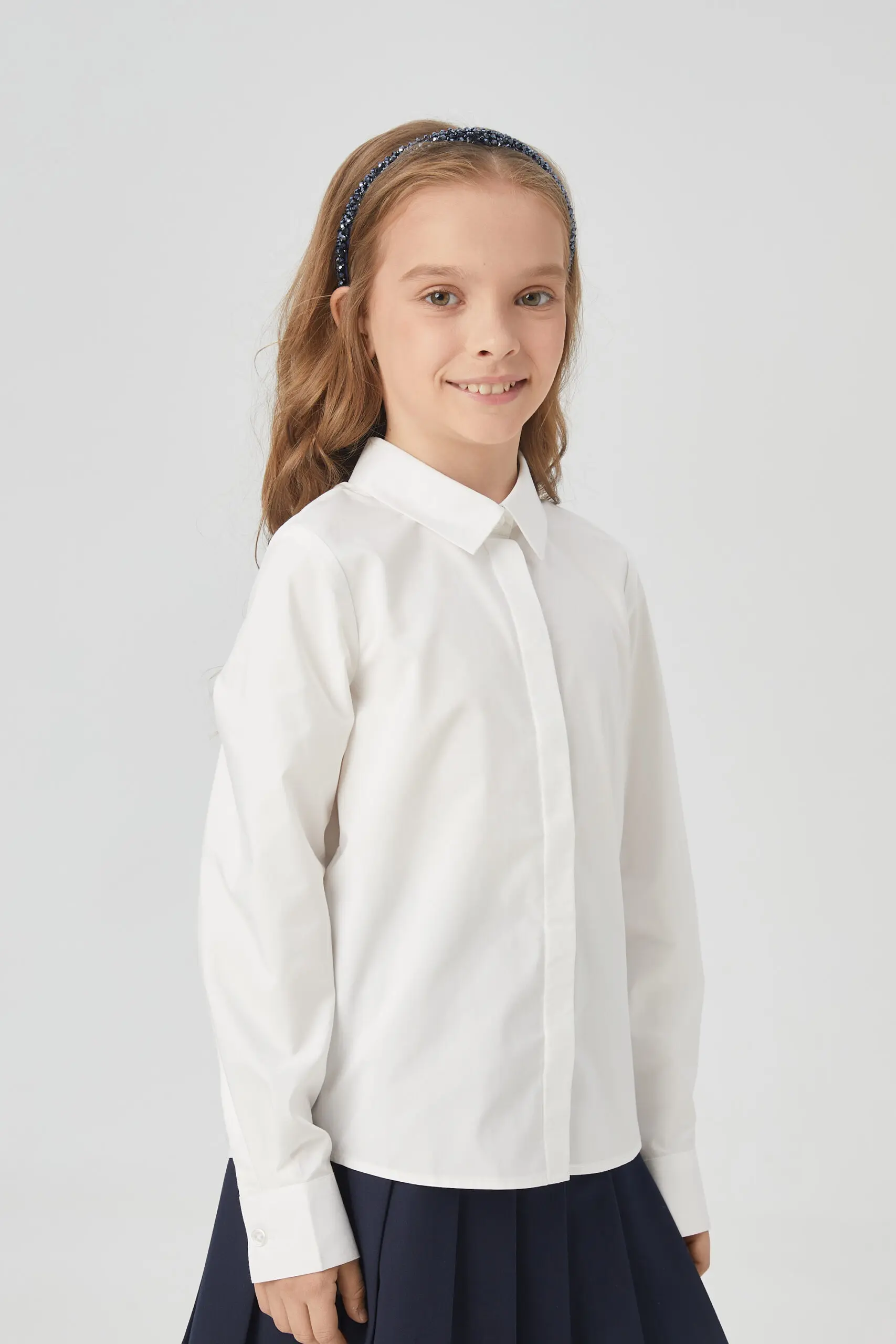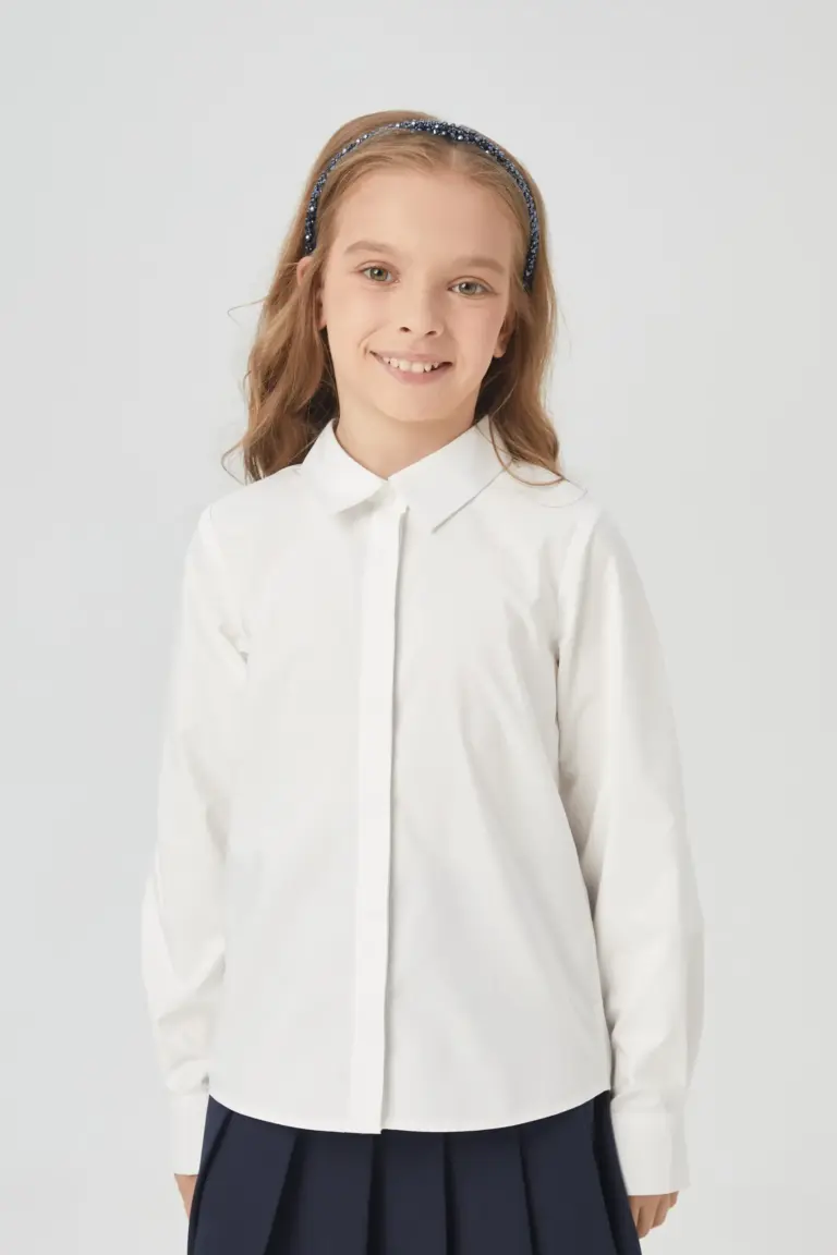 Лаконичная школьная блузка одна из основных составляющих школьного гардероба девочки. Благодаря свободному крою, такую блузку легко комбинировать с различными элементами школьного гардероба: юбками, брюками, сарафанами. Она ... прекрасно смотрится как навыпуск, так и заправленная. Классический отложной воротник – отличный выбор для ношения галстука или банта, если это требует школьный дресс-код. Аккуратная скрытая застежка помогает сохранить строгий и элегантный вид.