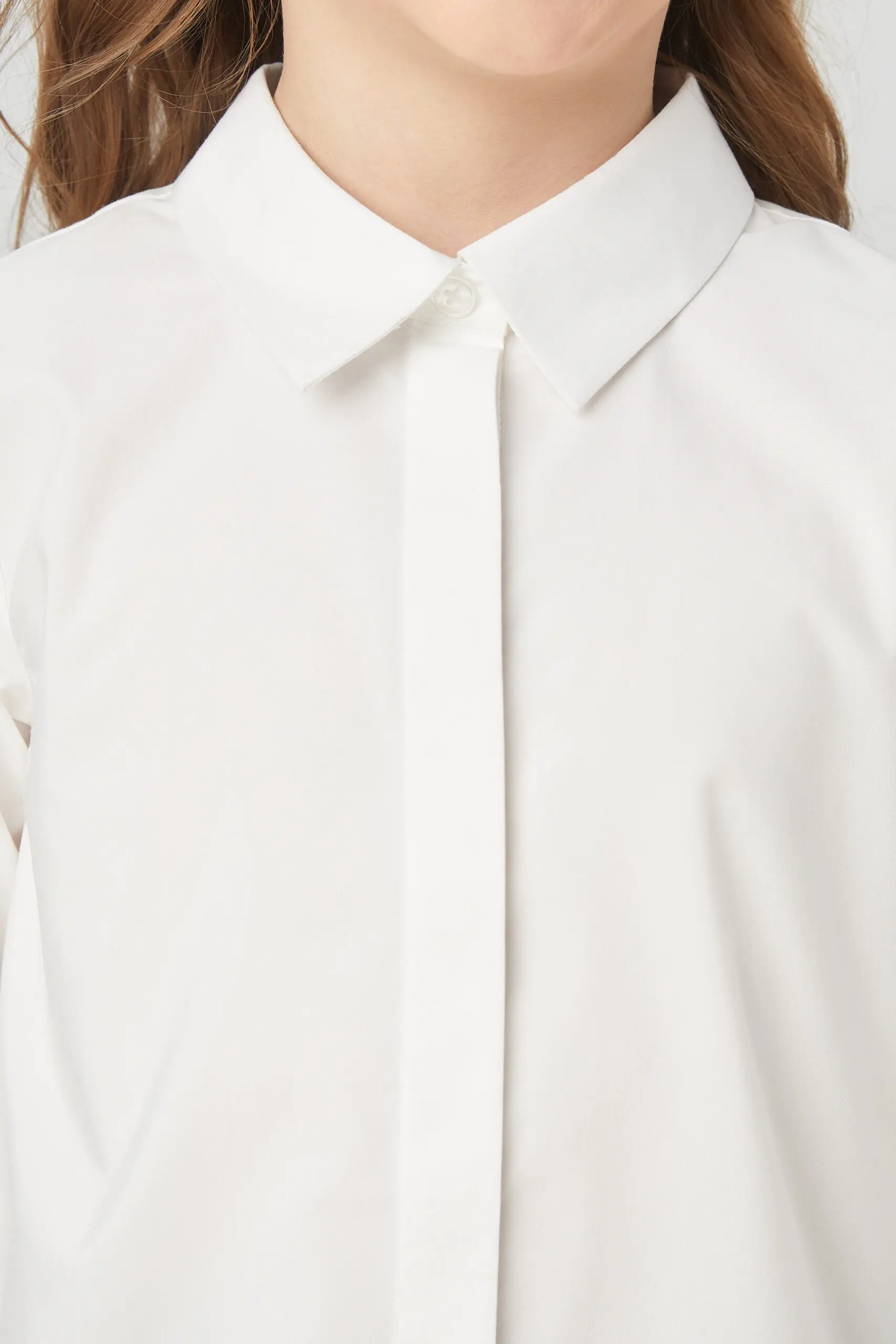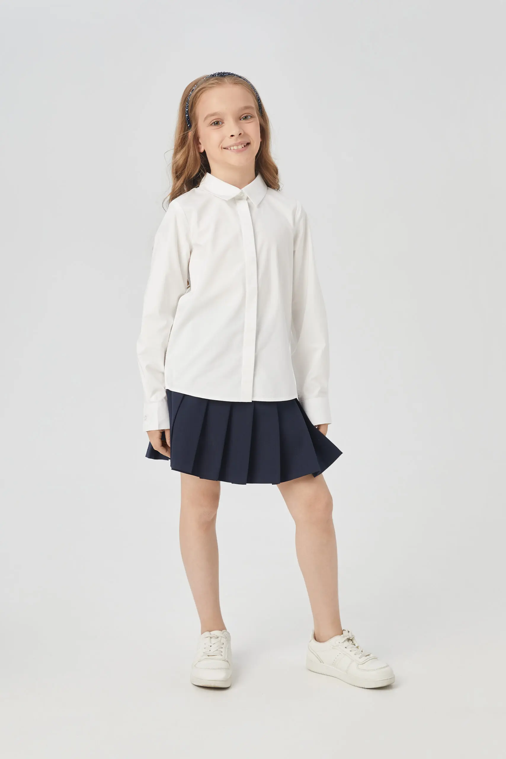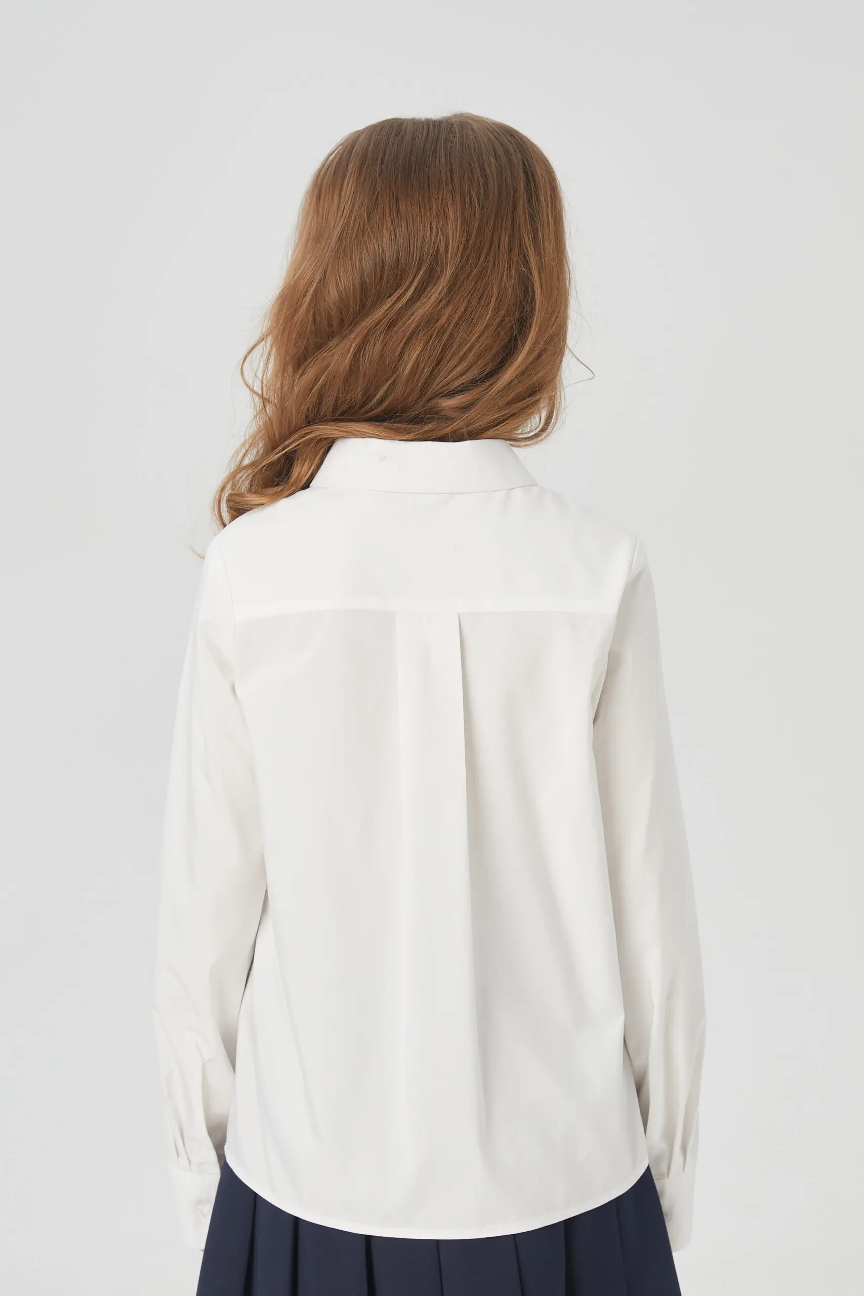 Лаконичная школьная блузка одна из основных составляющих школьного гардероба девочки. Благодаря свободному крою, такую блузку легко комбинировать с различными элементами школьного гардероба: юбками, брюками, сарафанами. Она ... прекрасно смотрится как навыпуск, так и заправленная. Классический отложной воротник – отличный выбор для ношения галстука или банта, если это требует школьный дресс-код. Аккуратная скрытая застежка помогает сохранить строгий и элегантный вид.