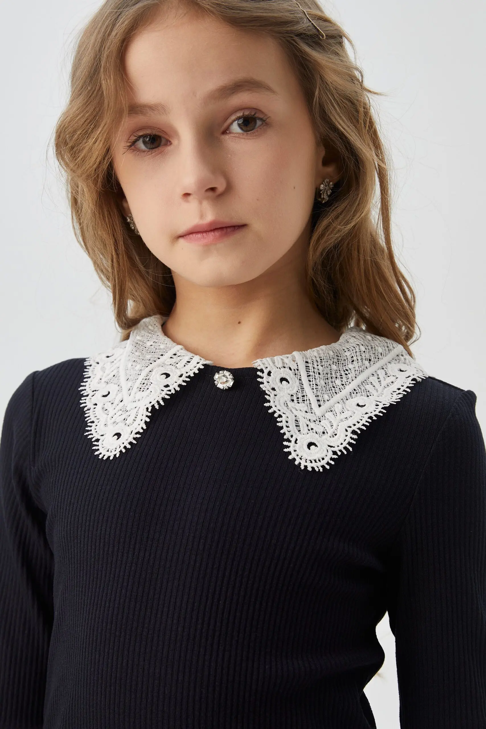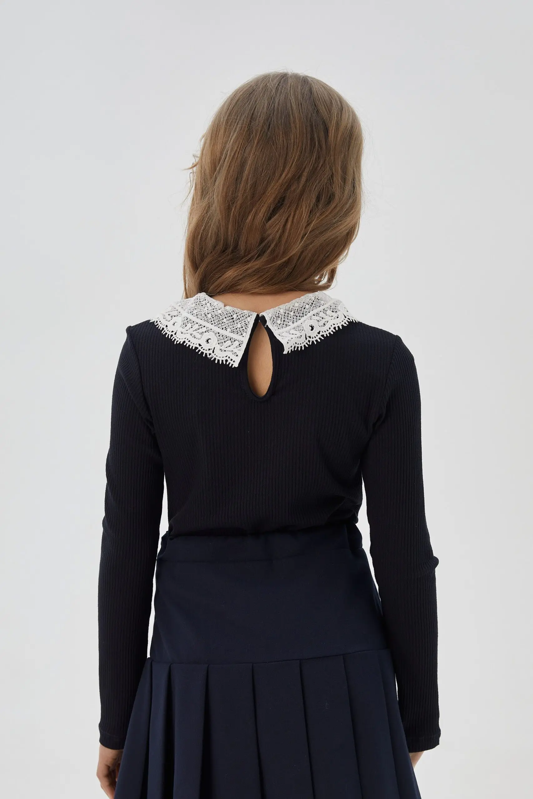 Горловина изящной модели декорирована белым ажурным ... воротником.