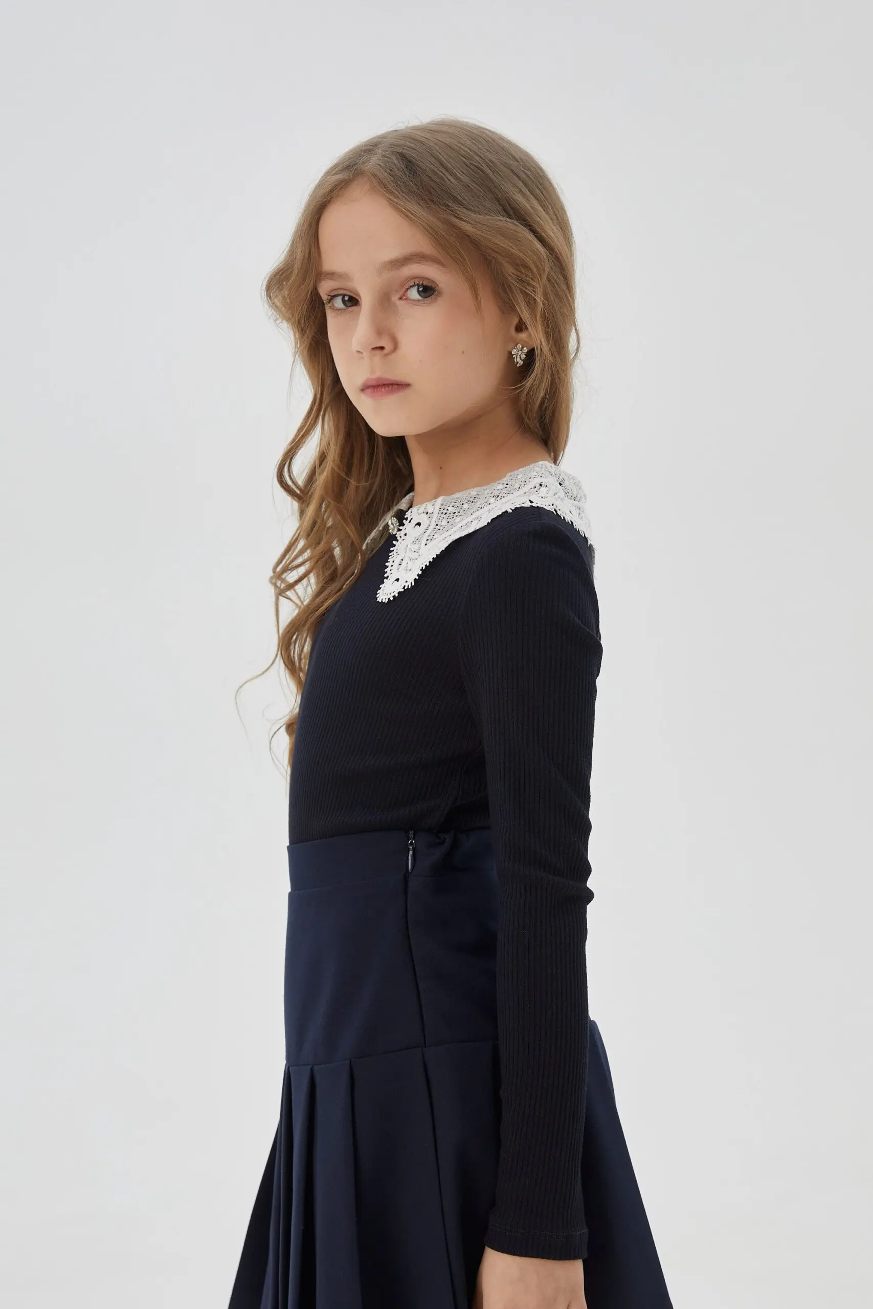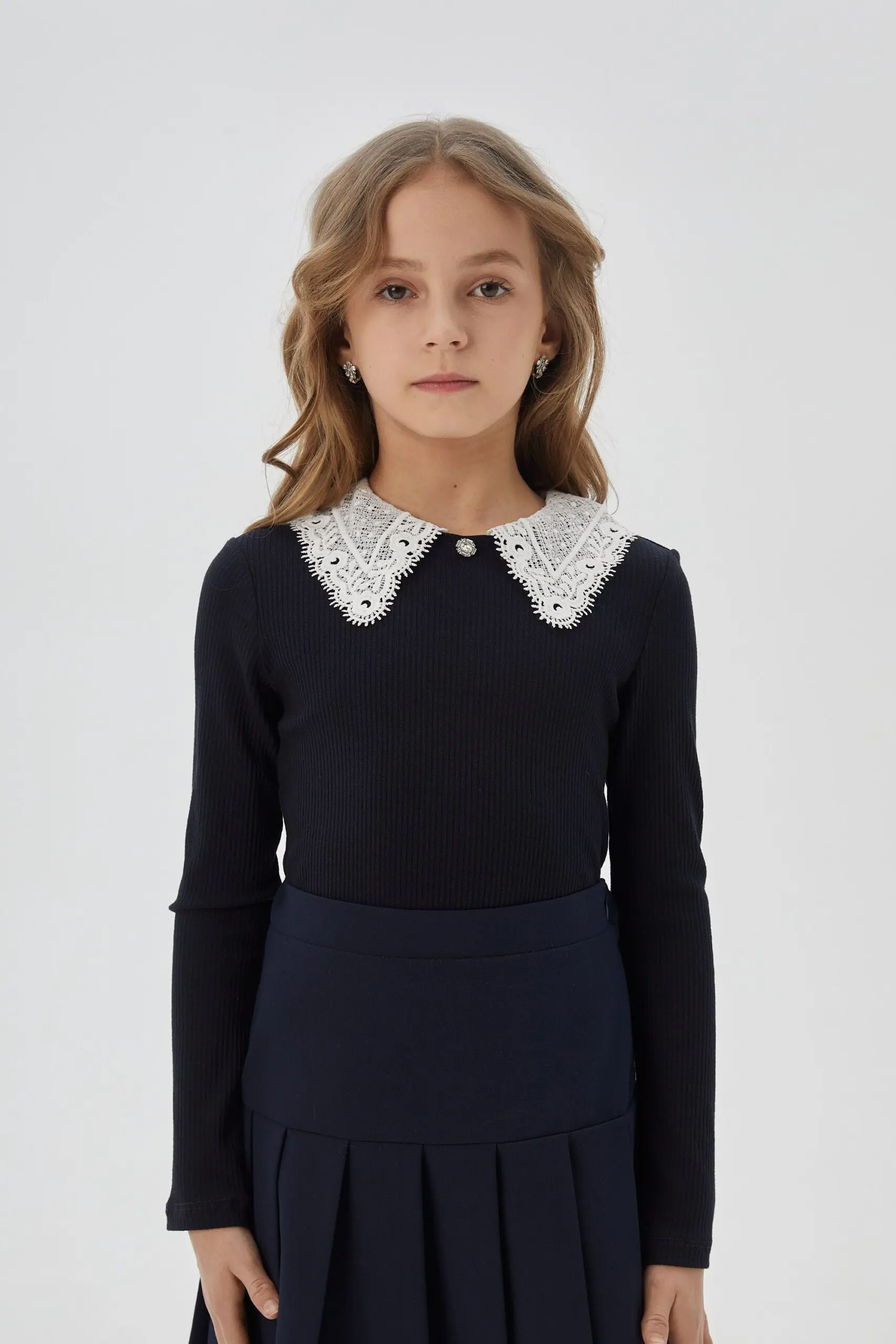 Элегантная школьная блузка из трикотажа «лапша» синего цвета для девочки.