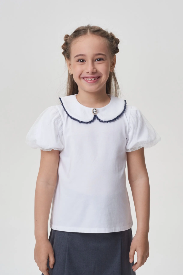 Трикотажная модель с круглым отложным воротником из дышащей ткани на основе хлопка и вискозы, декорированная изящными кружевами и камеей, будет прекрасным дополнением гардероба школьницы.
