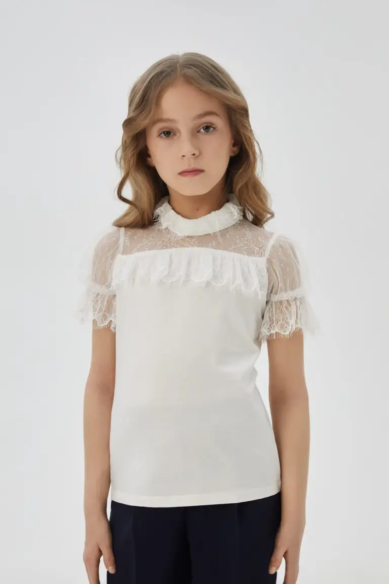 Прелестная трикотажная блузка белого цвета, украшенная нежными кружевами, ... будет воспитывать безупречный вкус у девочки.