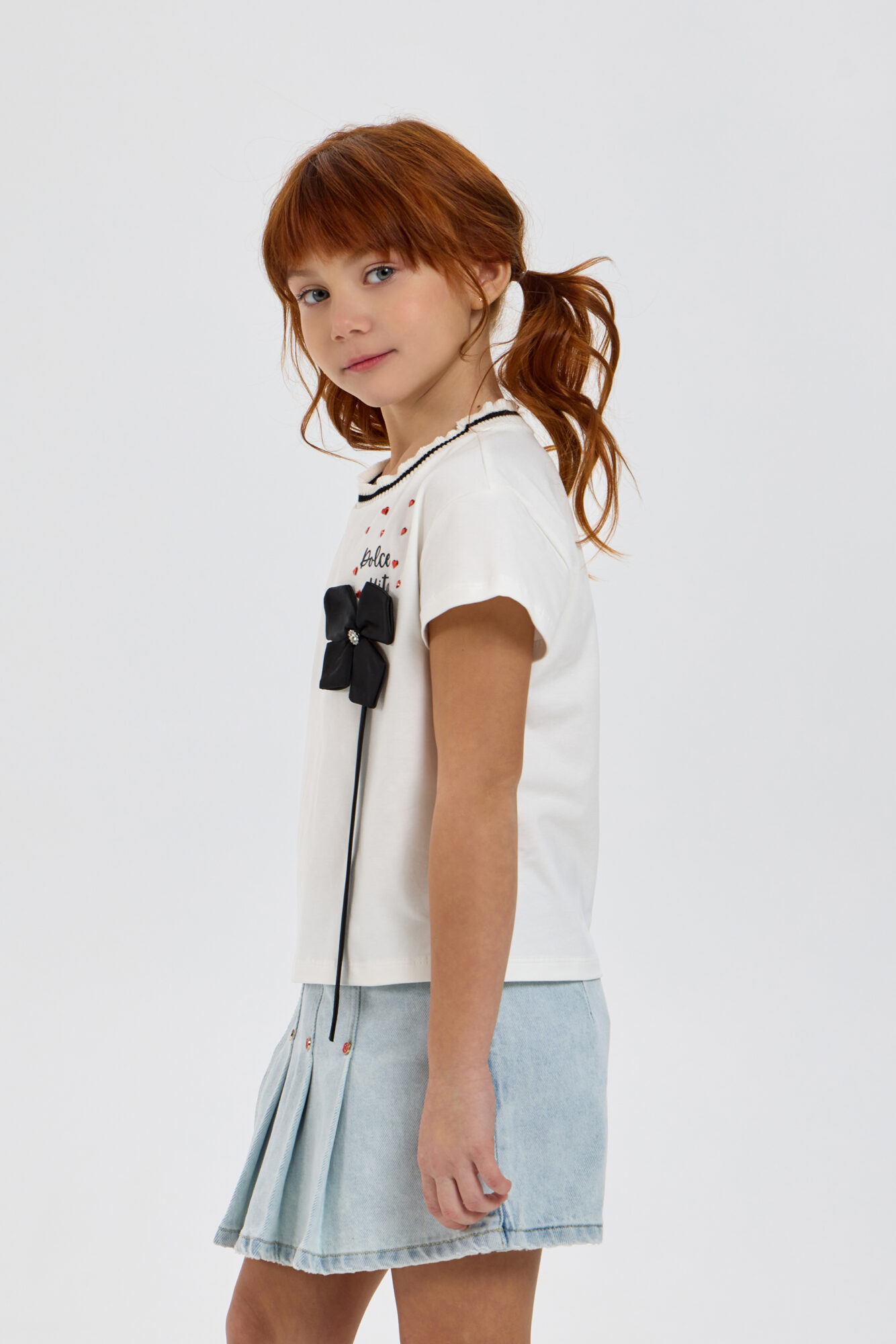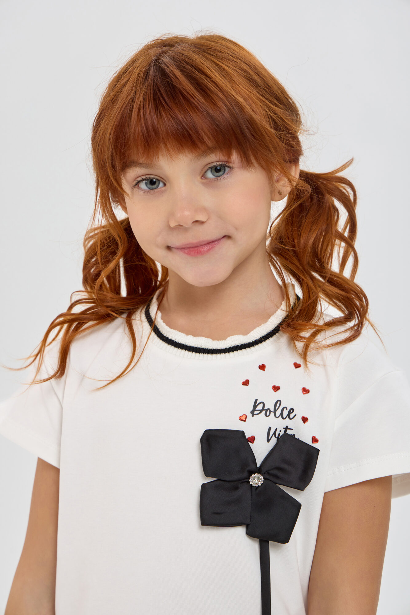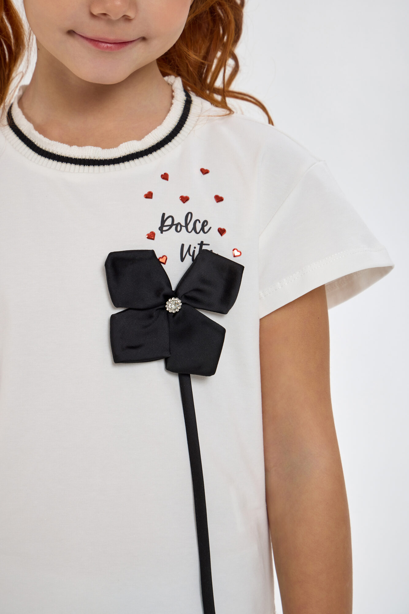 Блузка с декором для девочки — это стильный и модный предмет гардероба, который привлекает внимание благодаря оригинальному дизайну. Модель свободного кроя с короткими рукавами. Округлый вырез ... горловины укарашает вязаный подвяз с контрастыми полосками и рюшей по краю. Но главный акцент в этой блузке – объемный декор украшенный стразами. Это делает модель действительно исключительной и особенной. Универсальность оформления позволяет комбинировать блузу как с джинсовой одеждой, так и с различными юбками и шортами.