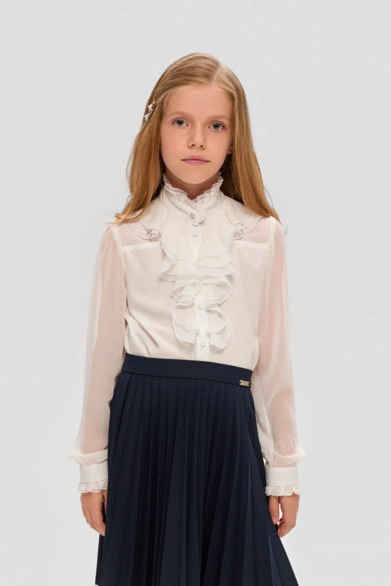 Элегантная школьная блузка белого цвета для девочки. Модель полуприлегающего силуэта выполнена из высококачественного смесового материала. Воротник в виде стойки оформлен рюшами и застегивается на изящную пуговицу. ... Длинные рукава внизу дополнены манжетами, которые также декорированы оборками. Застежка украшена двухъярусными воланами в виде жабо. Эта блузка идеально сочетается с сарафанами и жилетами любых оттенков.