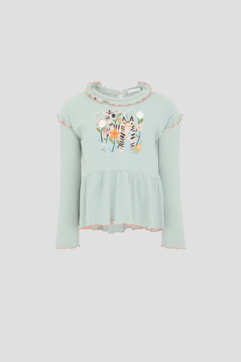 Очаровательная блузка с рюшами на вырезе и рукавах изготовлена из мягкого хлопкового материала, что обеспечивает ребенку максимальный комфорт. Широкий волан по низу создает легкий воздушный силуэт. ... Элегантный мятный цвет освежает образ, а оригинальная сюжетная аппликация придает уникальности и индивидуальности. Блузка имеет свободный крой, что позволяет легко сочетать её с различным низом — от джинсов до юбок.