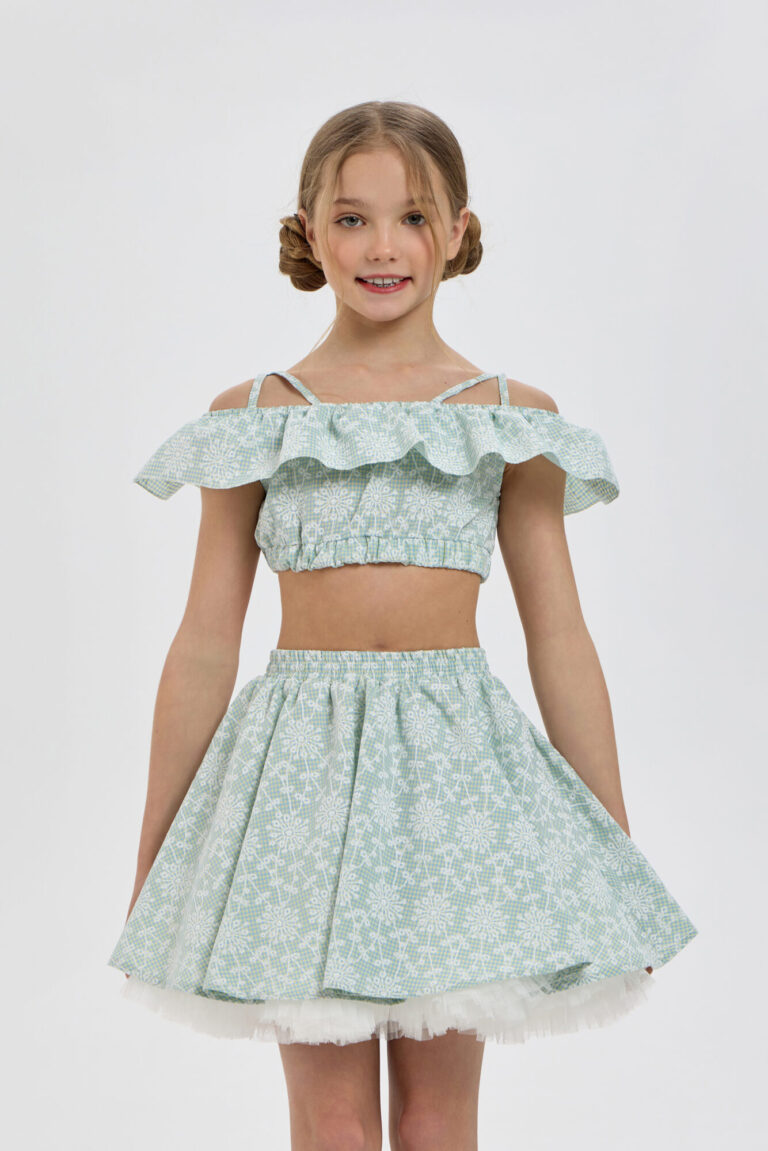 Укороченная блузка с воланами в виде короткого корсета − одно из стильных решений в подростковой моде, такие вещи очень украшают маленьких девочек. Эффектный наряд выполнен из ... хлопковой ткани. Блузка украшена бретельками и приспущенными по линии плеча воланами, которые дополнительно зафиксированы эластичной резинкой. Такая же резинка присутствует внизу изделия обеспечивая надеждую фиксацию. Благодаря своему дизайну, этот топ отлично сочетается с юбками и шортами, позволяя создавать каждый день уникальные и яркие образы.