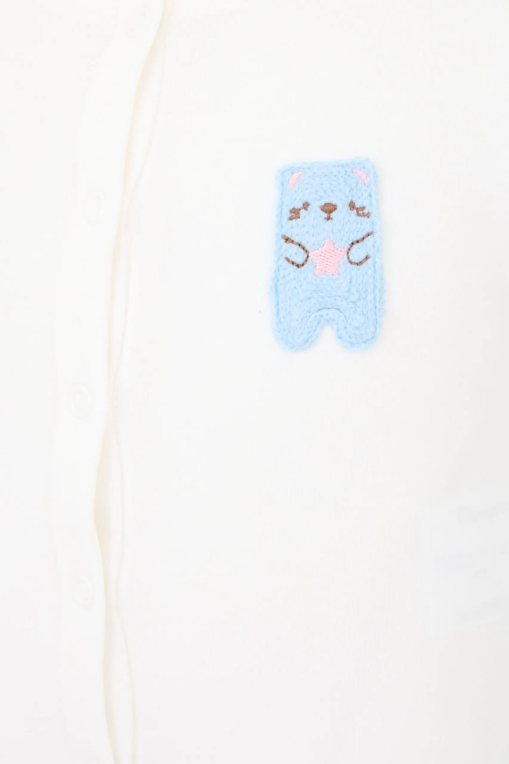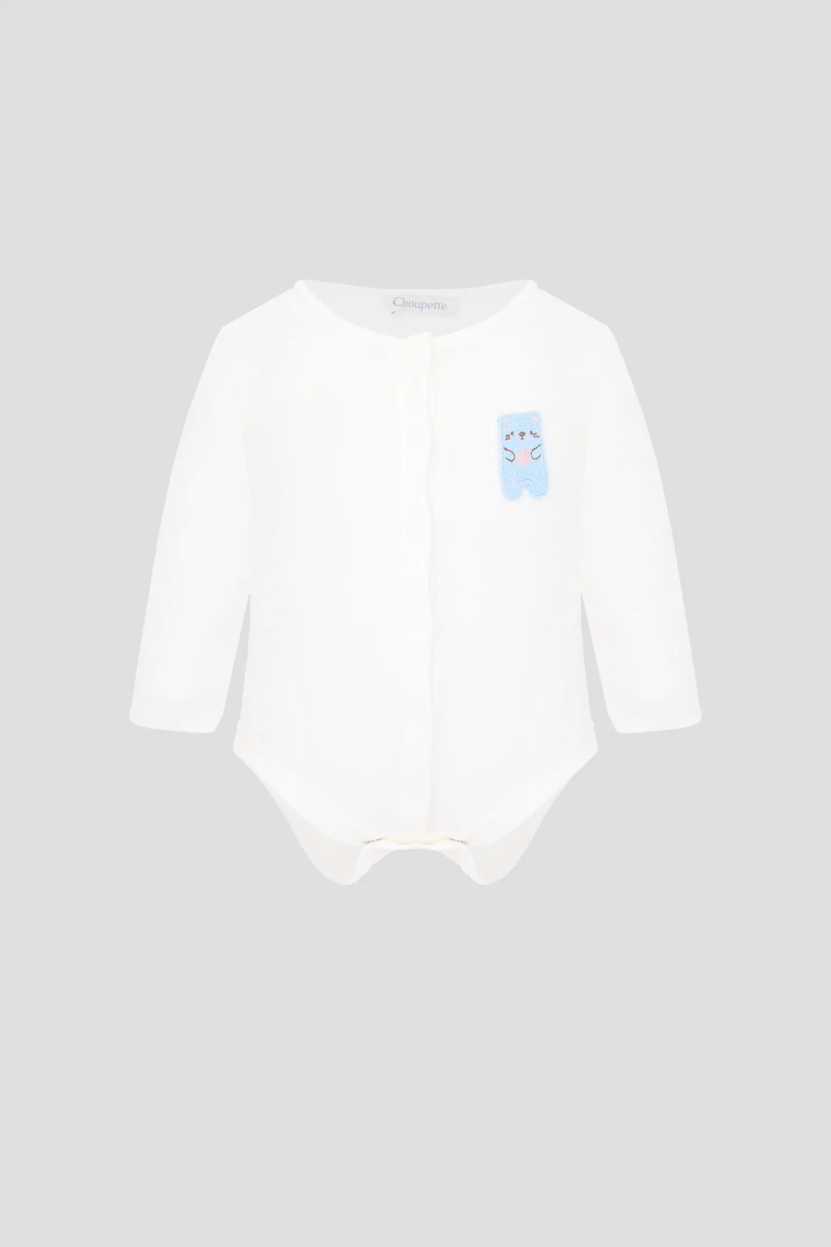 Боди с декором для мальчика выполнено из 100% хлопка в актуальном оттенке экрю. Модель прилегающего силуэта имеет округлый вырез горловины. Удобная застежка на кнопки по всей ... длине изделия позволяет без проблем переодеть малыша. Декорировано изделие милой нашивкой в виде медвежонка. Боди - не просто базовый элемент гардероба, это залог комфорта и удобства для вашего маленького модника.