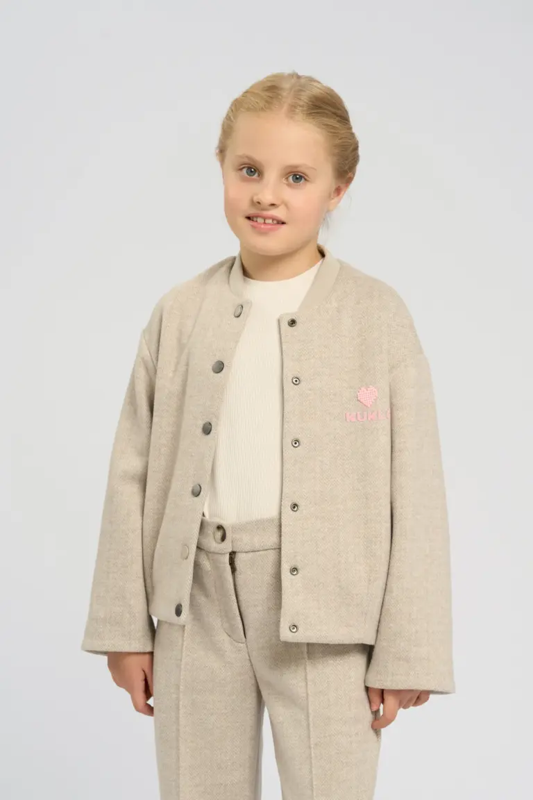 Жакет-бомбер для девочек выполнен из фактурного трикотажа в бежевом цвете, который придаёт изделию мягкость и уют. Ткань отличается приятной на ощупь текстурой, что делает модель особенно ... комфортной для повседневного гардероба. Классический фасон бомбера с эластичной отделкой воротника придаёт образу спортивную ноту. На груди розовая декоративная вышивка. Бежевый цвет позволяет сочетать модель с различными элементами детского гардероба.