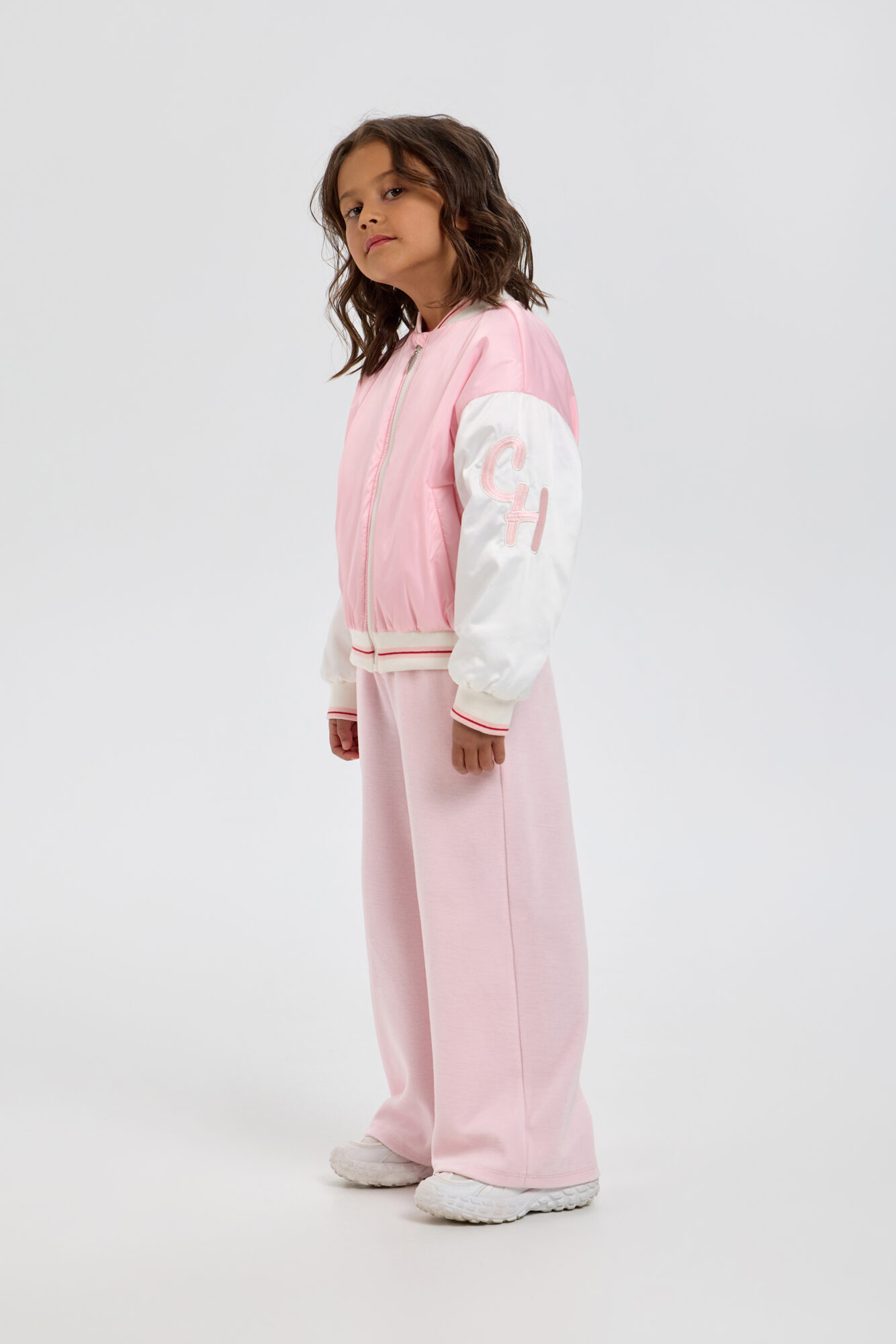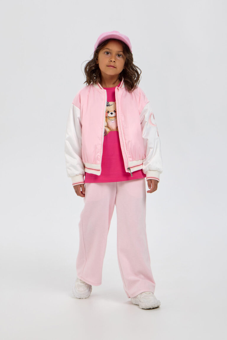 Утепленный бомбер в нежно-розовом цвете станет ярким дополнением к весеннему или летнему гардеробу маленькой модницы. Модель свободного кроя с заниженной линией плеча. Свободный длинный рукав, манжеты ... и резинка по низу обеспечивают защиту в прохладную и ветрянную погоду. Вместительные боковые карманы предназначены для небольших предметов. Застежка-молния делает использование бомбера простым и удобным. Объемная аппликация на рукаве придает куртке особый шарм и выделяет индивидуальность стиля. Утеплитель бомбера, выполненный из полиэстера, обеспечивает сохранение тепла в прохладную погоду. С теплым промежуточным слоем можно носить и в +5 °С
