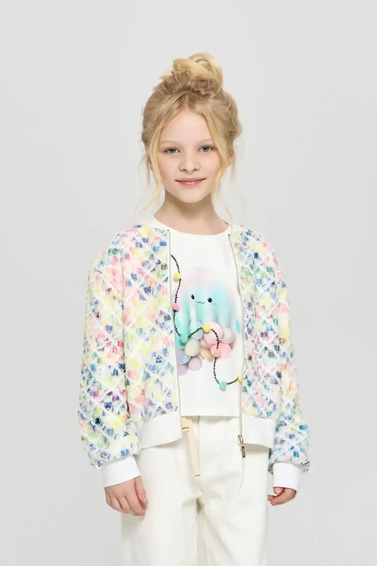 Бомбер для девочки из креативной ткани - модный и практичный предмет гардероба. Модель свободного кроя, манжеты и низ изделия оформлены трикотажем. Спереди застежка на молнию. Фактурная ... ткань создает интересный визуальный эффект, придавая бомберу уникальность. Подкладка из 100% хлопка.