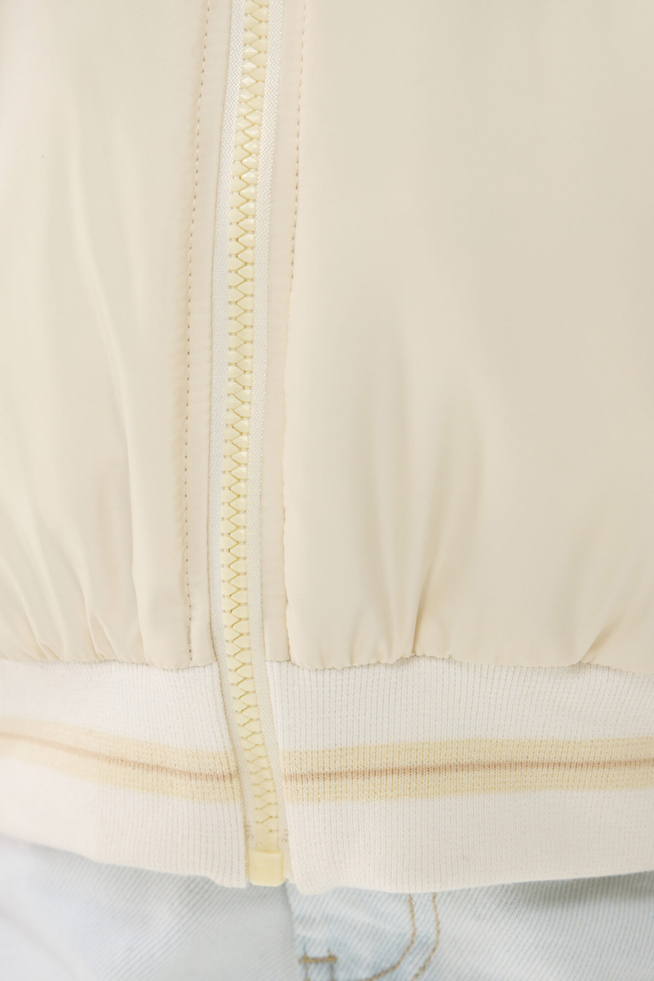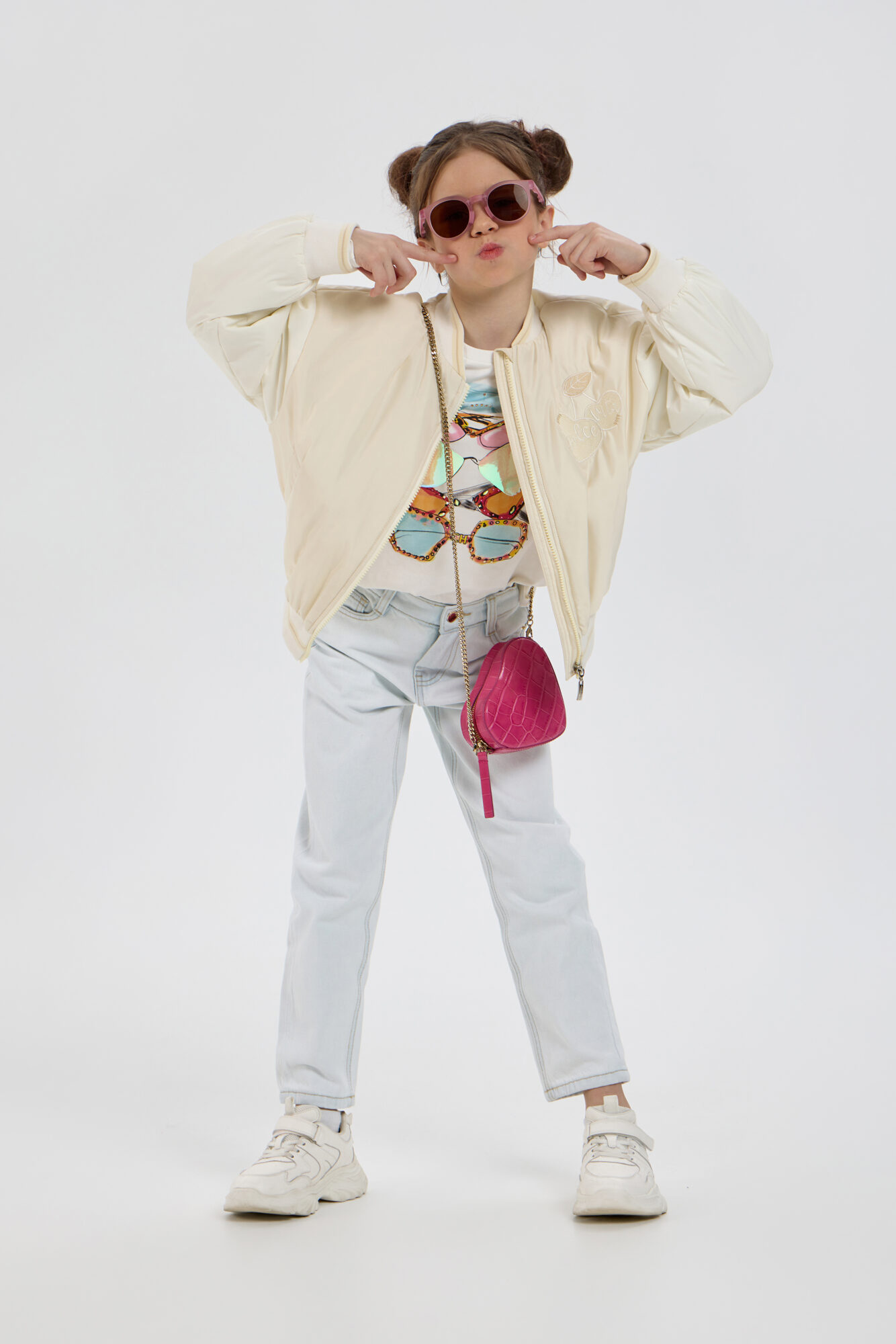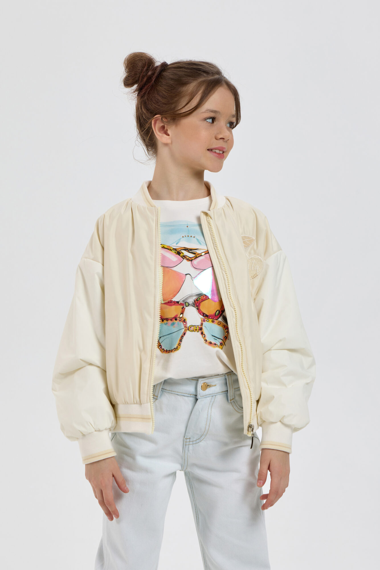 Стильный бомбер для девочек – это универсальное решение для создания современных аутфитов. Трендовый фасон оверсайз со спущенной плечевой линией дает возможность комбинировать эту модель с разнообразной ... одеждой. Невысокий ворот, свободный удлиненный рукав, эластичные манжеты и резинка по низу куртки защищают от прохлады и ветра. Боковые карманы с прорезями добавляют практичности и позволяют всегда держать нужные мелочи под рукой. Застежка-молния делает бомбер еще более удобным и функциональным. Объемная вышивка на передней части куртки формирует интересный акцент и подчеркивает уникальность образа. Контрастные полосы на воротнике, рукавах и нижней части делают этот бомбер ультрамодным в текущем сезоне. В качестве утеплителя используется полиэстер, который обеспечивает тепло в прохладную погоду.