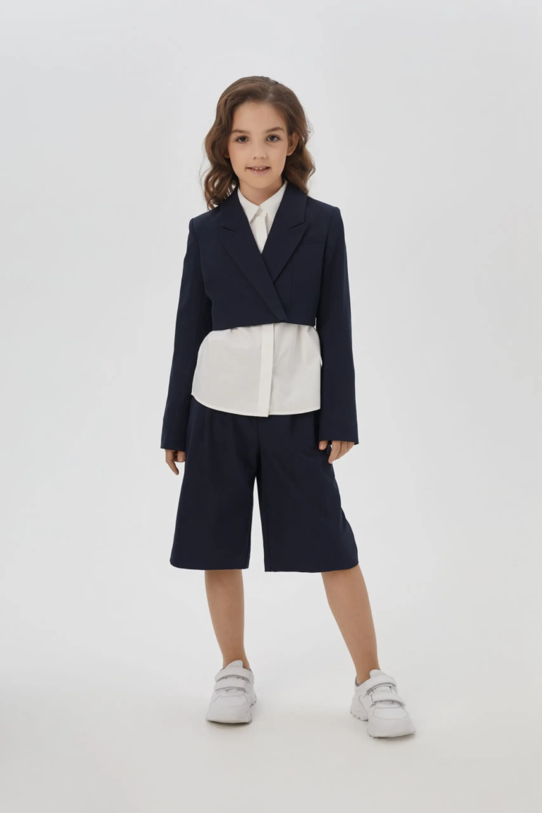 Костюмная ткань синего цвета специально разработана для учащихся, в таком наряде комфортно на занятиях.