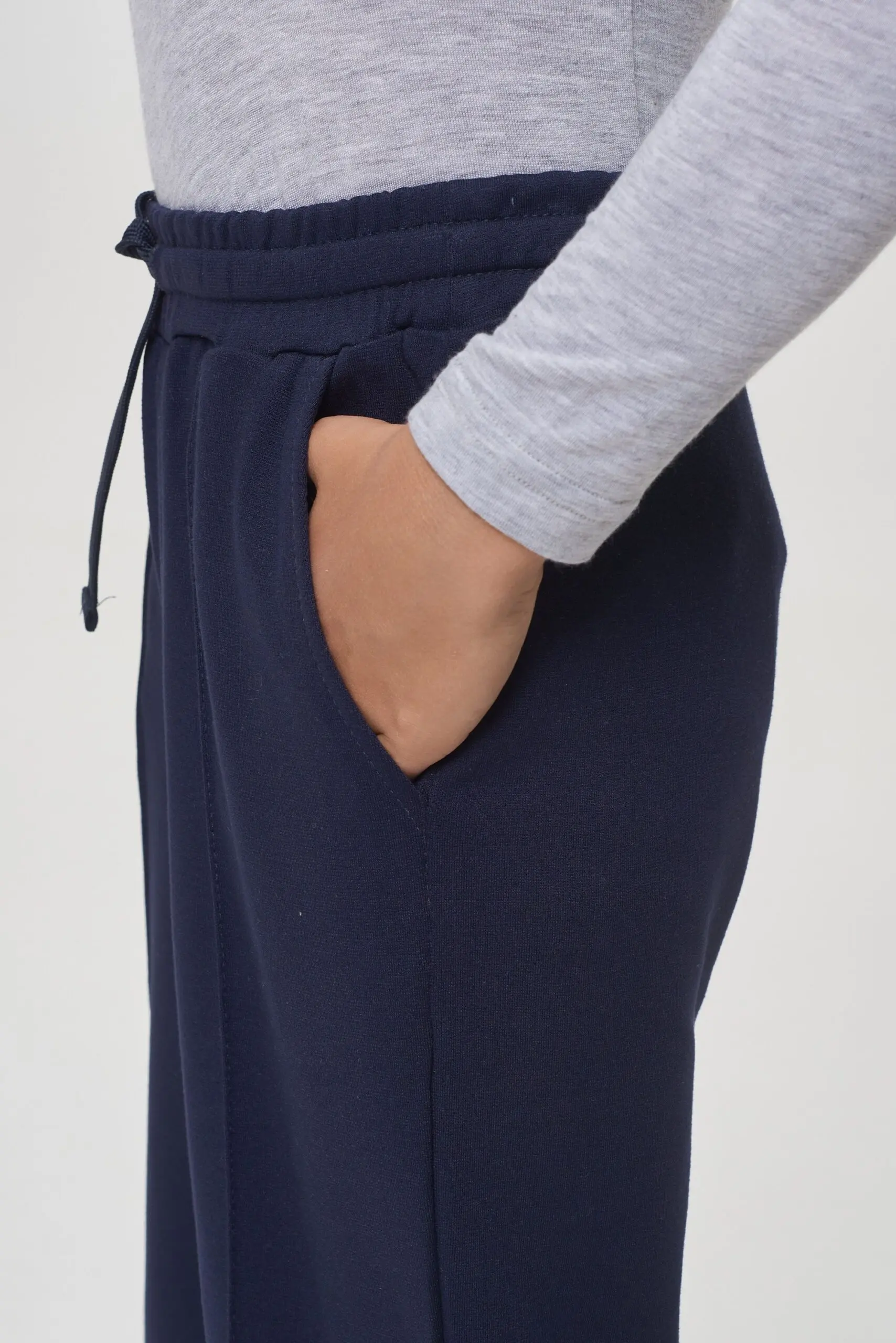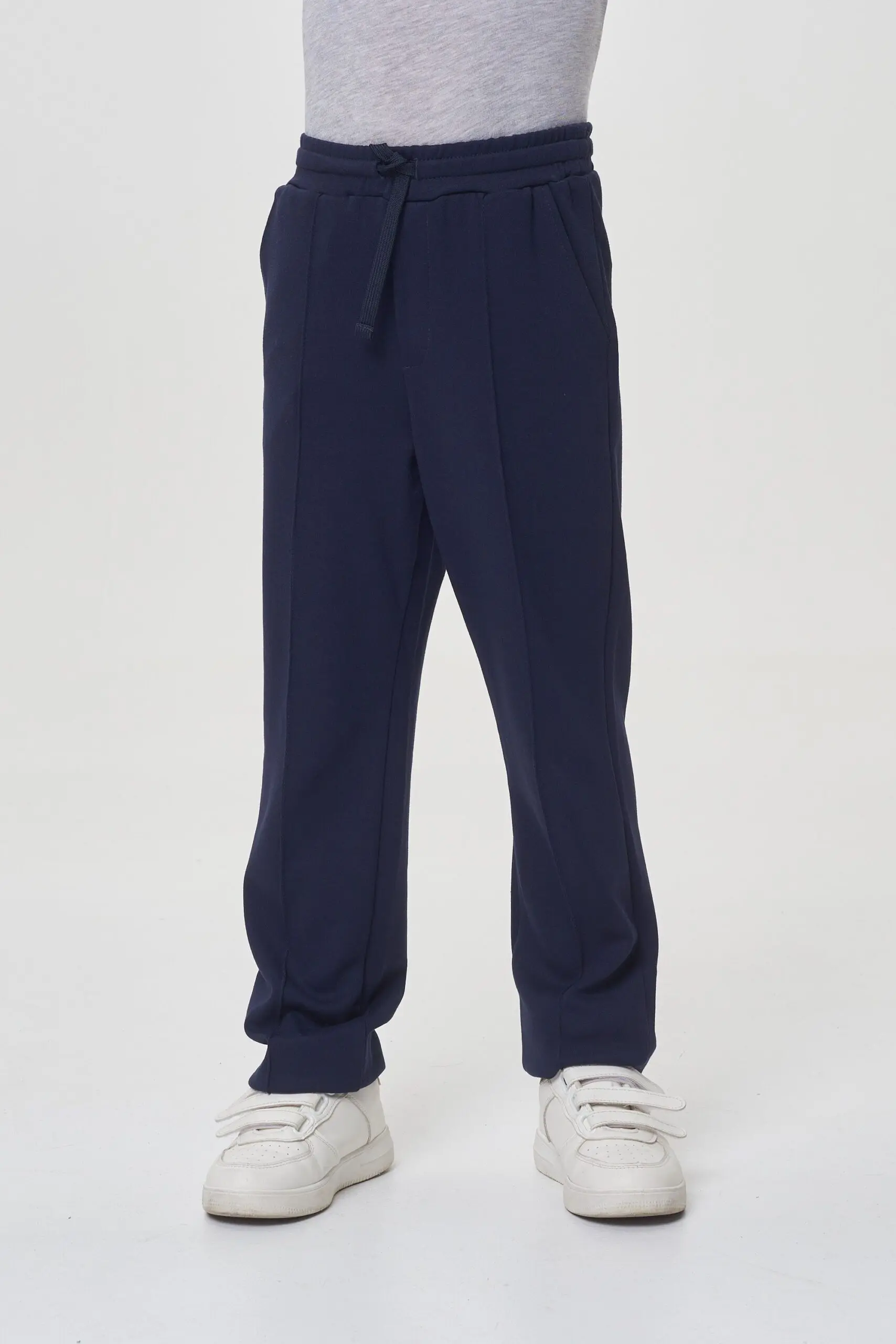 Удобные брюки из джерси выполнены в насыщенном синем цвете. Такой базовый оттенок, а также лаконичный дизайн позволяет сочетать модель с любыми футболками.