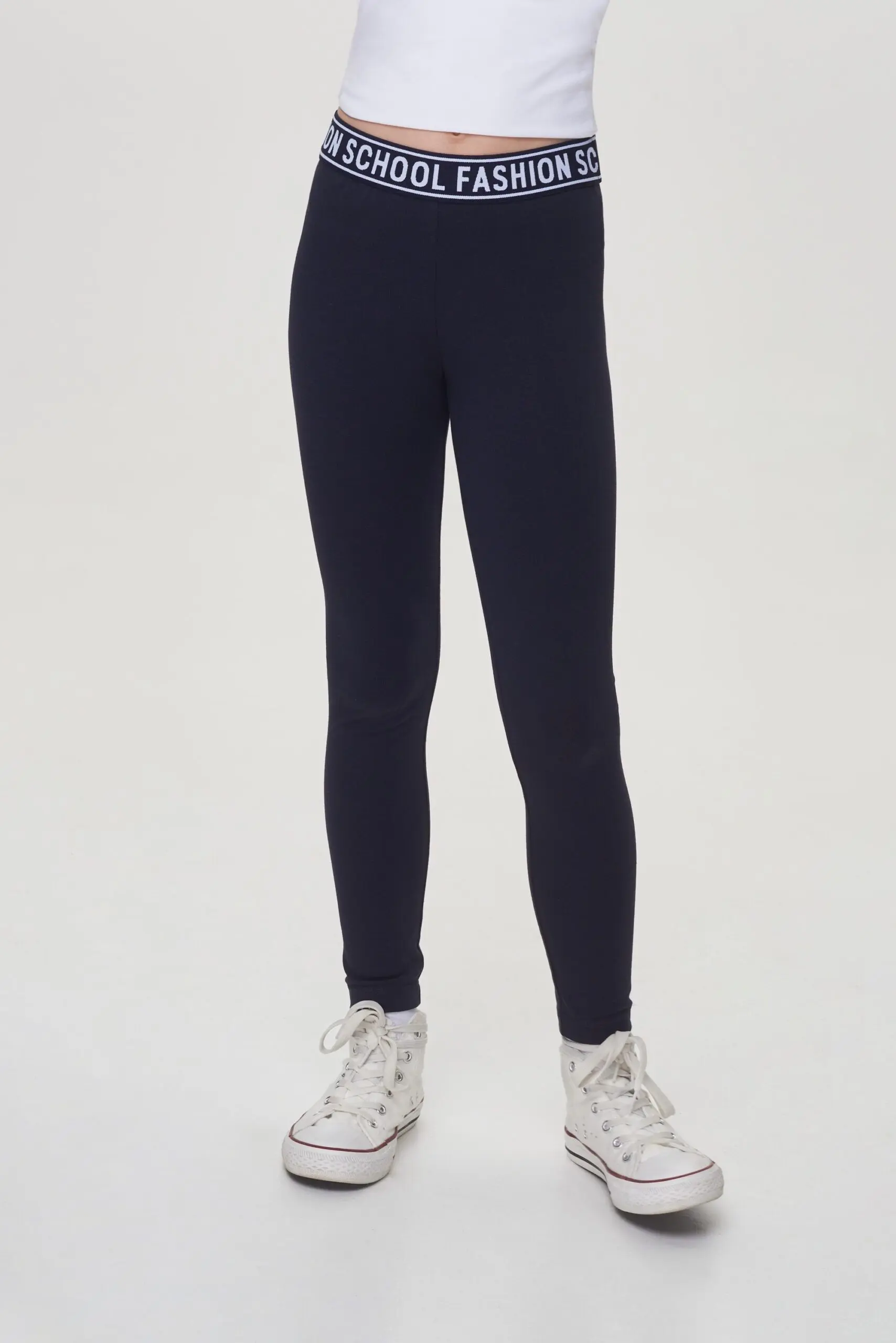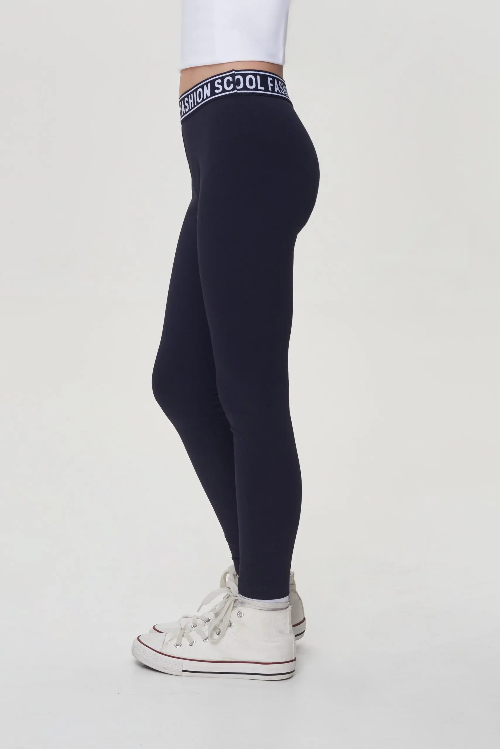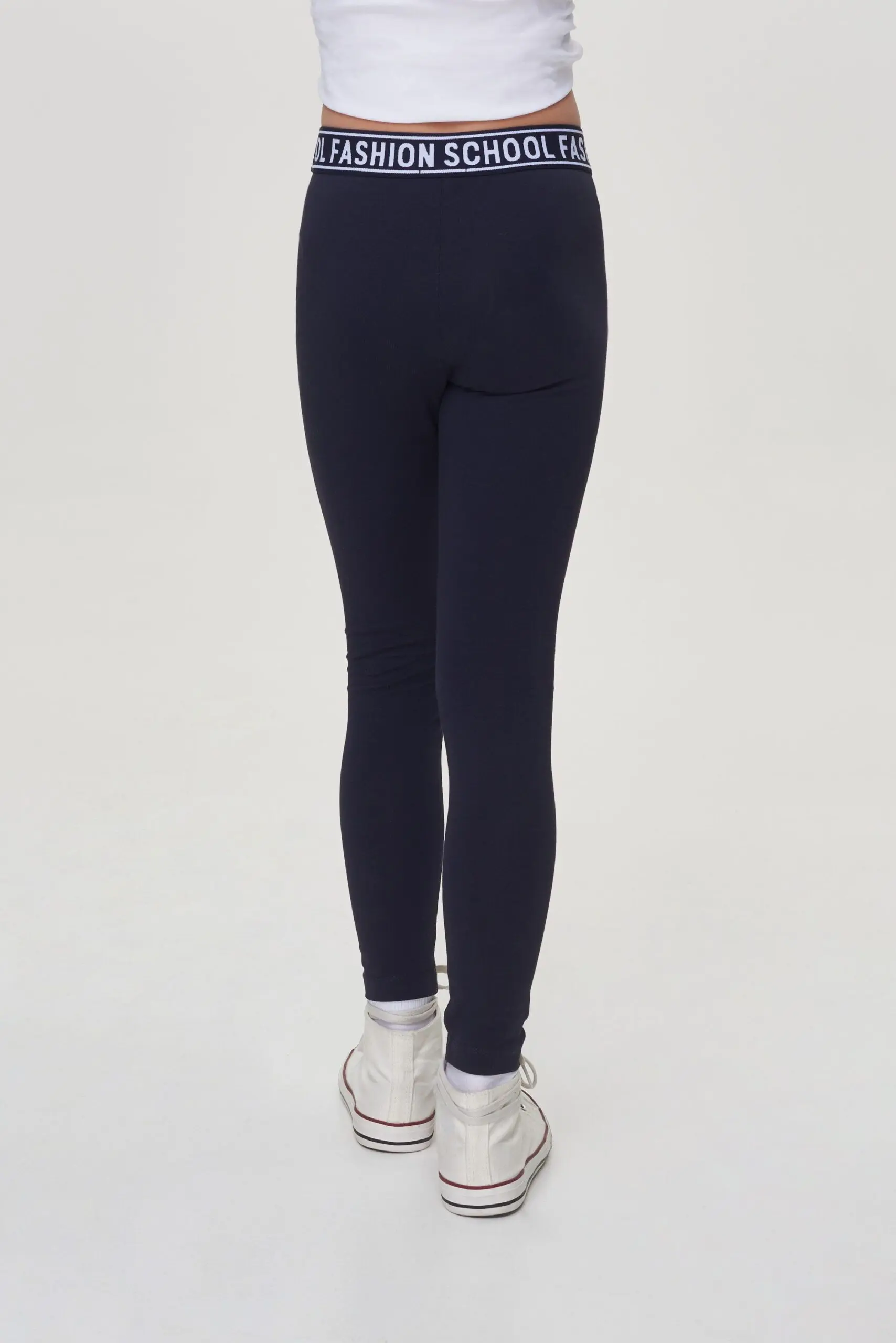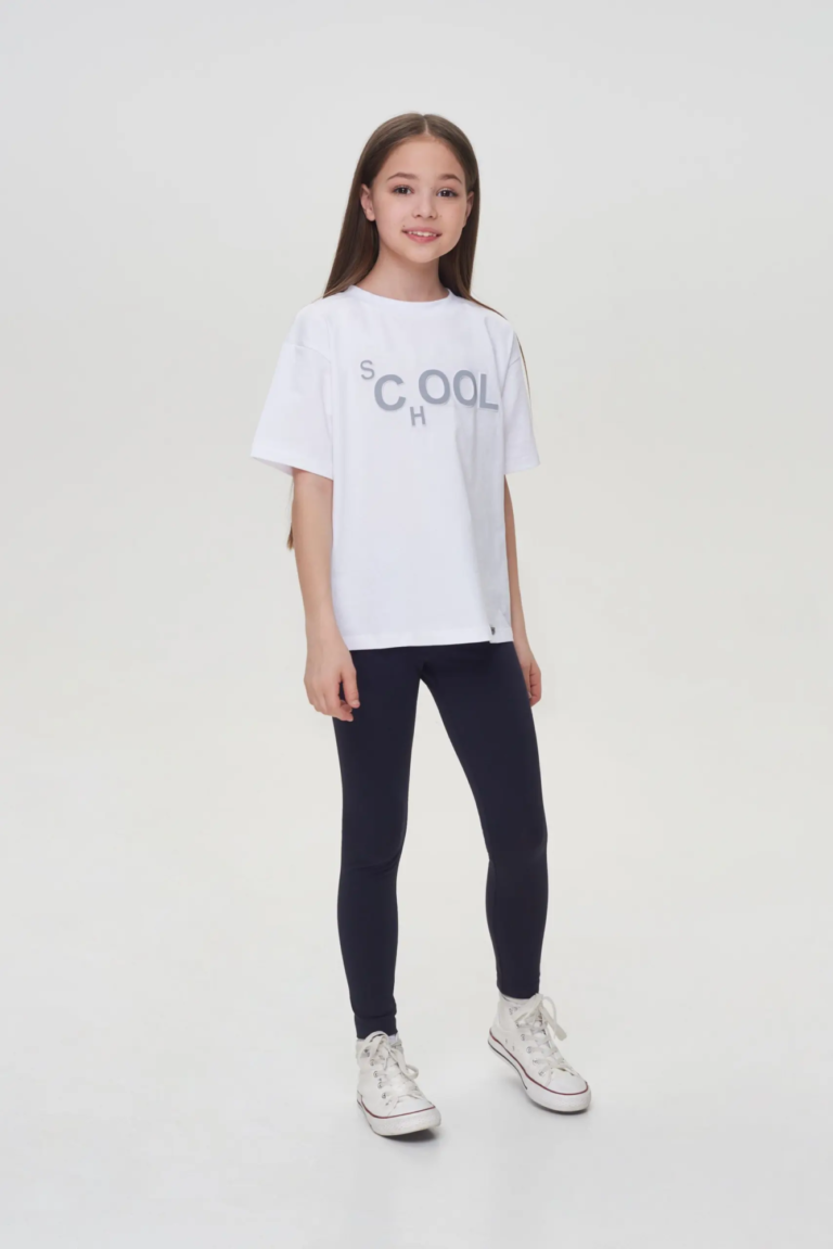 Лосины темно-синего цвета с оригинальным принтом можно носить модницам любой комплекции.