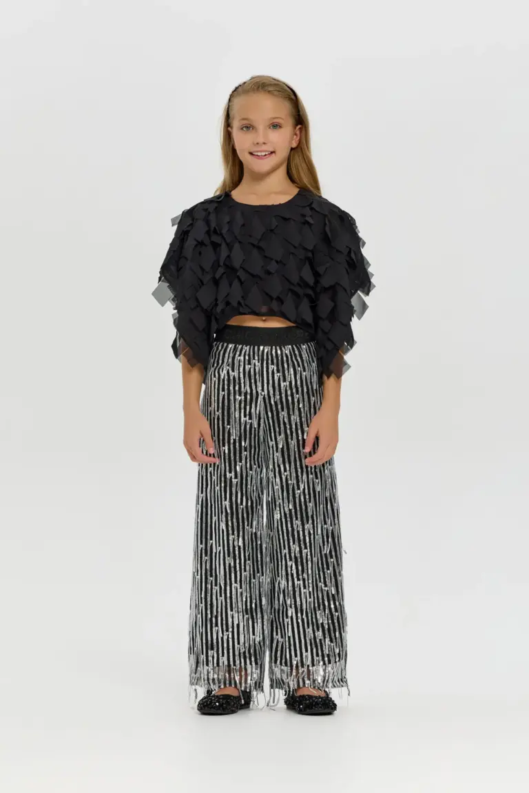 Брюки нарядные с пайетками, – это актуальный тренд сезона! Переливающиеся на свету пайетки гарантируют эффектный вид, что делает эту модель отличным вариантом для торжеств, вечеринок или ... других значимых событий. Прямой крой обеспечивает свободу и непринужденность, позволяя ребенку двигаться без ограничений и ощущать комфорт. Пояс на эластичной резинке обеспечивает идеальную посадку по фигуре. Комбинируя эти брюки с лаконичными топами или блузами, легко получить сбалансированный look, в котором доминантой станут именно на блестящие брюки.