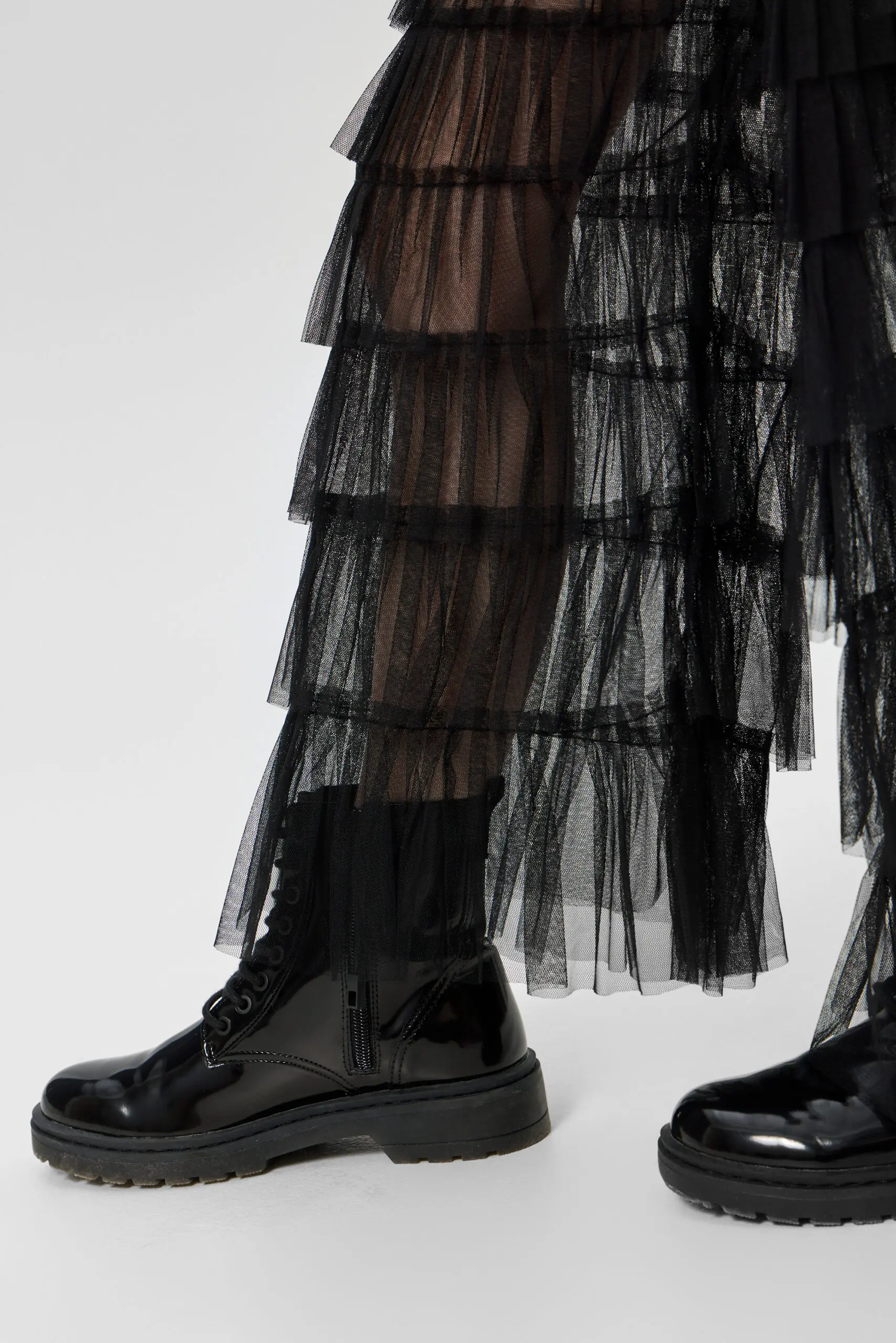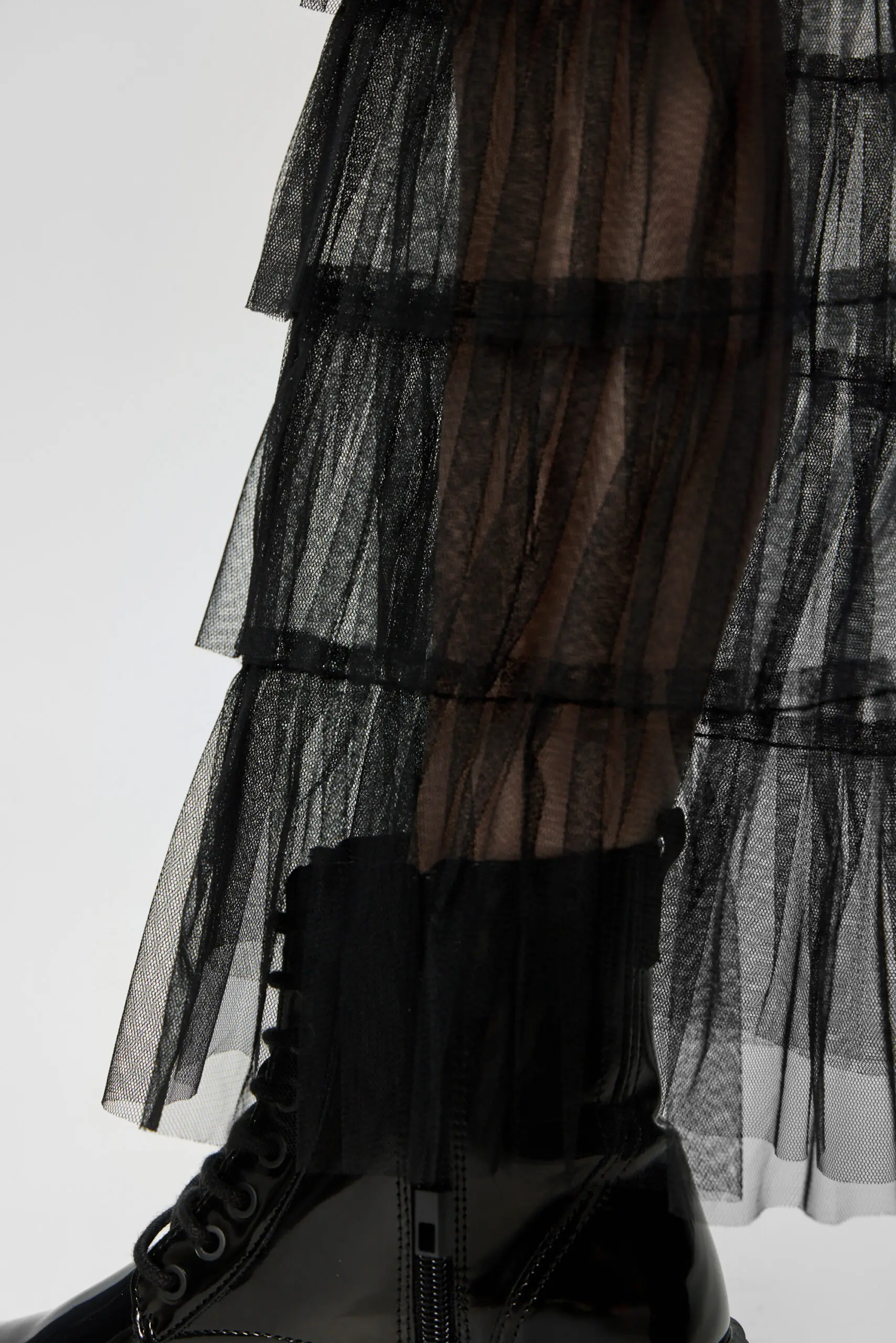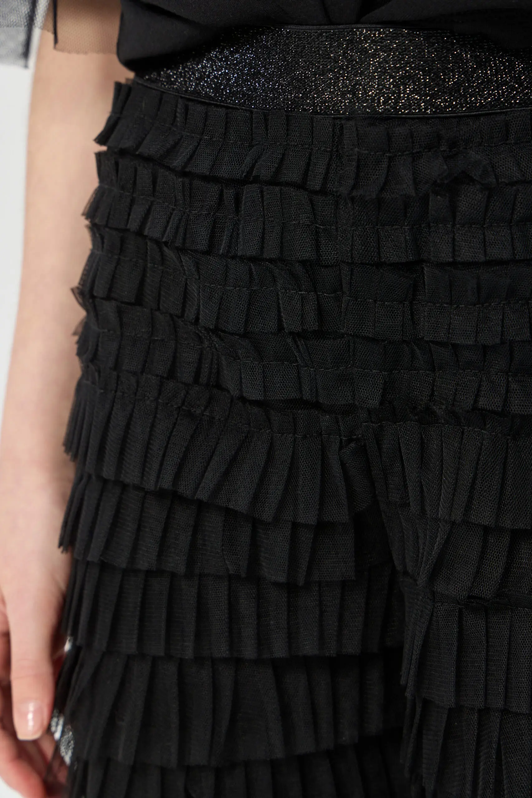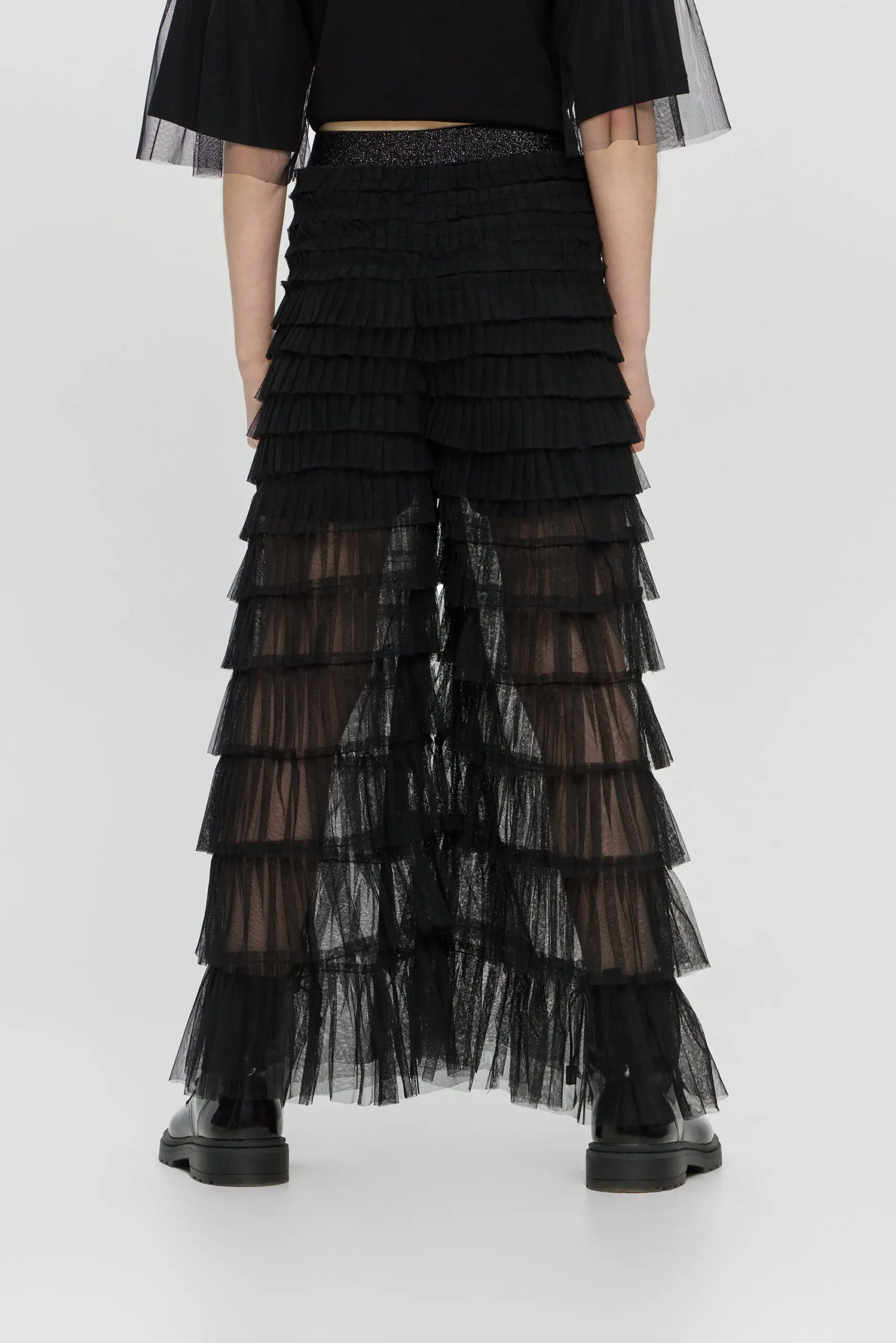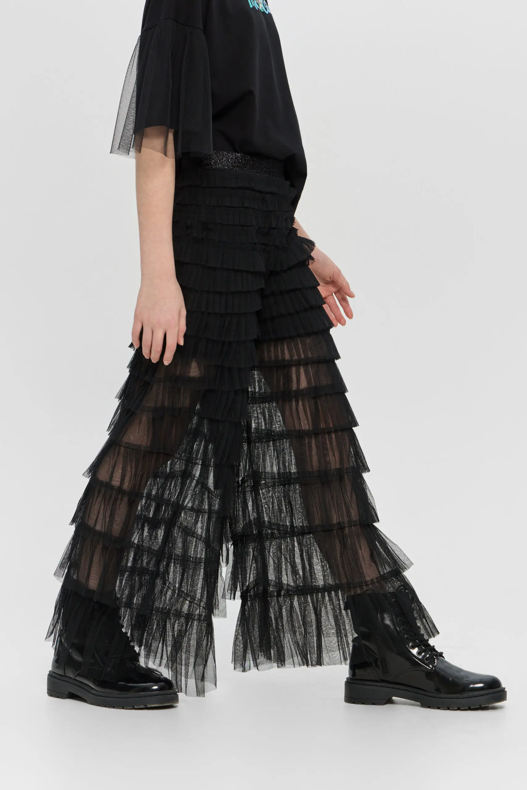 Брюки клеш для девочки — это эффектный и нарядный элемент гардероба, который идеально подойдет для особых случаев и вечеринок. Полупрозрачный материал придает им легкость и воздушность, создавая ... игривый и утонченный образ. Брюки имеют свободный силуэт с клешем от колена. Сетка в виде каскадов из воланов создает интересную текстуру. Черный цвет делает брюки универсальными. Эластичный пояс обеспечивает комфортную посадку.