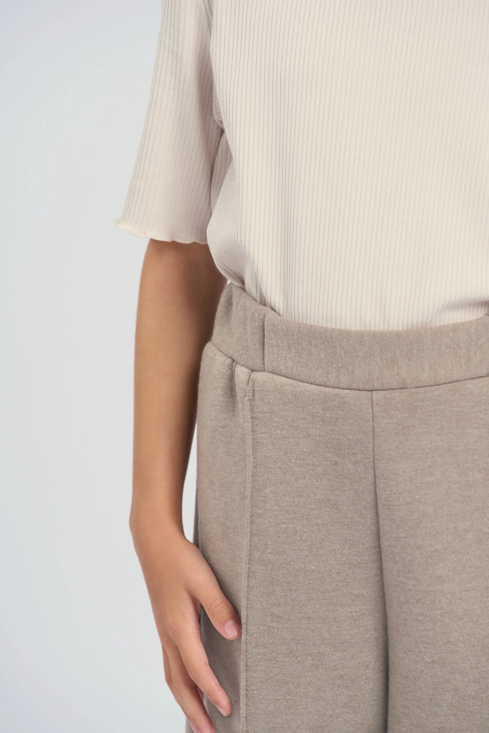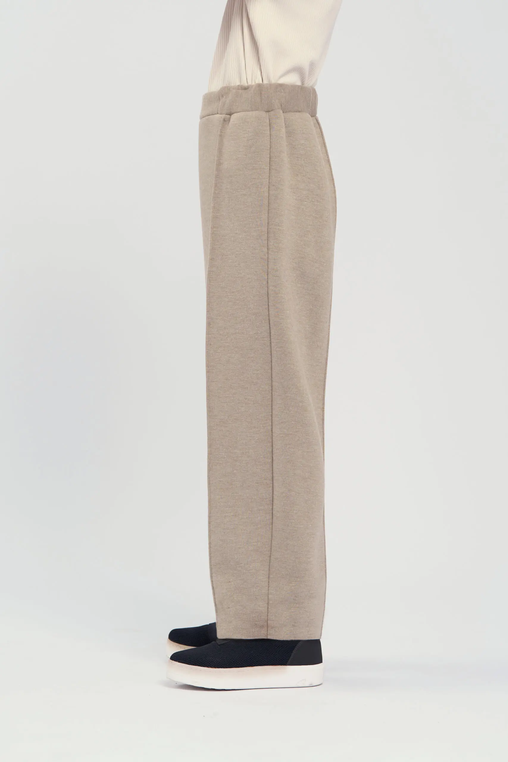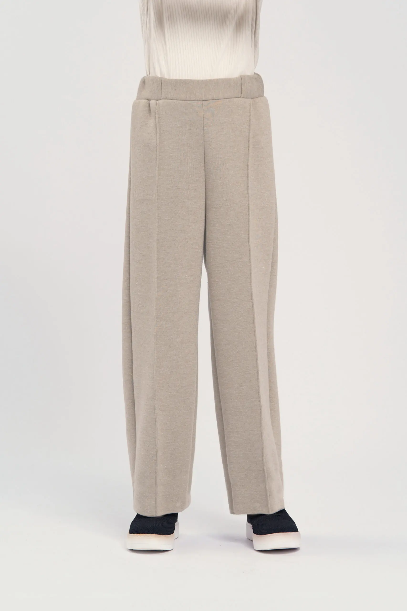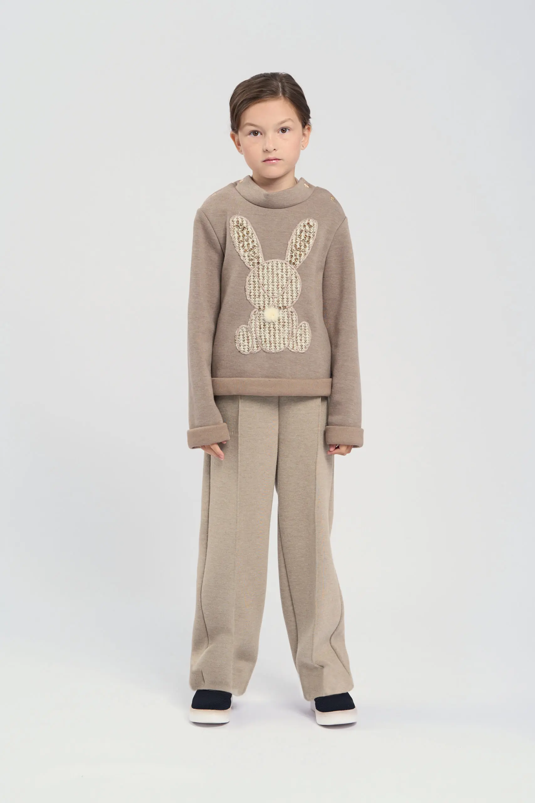 Брюки из трикотажа песочного оттенка для девочки сочетают комфорт и стильный дизайн. Эластичный пояс обеспечивает удобную посадку, позволяет брюкам адаптироваться к фигуре и обеспечивает комфорт в ... течение дня. Простроченные стрелки добавляют модели строгий, классический вид, придают силуэту аккуратность. Контрастные отвороты на брюках создают интересный акцент. Брюки легко комбинируются с различным верхом — от повседневных футболок до более формальных блузок.