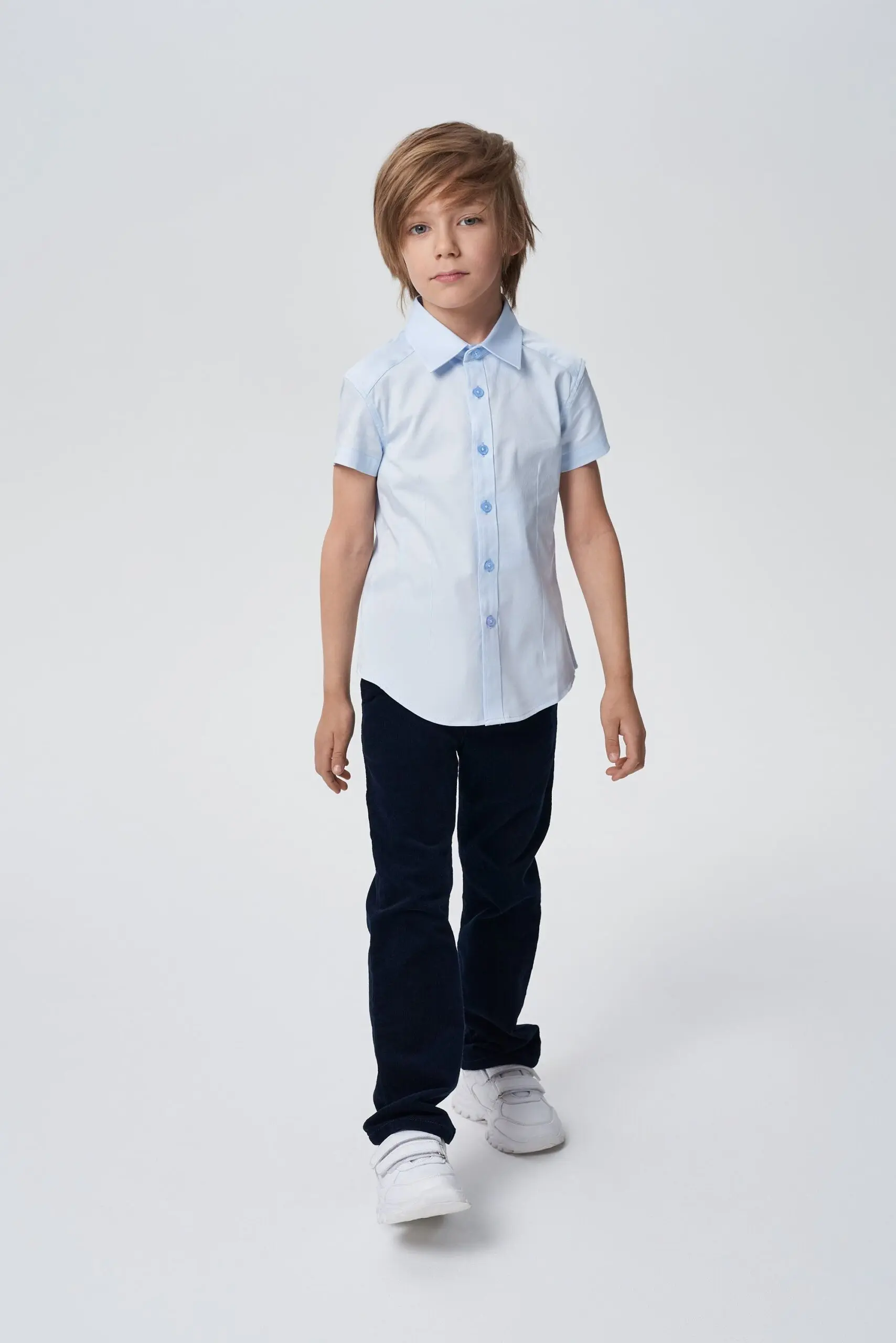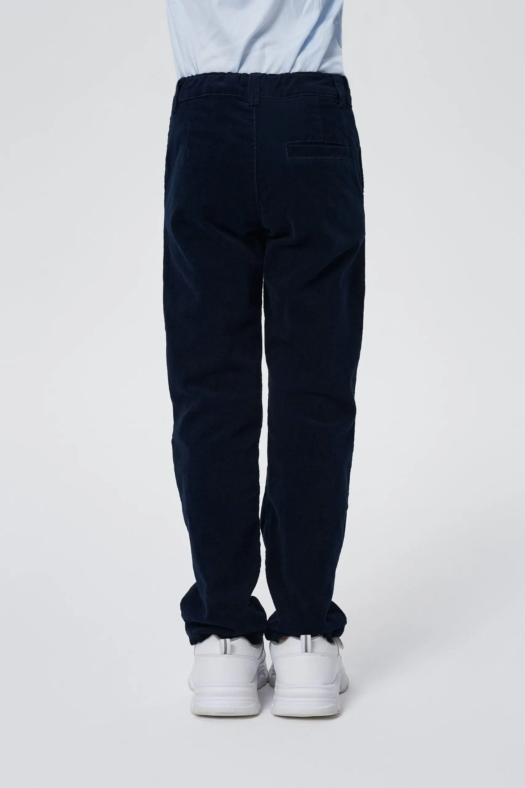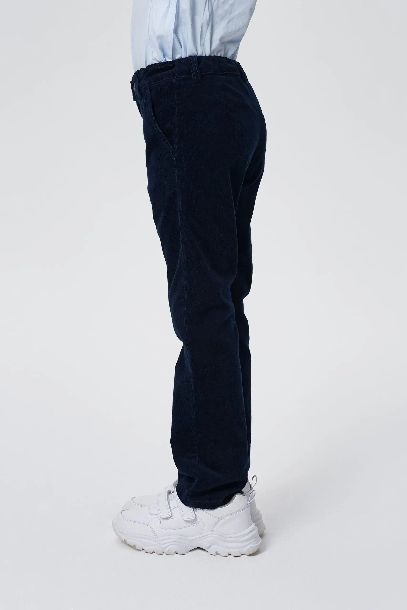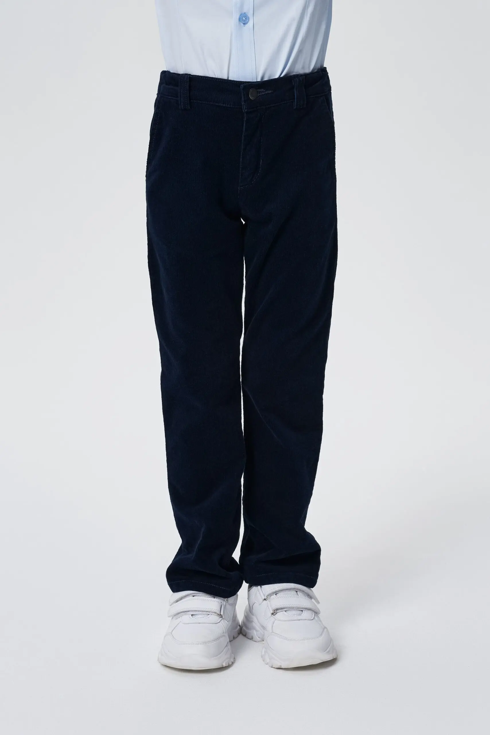 Синие прямые брюки для мальчика сочетают строгость школьной формы с непринужденностью одежды в повседневном стиле. Модель на притачном поясе со шлевками для ремня выполнена из вельветовой ... ткани с эффектом «варки». Спереди застежка на пуговицу с молнией.