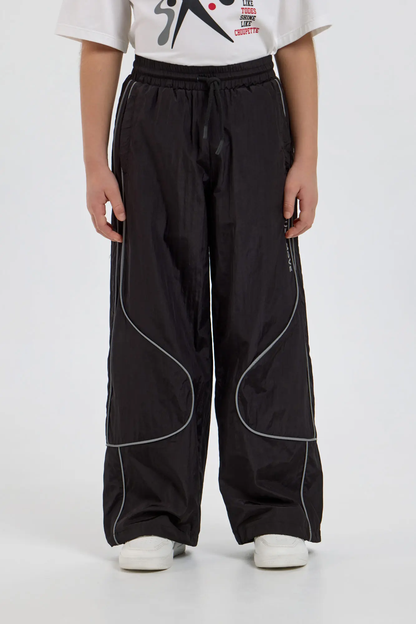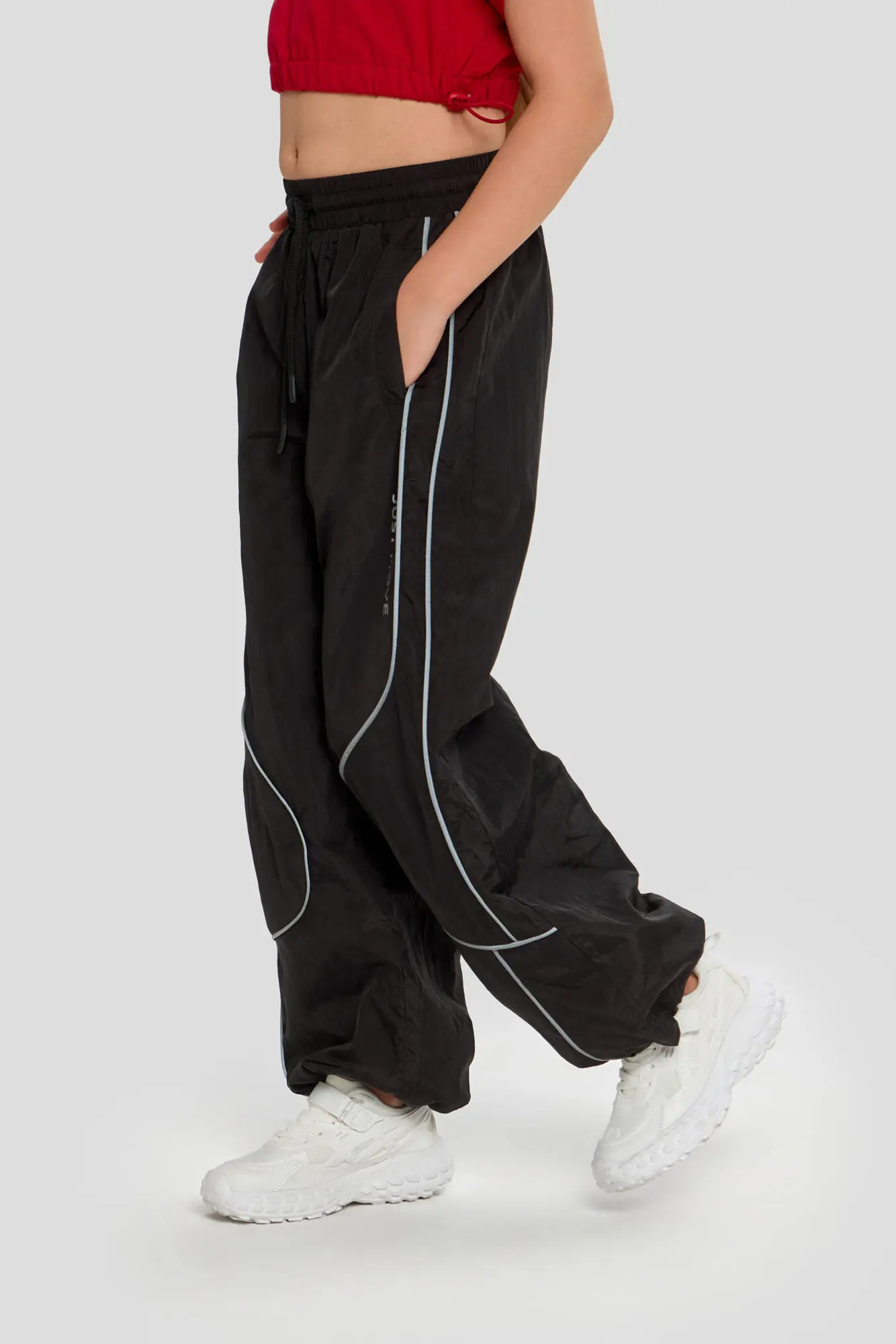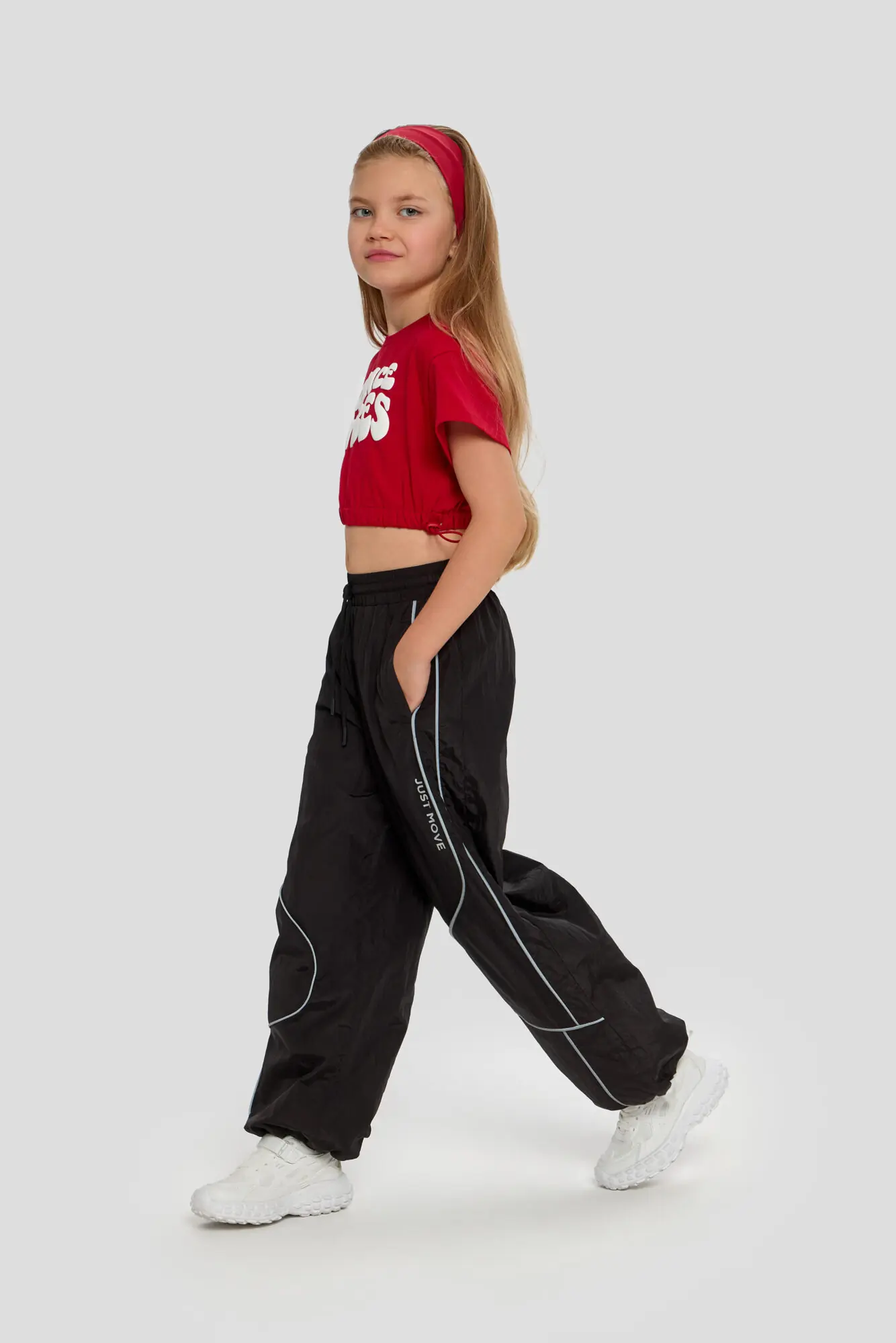 Спортивные брюки-джоггеры от коллекции TODES x Choupette для детей, украшенные светоотражающими кантами. Модель свободного кроя. Пояс на эластичной резинке дополнен кулиской. Аналогичная кулиска располагается по низу ... брючин, что позволяет регулировать посадку. Функциональность модели поддерживают карманы, вшитые в боковые швы. Стилистику завершает светоотражающая наклейка с надписью JUST MOVE, способствующая созданию яркого сценического образа. Данная модель оптимально подходит для танцевальных баттлов, репетиций и выступлений. А также для активных тренировок и повседневного использования. Светящиеся элементы делают их универсальными для формирования как уличного, так и сценического лука. Идеальный выбор для кэжуал-образов и выходов на танцевальные соревнования. Рекомендуются для направлений: стрит, хип-хоп, контемпорари.