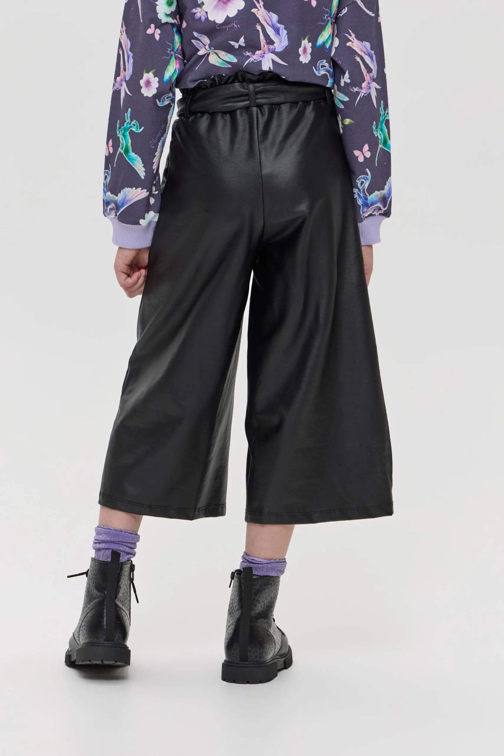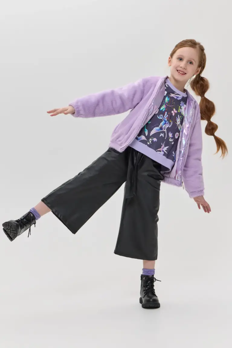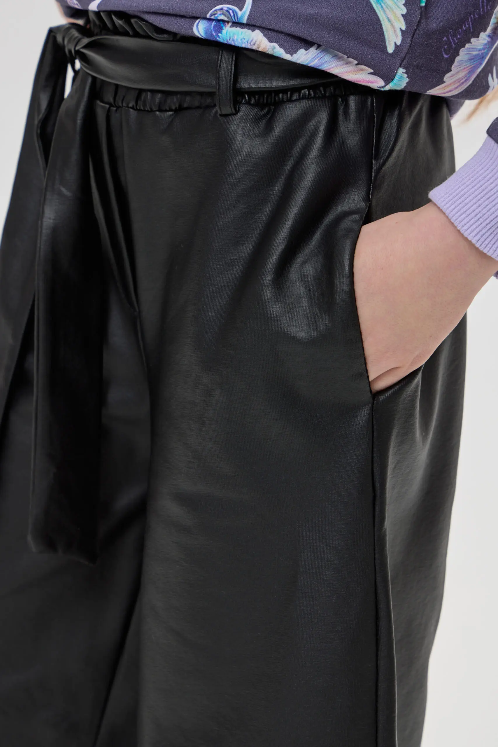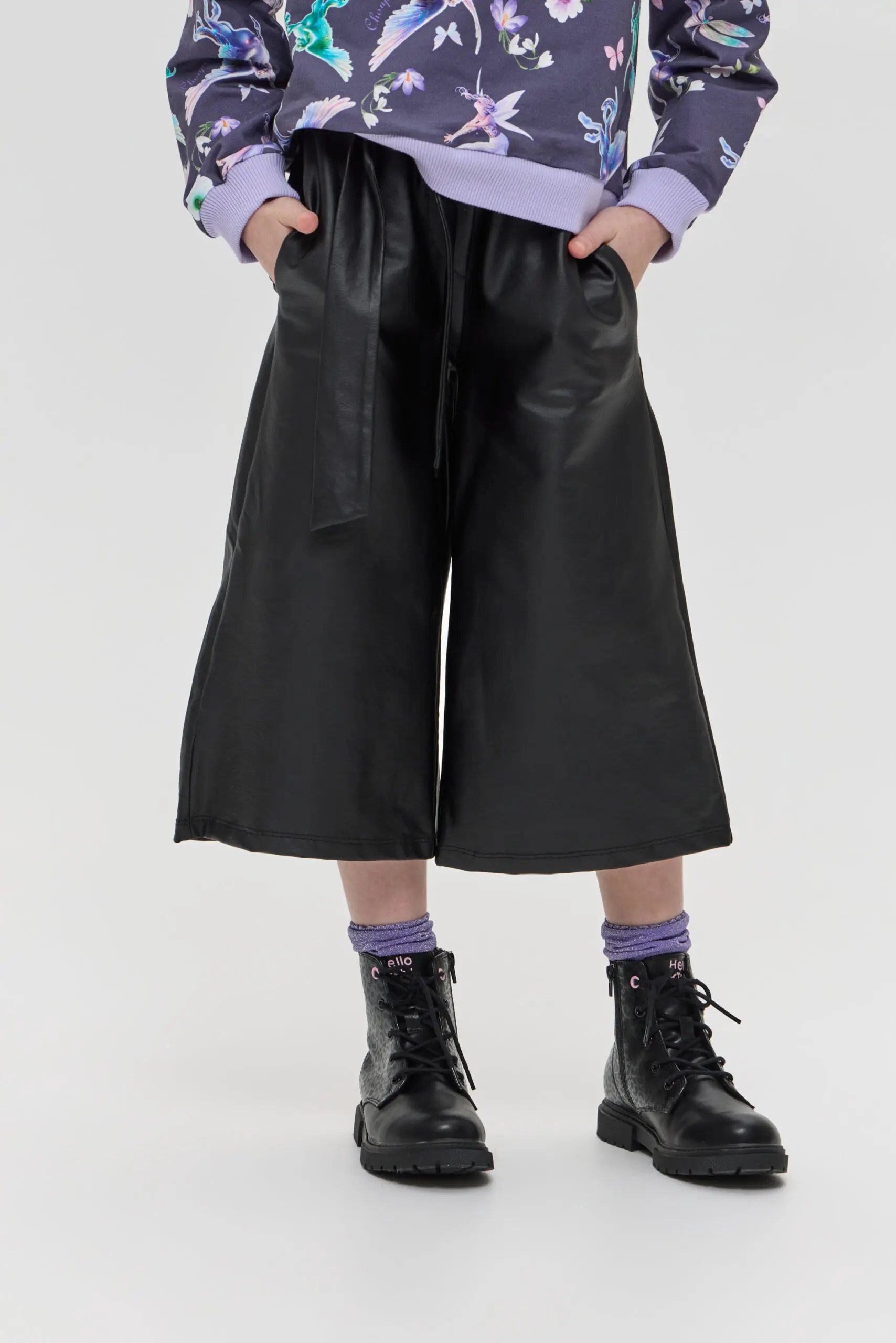 Брюки-кюлоты для девочки выполнены в стильном черном цвете. Материал с эффектом кожи создает модный и современный вид, идеально подходящий для создания как повседневных, так и более ... нарядных ансамблей. Такой стильный элемент гардероба может стать основой для множества образов, позволяя девочке экспериментировать с разными сочетаниями. Эластичный пояс с бантом добавляет брюкам не только удобство, но и игривый акцент. Брюки-кюлоты можно сочетать с различными топами, от простых футболок до более нарядных блузок. Благодаря универсальному дизайну и оригинальным деталям, такие брюки станут любимым элементом гардероба каждой девочки, позволяя ей проявить свою индивидуальность и стиль.