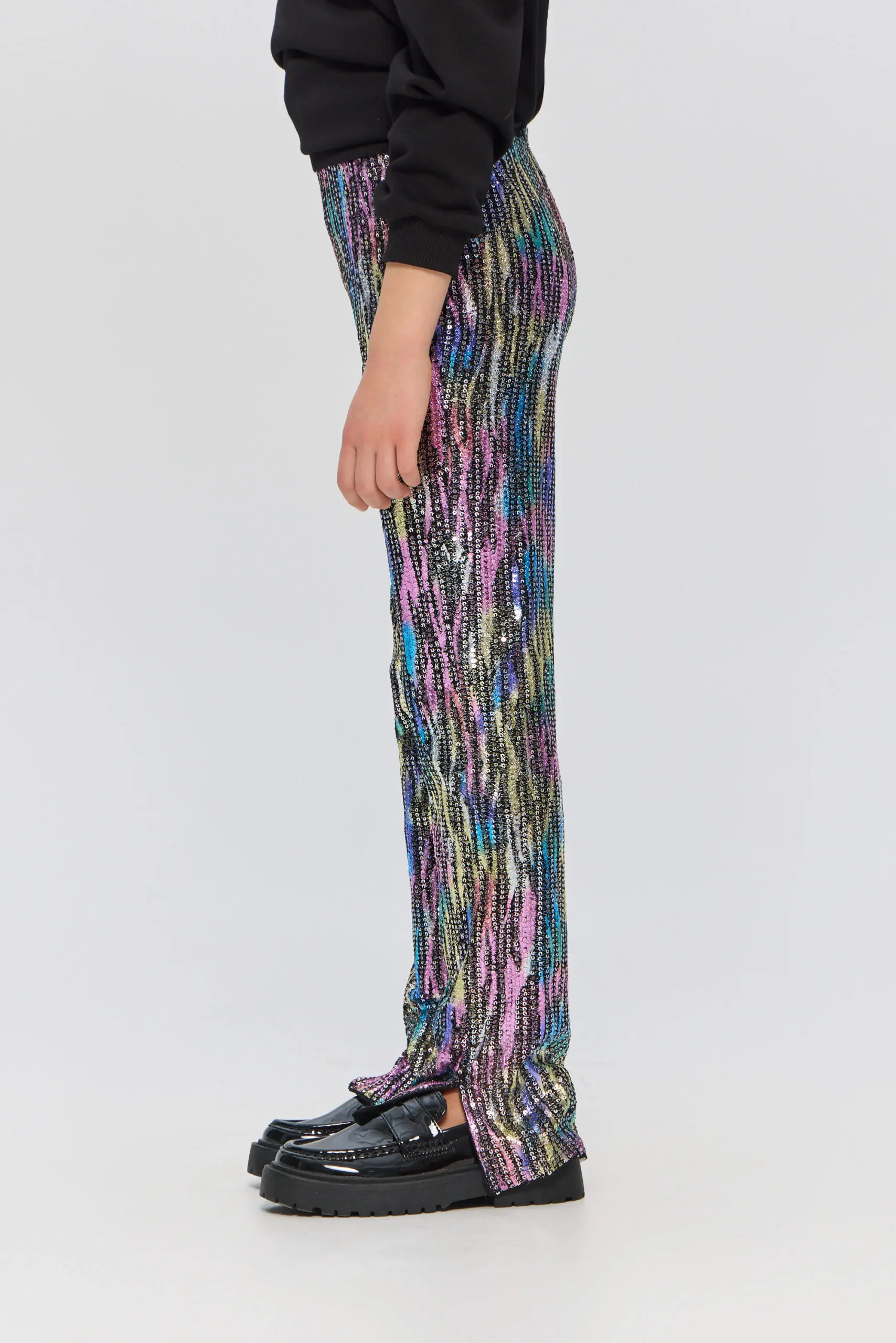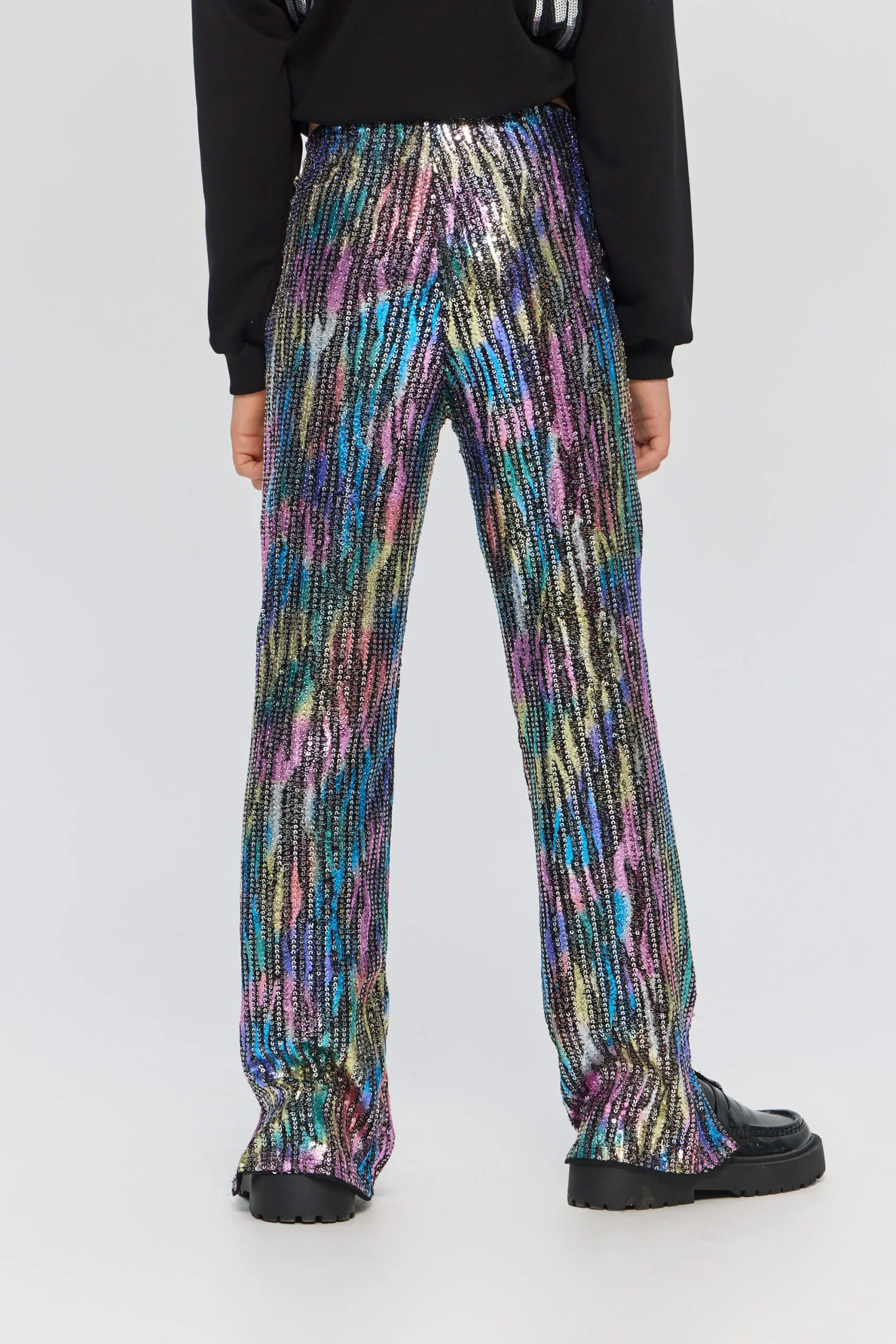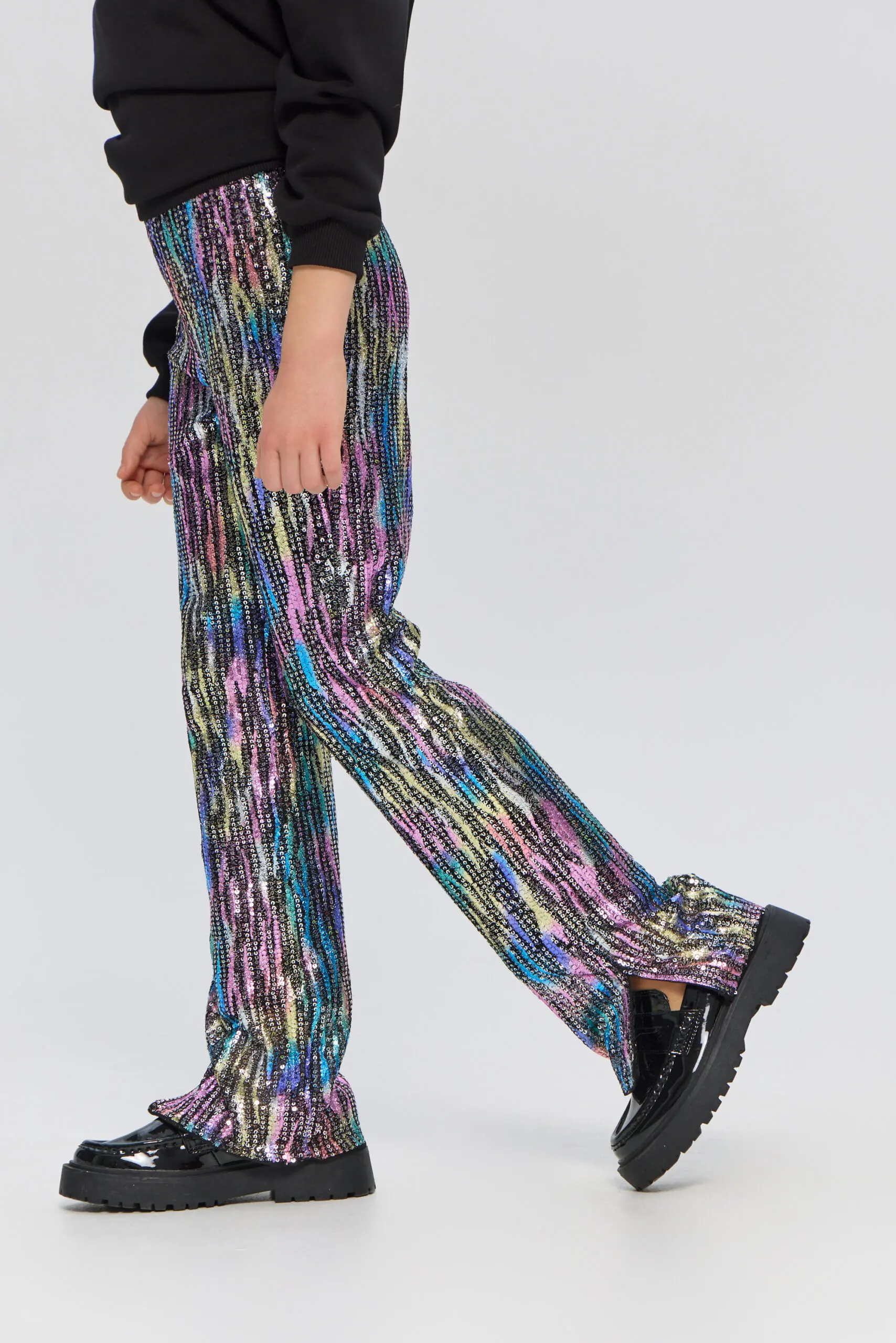 Брюки с пайетками — настоящий модный хит! Пайетки, сверкающие на свету, добавляют блеска, что делает модель идеальным выбором для праздников, вечеринок или особых случаев. Расклешенный силуэт ... создает легкость и динамичность, позволяя ребенку свободно двигаться и чувствовать себя комфортно. Сочетая эти брюки с простыми топами или блузками, можно создать гармоничный образ, где акцент будет сделан именно на блестящих брюках.