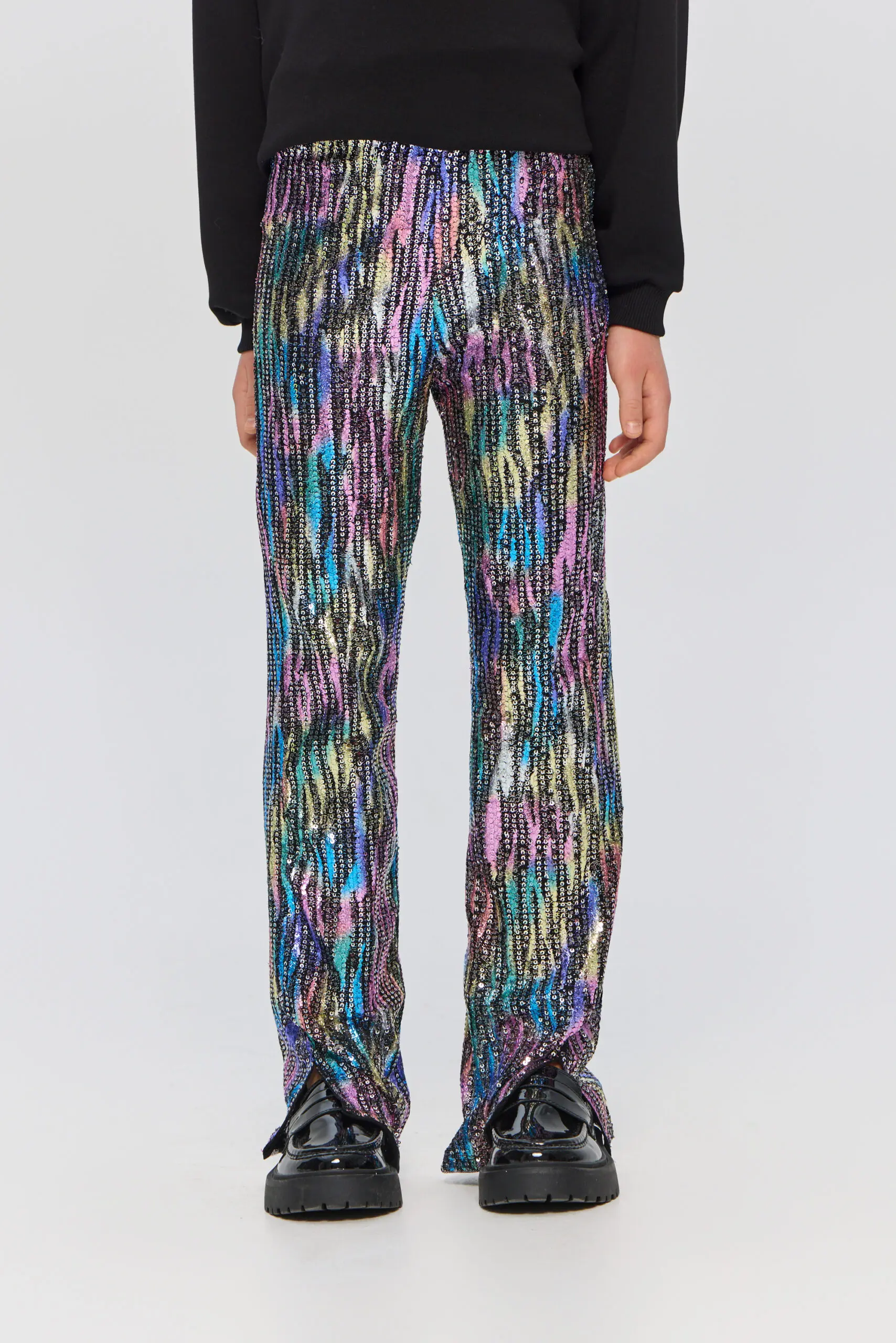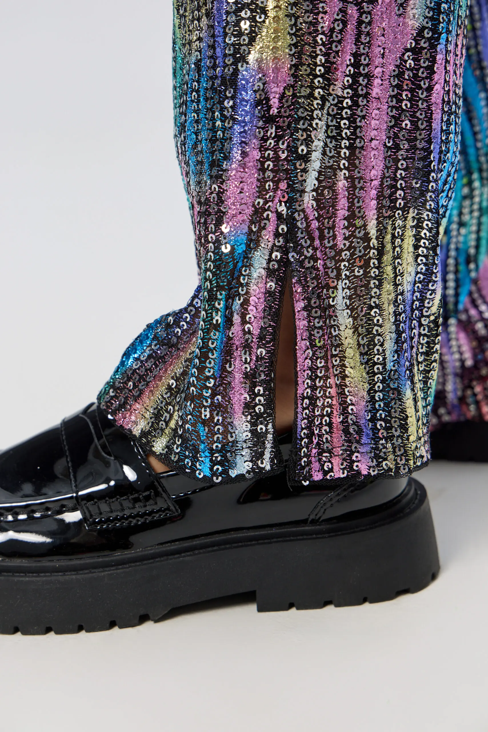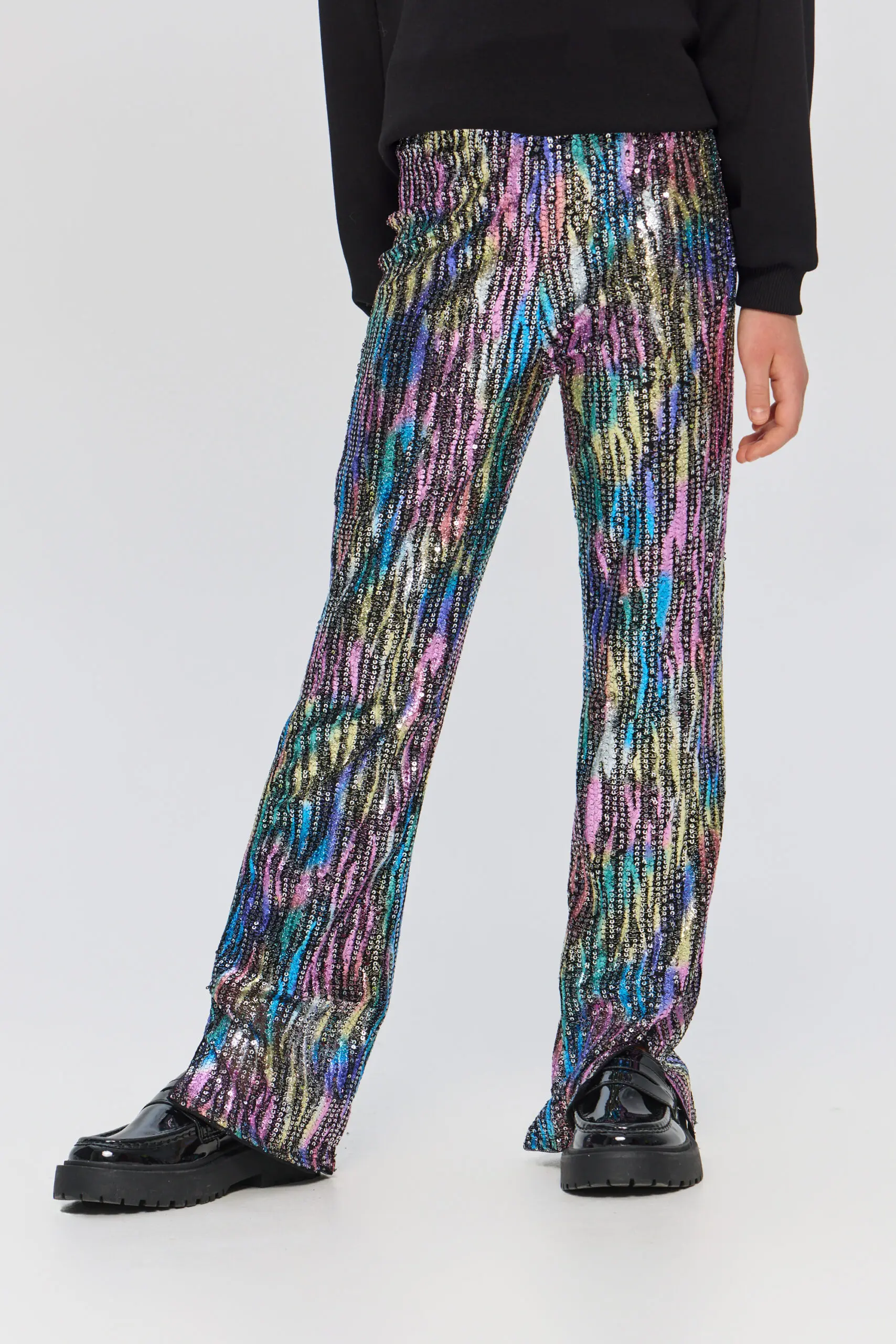 Брюки с пайетками — настоящий модный хит! Пайетки, сверкающие на свету, добавляют блеска, что делает модель идеальным выбором для праздников, вечеринок или особых случаев. Расклешенный силуэт ... создает легкость и динамичность, позволяя ребенку свободно двигаться и чувствовать себя комфортно. Сочетая эти брюки с простыми топами или блузками, можно создать гармоничный образ, где акцент будет сделан именно на блестящих брюках.