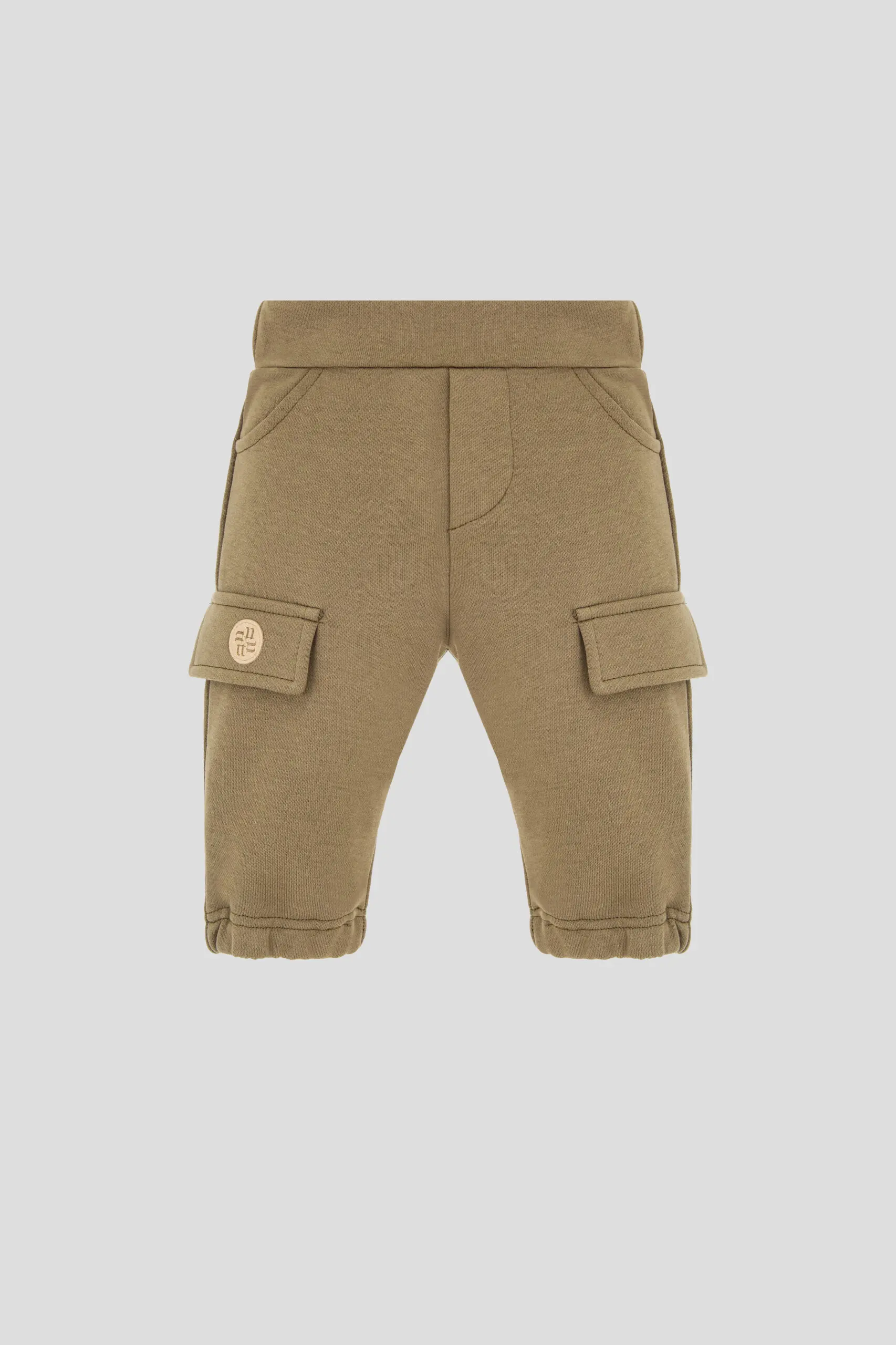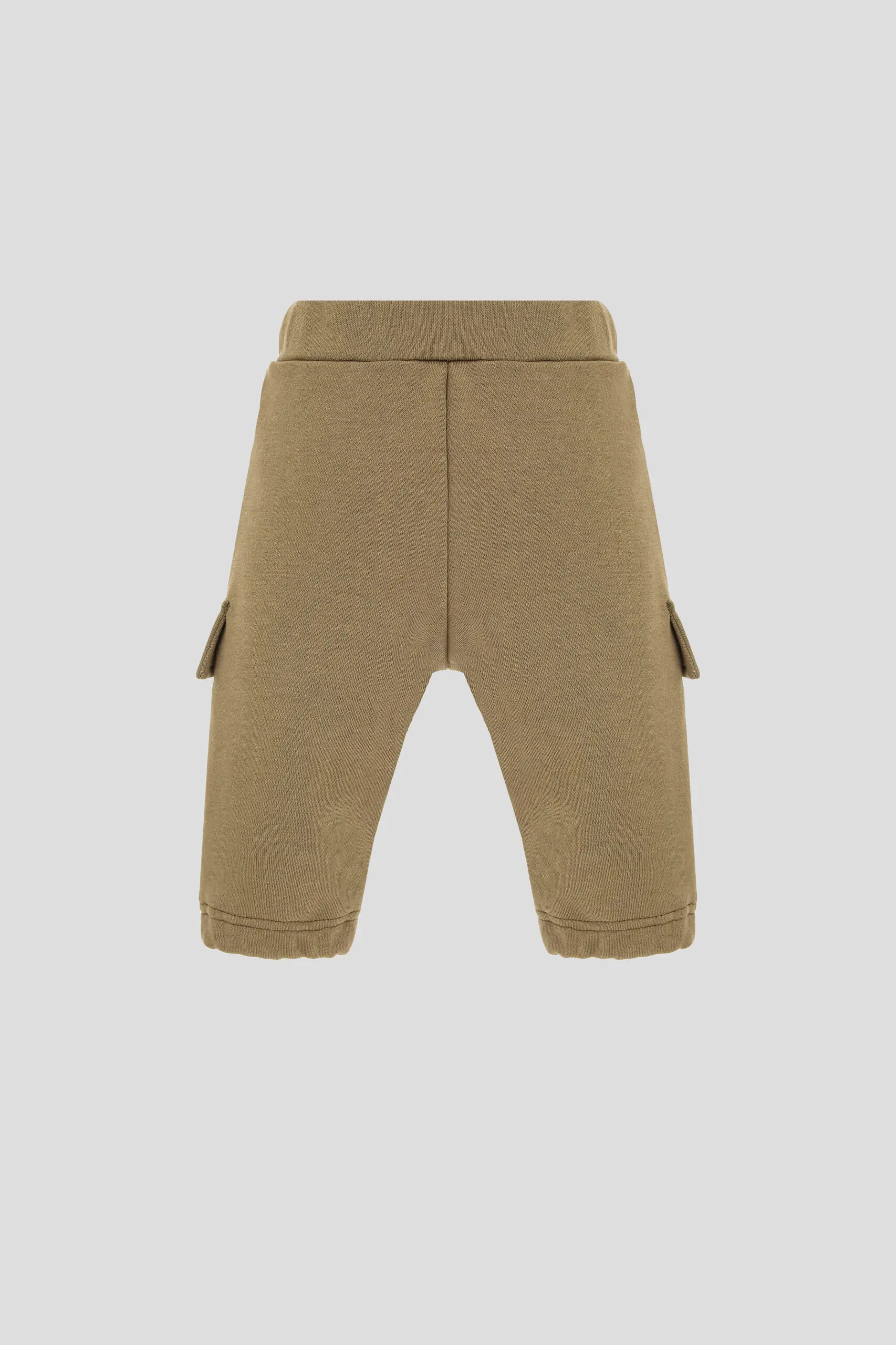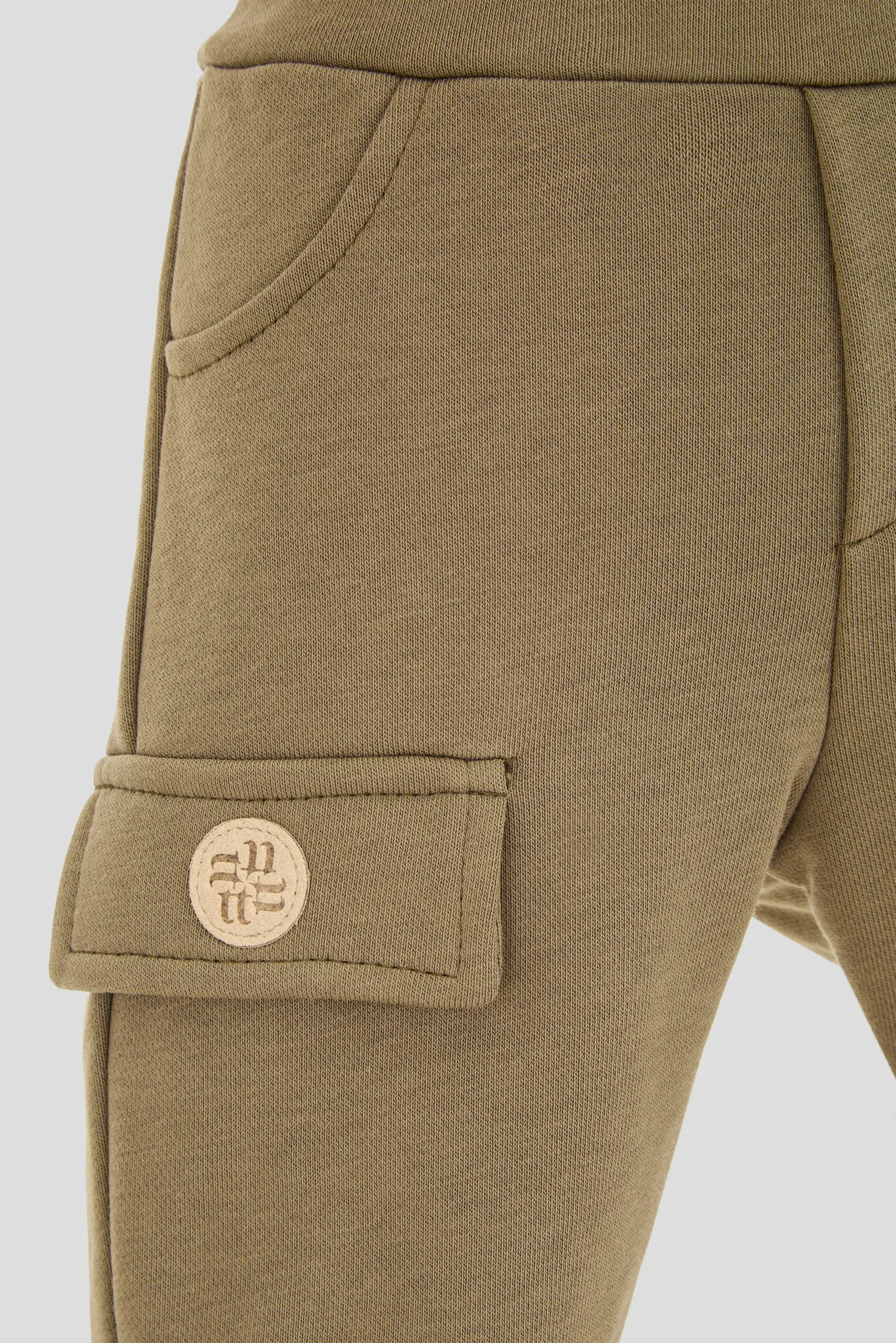Стильные брюки для мальчика в цвете хаки. Модель выполнена из трикотажного полотна. Удобная эластичная резинка на поясе и манжеты на брючинах обеспечивает надежную посадку. Карманы-обманки дополнительно ... украшают дизайн. Натуральный состав ткани говорит о безопасности одежды для ребенка. Украшает брюки декор с логотипом брэнда.