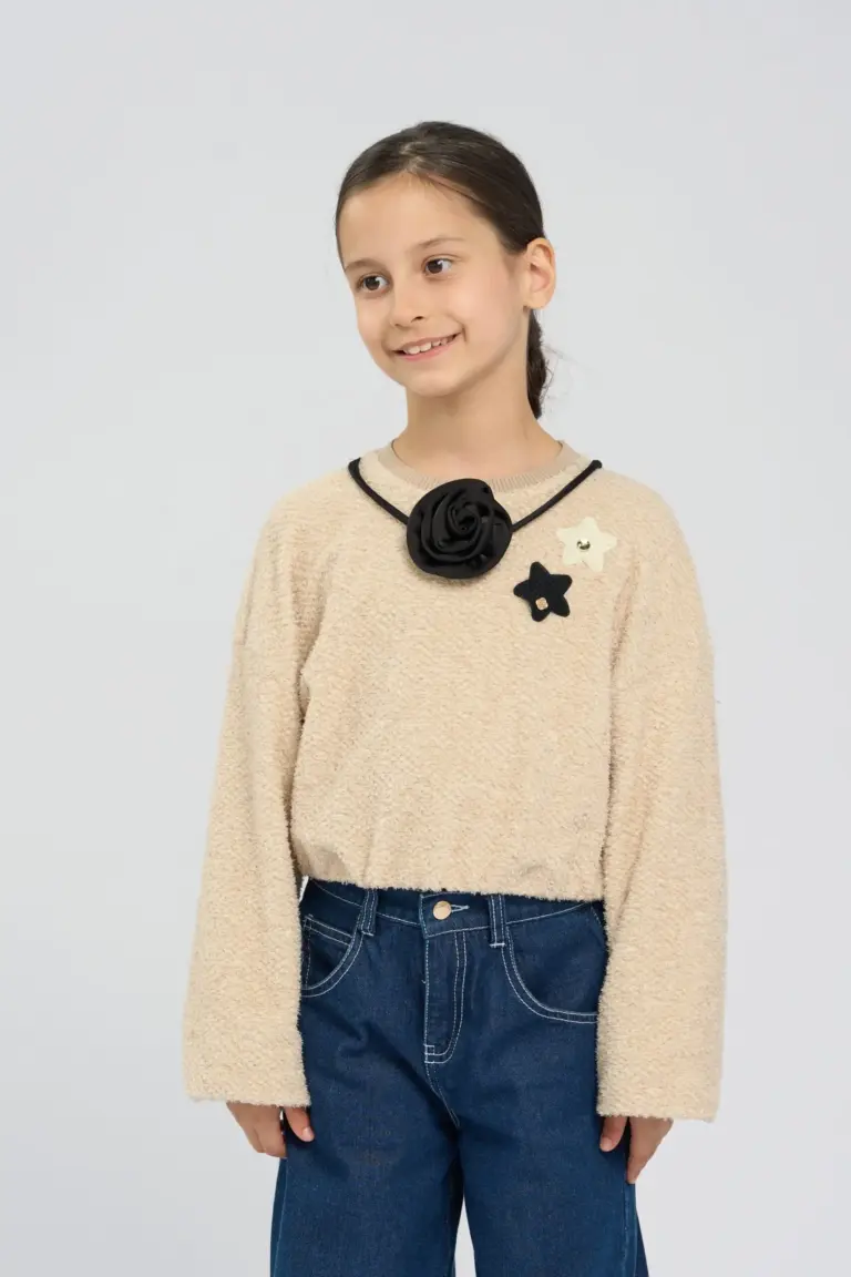 Модный джемпер для девочки выполнен из мягкого пушистого трикотажа, который обеспечивает тепло и комфорт. Люрекс добавляет блеск и делает модель более праздничной. Спущенная линия плеча дарит ... движениям ребенка комфорт. Нежный бежевый оттенок легко комбинируется с различными элементами гардероба и подходит для разных случаев. Уникальный декор в виде объемного цветка под вырезом придает джемперу оригинальность. Свободный и комфортный крой позволяет легко сочетать джемпер с любым низом.