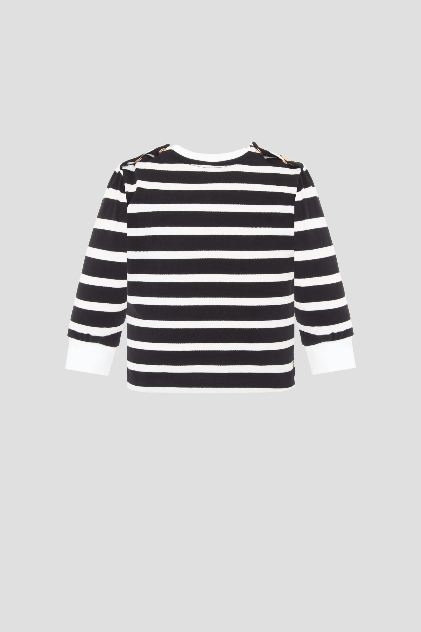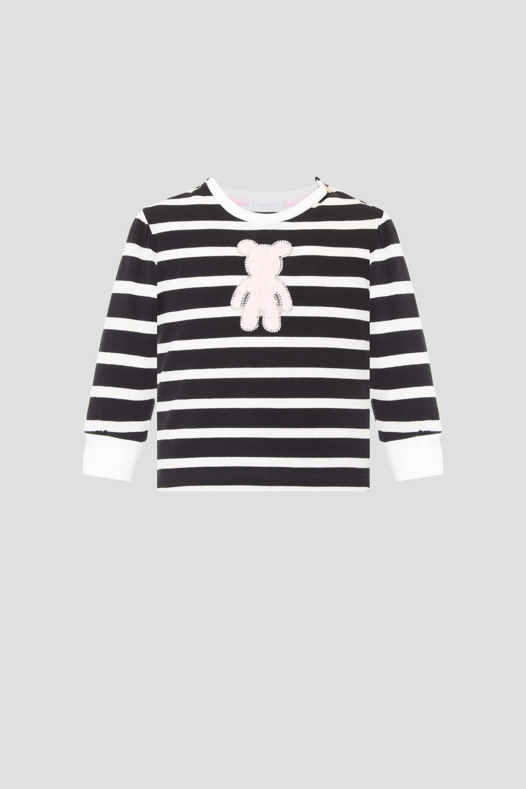 Полосатый принт придаёт ... изделию игривый и модный вид, а декор в виде милого медвежонка добавляет нотку очарования. Свободный крой не стесняет движений. Удобные манжеты на рукавах надежно фиксируют джемпер на месте, не позволяя ему сползать, а кнопки на плечиках значительно упрощают процесс одевания и снимают лишние хлопоты с родителей.