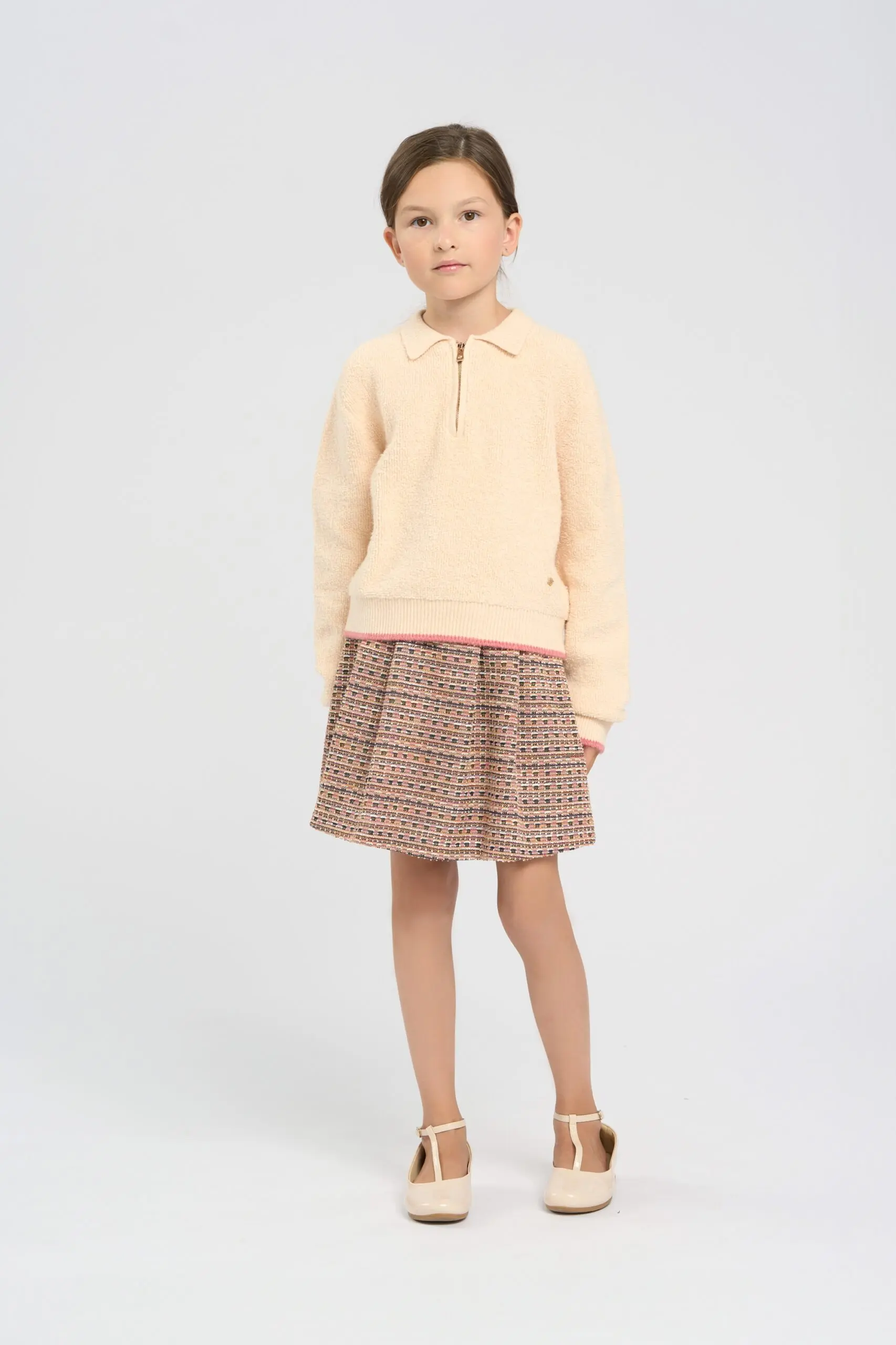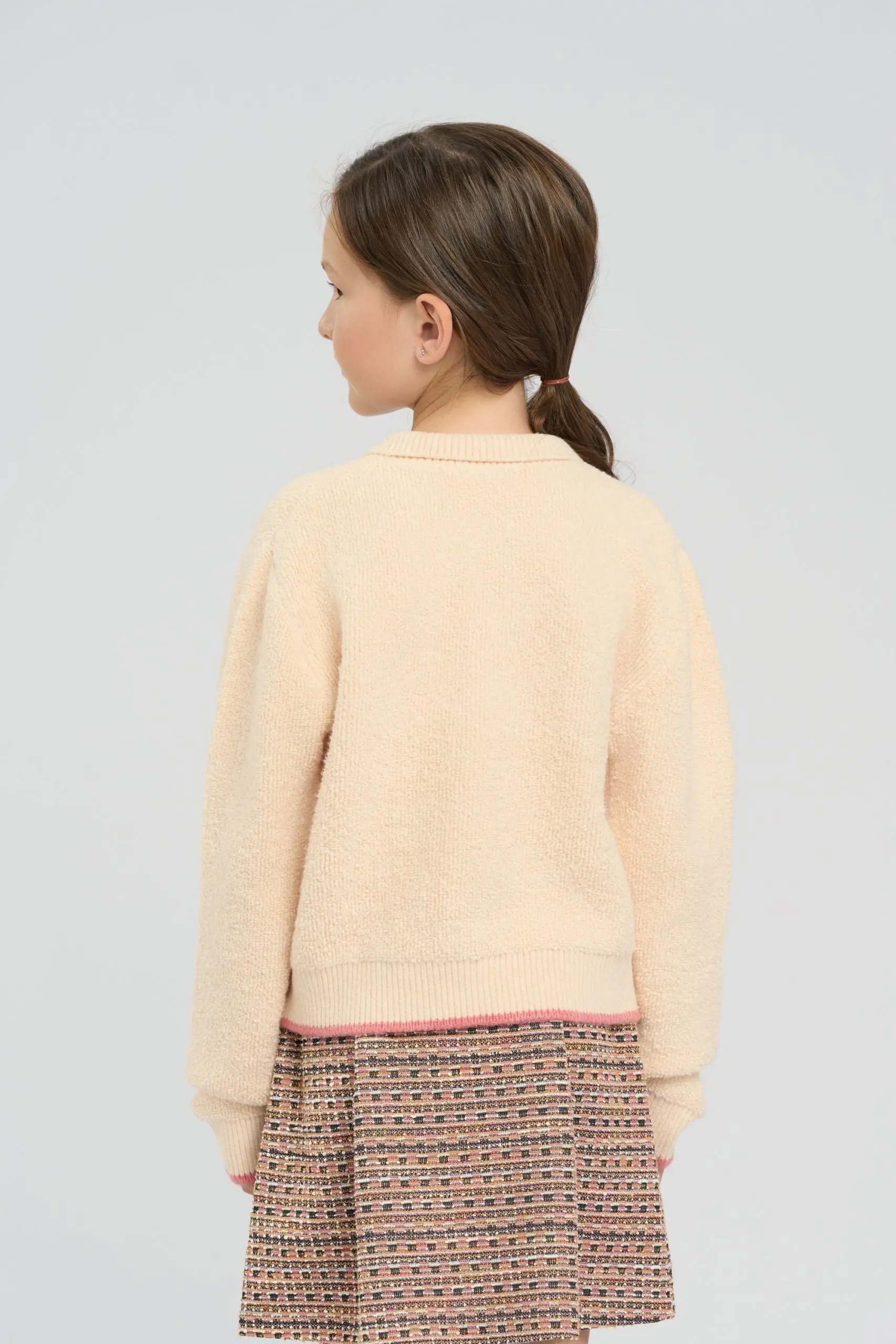 Вязаный джемпер изготовлен из мягкой пряжи элегантного цвета «пыльная роза». Такой оттенок легко комбинируется с различными элементами гардероба, делая модель универсальным выбором для повседневной носки. Удобная ... молния спереди позволяет регулировать уровень выреза горловины и добавляет оригинальности в дизайн. Джемпер имеет свободный крой, что обеспечивает ребенку комфорт и свободу движений. Эластичные манжеты и окантовка по низу делают посадку удобной.