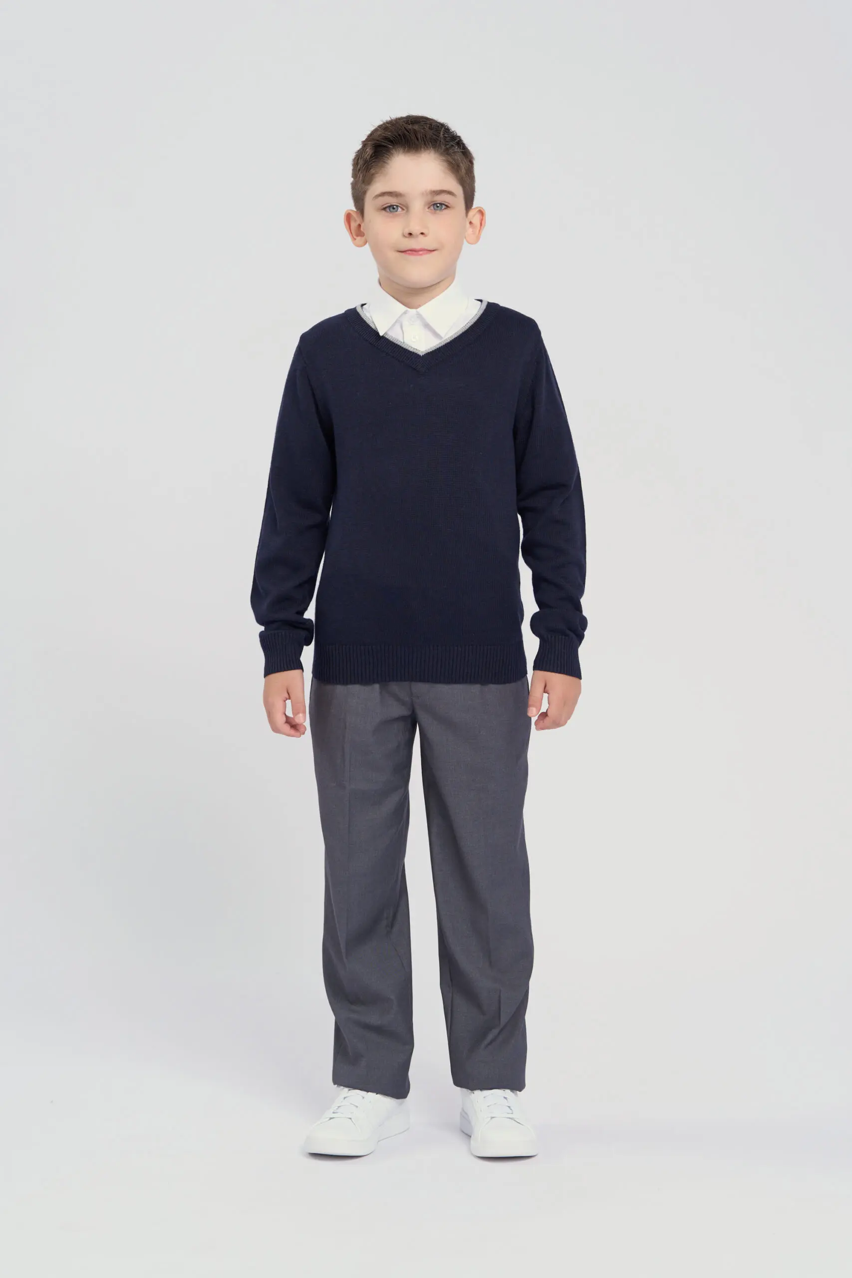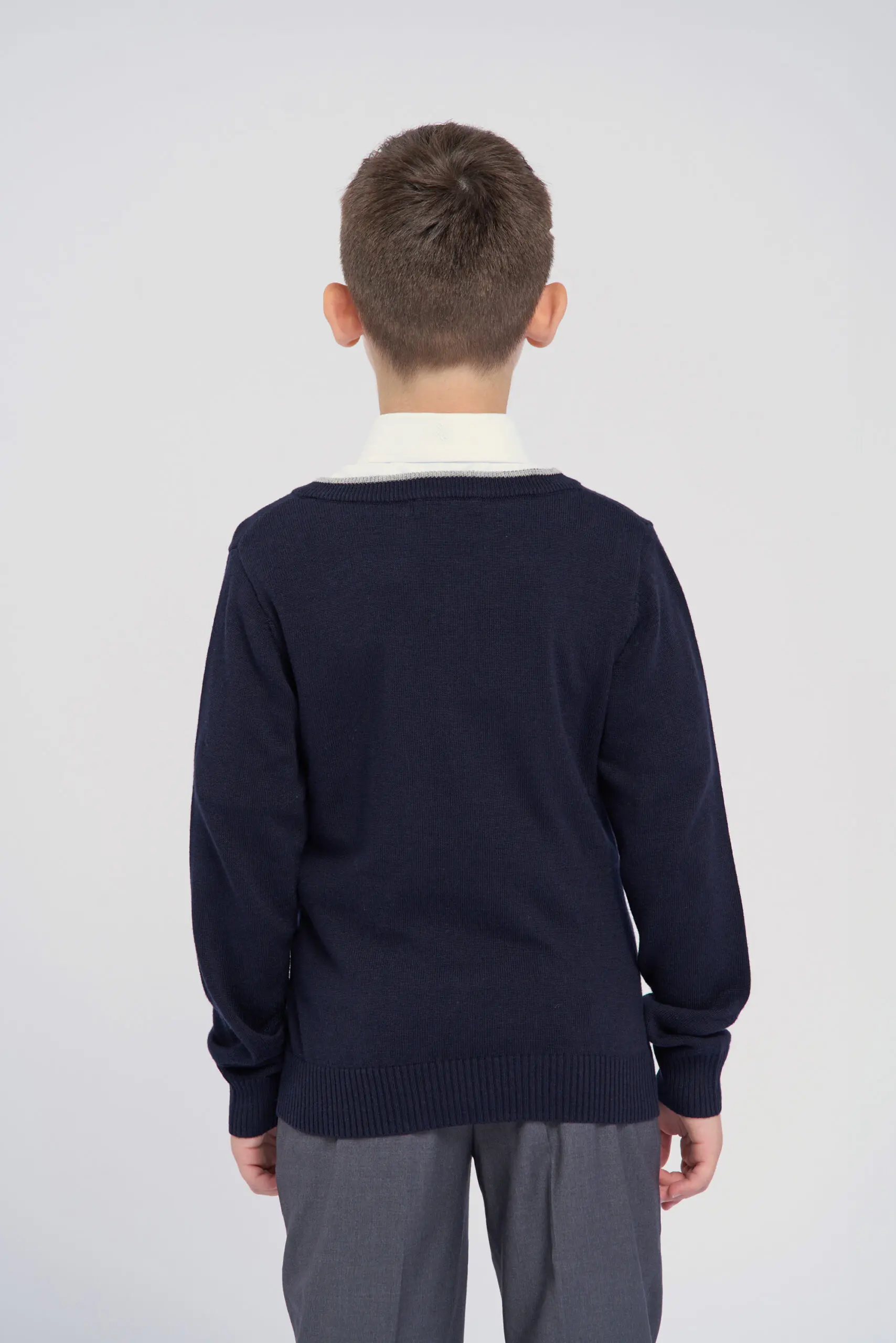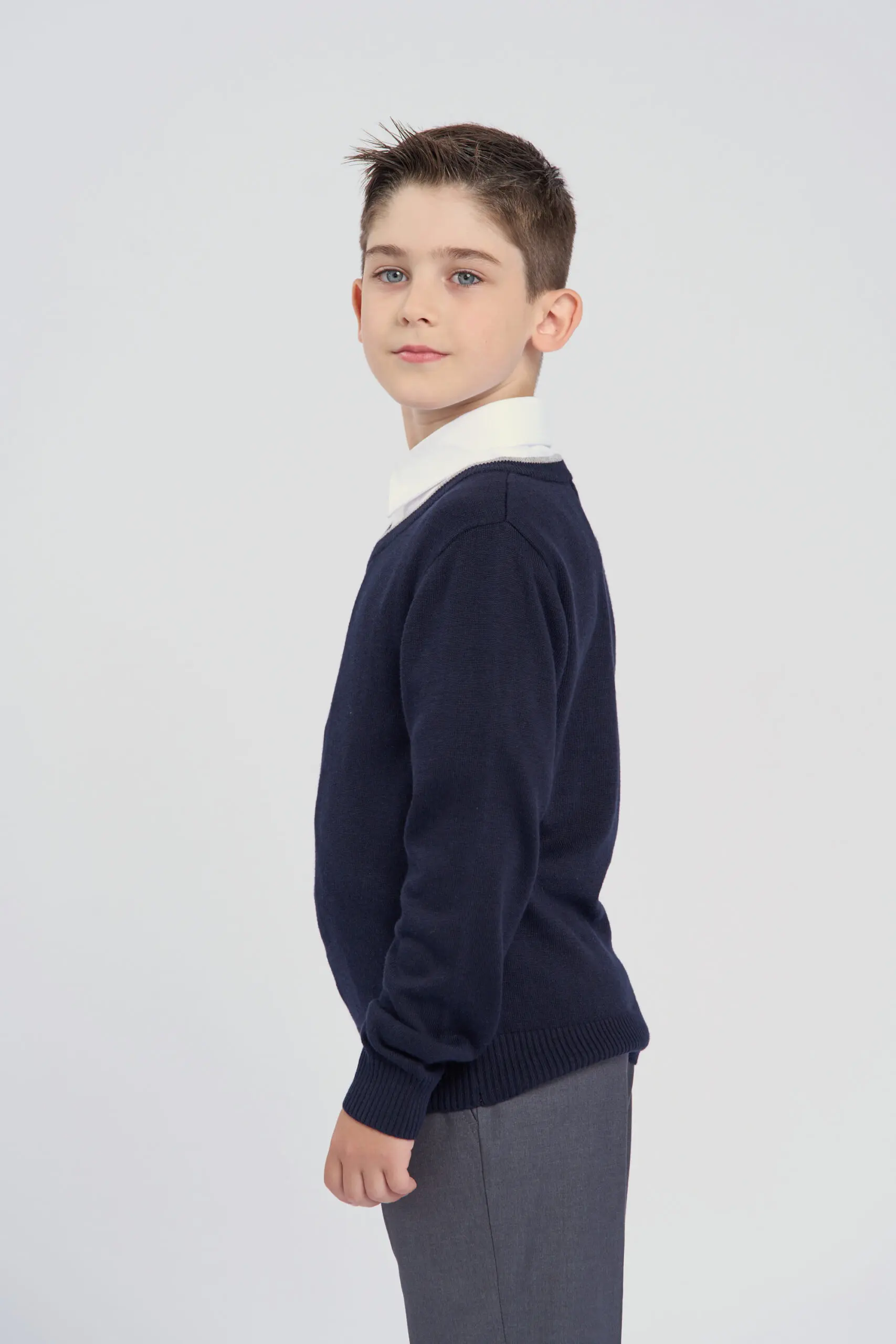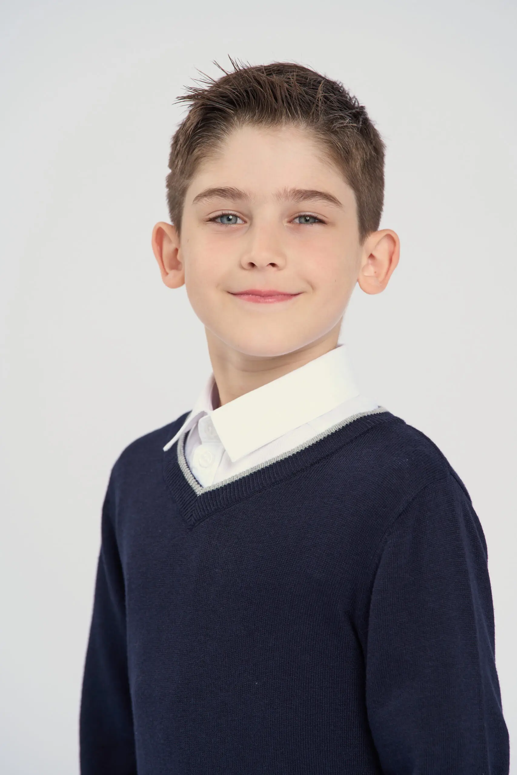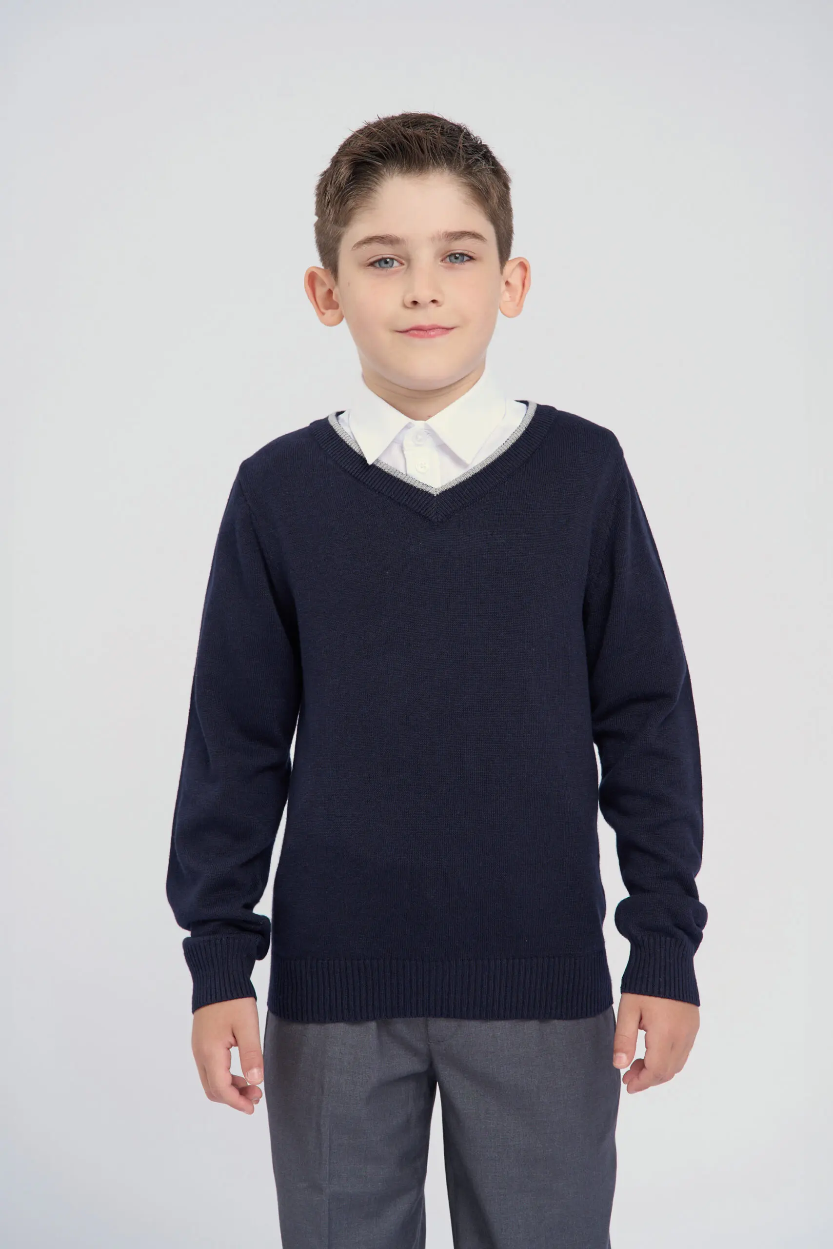 Синий вязаный джемпер из хлопка и вискозы следует обязательно включать в школьную капсулу, если это