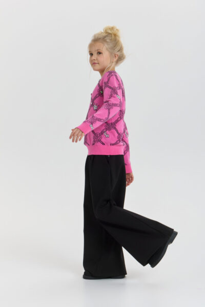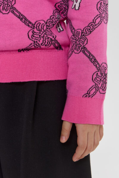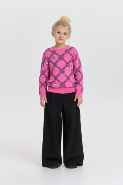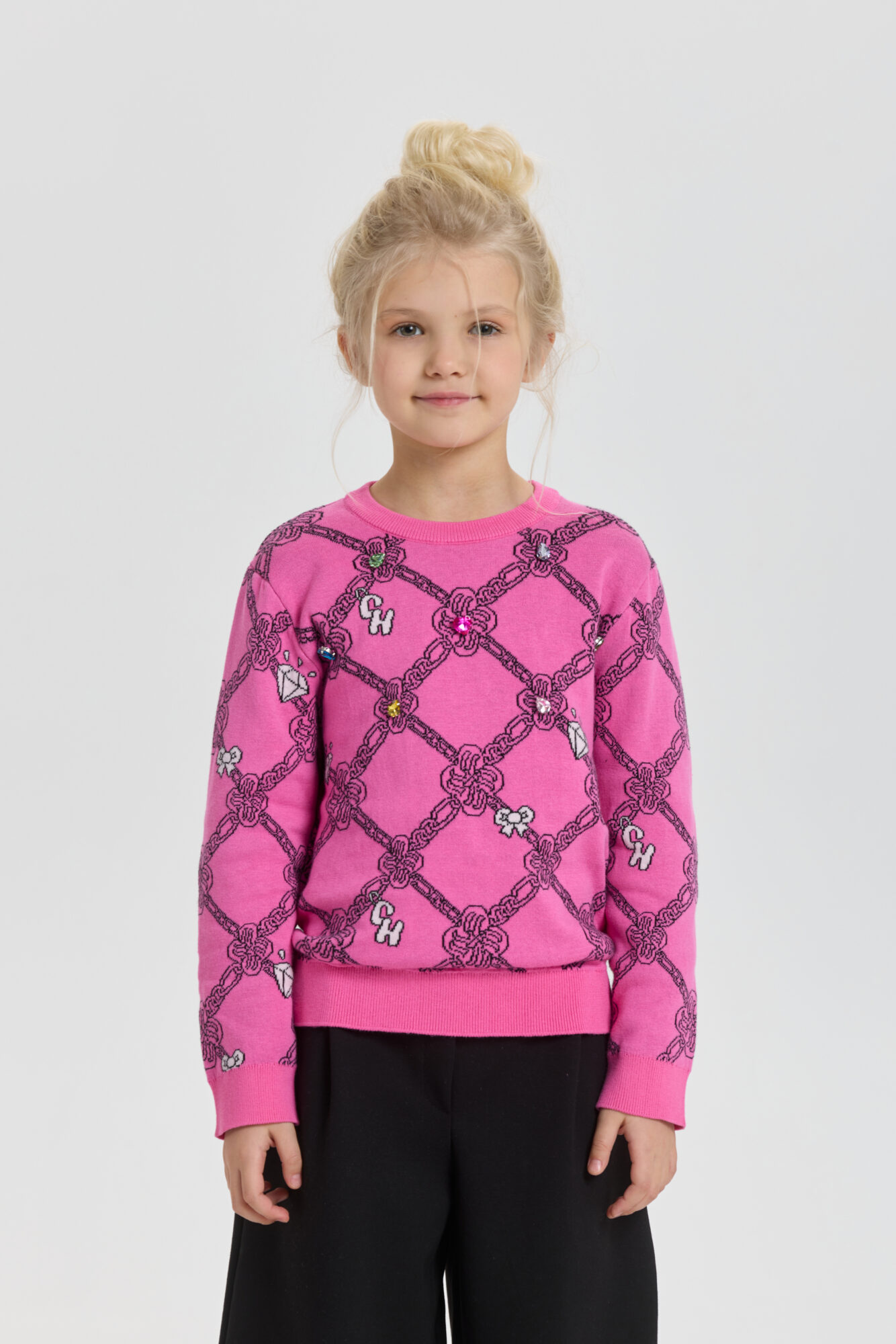 Яркий вязаный джемпер цвета фуксии станет отличным дополнением к весенне-летнему гардеробу вашего ребёнка. Свободный фасон с длинными рукавами обеспечивает комфорт. Эластичная трикотажная резинка на манжетах и ... по низу изделия обеспечивают идеальную посадку. Оригинальный дизайнерский принт придает модели уникальность. Этот джемпер идеально сочетается с юбками, брюками и джинсами, создавая стильный образ.
