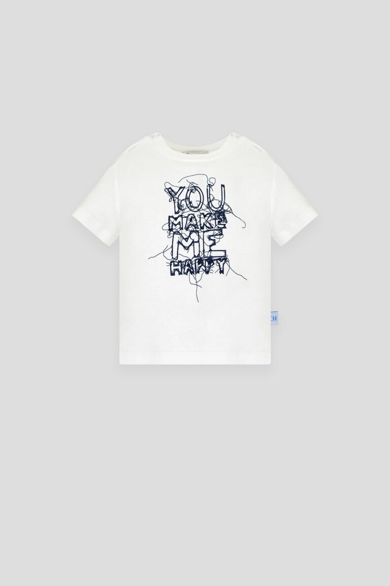 Лаконичная футболка в мягком светлом оттенке станет удобной и стильной частью детского гардероба. Модель прямого кроя выполнена из приятного к телу трикотажа, обеспечивающего комфорт в течение ... всего дня и хорошую воздухопроницаемость. Центральный акцент — контрастный графичный принт с динамичным шрифтовым рисунком, который придаёт изделию современный характер и делает образ более выразительным. Круглый вырез и короткие рукава создают привычный и практичный силуэт, а аккуратные кнопки на плечах облегчают процесс переодевания. Такая футболка отлично подойдёт для активных будней, прогулок. Она легко сочетаясь с различными элементами одежды.