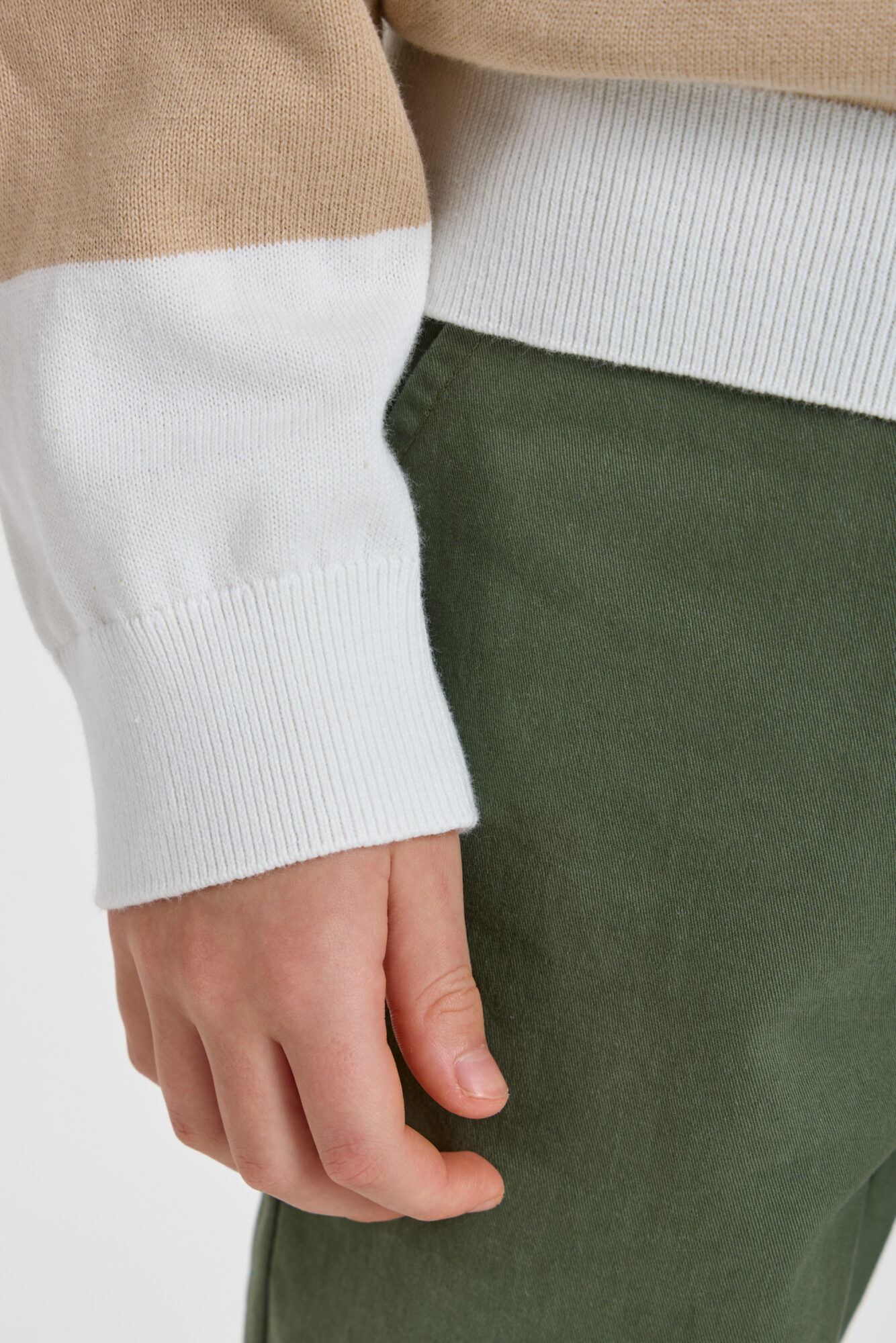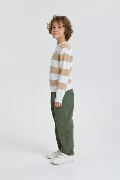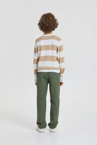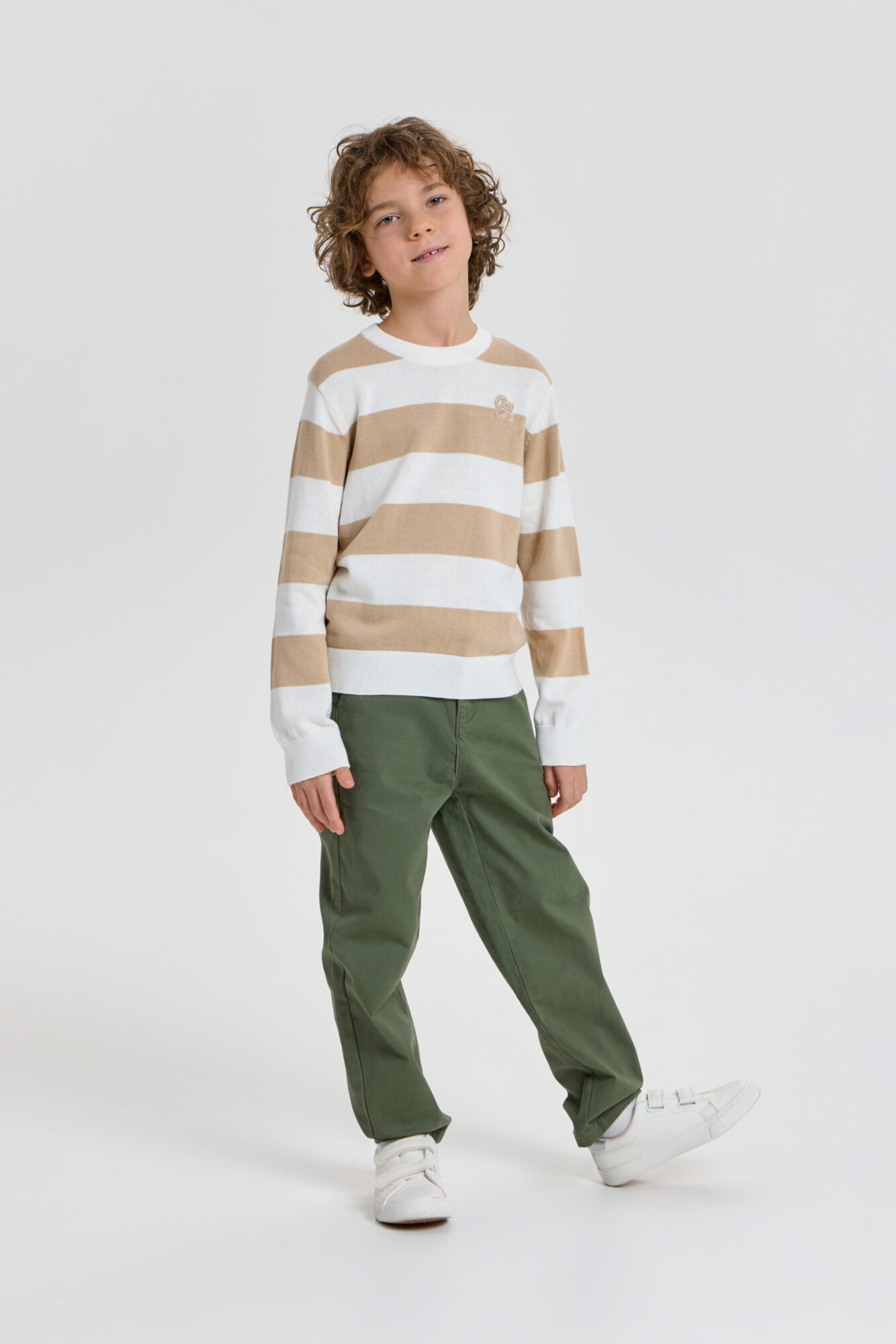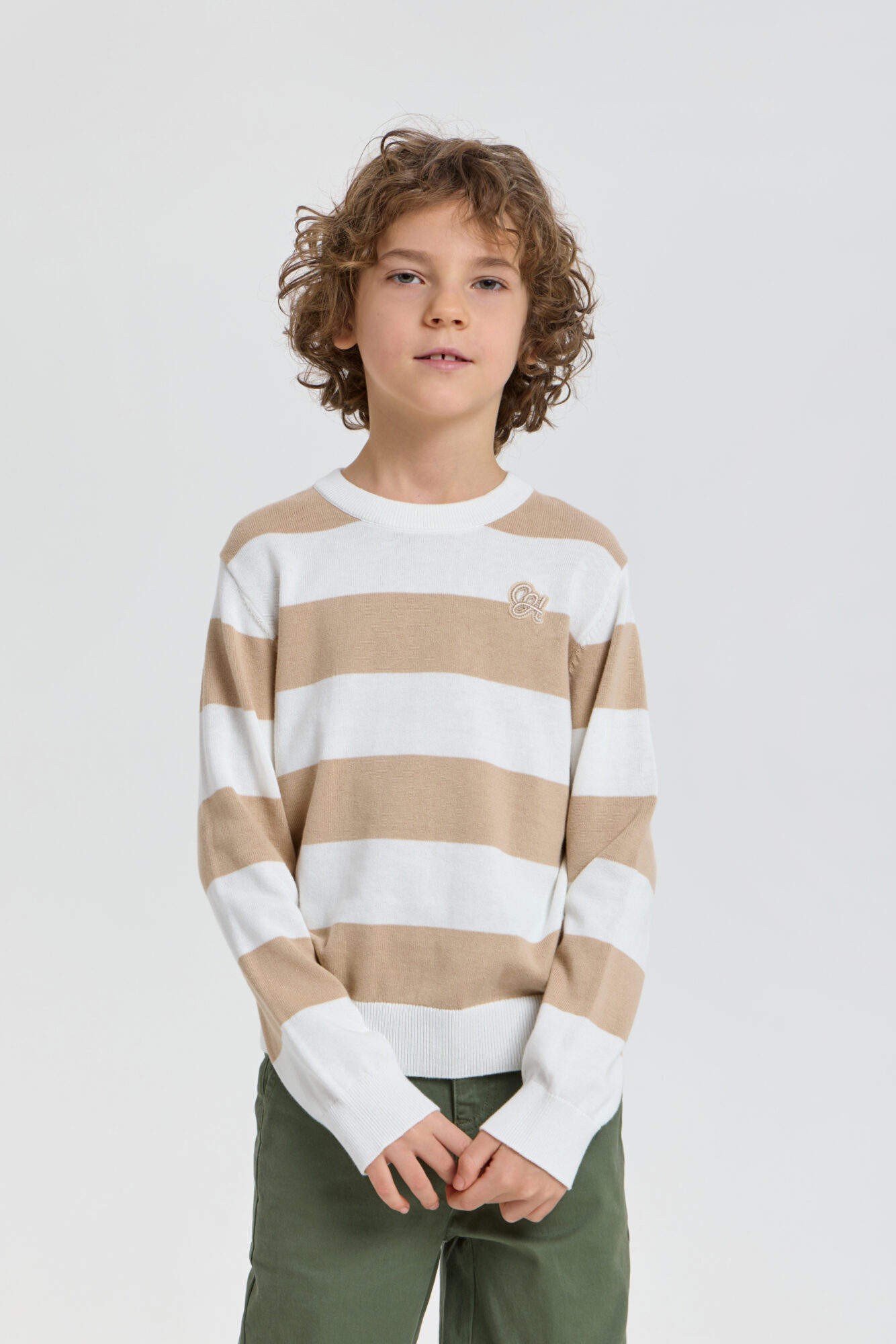 Вязаный джемпер в полоску для мальчиков – незаменимая вещь в межсезонном гардеробе. Свободный силуэт и заниженная линия плеч гарантируют удобную посадку на любую фигуру и позволяет создавать многослойные комплекты. Комфортный круглый ... вырез горловины, нижний край джемпера и манжеты рукавов выполнены из эластичного материала, обеспечивающего плотное прилегание и сохранение тепла. Джемпер в бежево-песочной гамме прекрасно комбинируется с разнообразными элементами одежды.