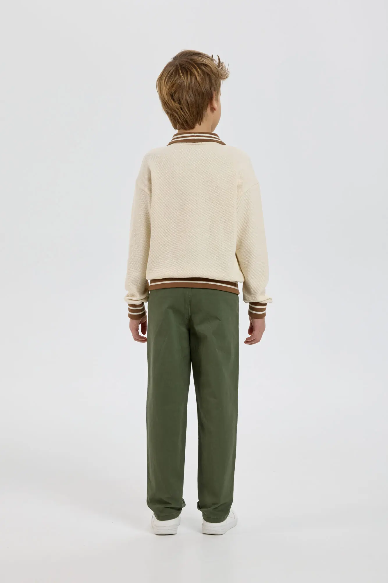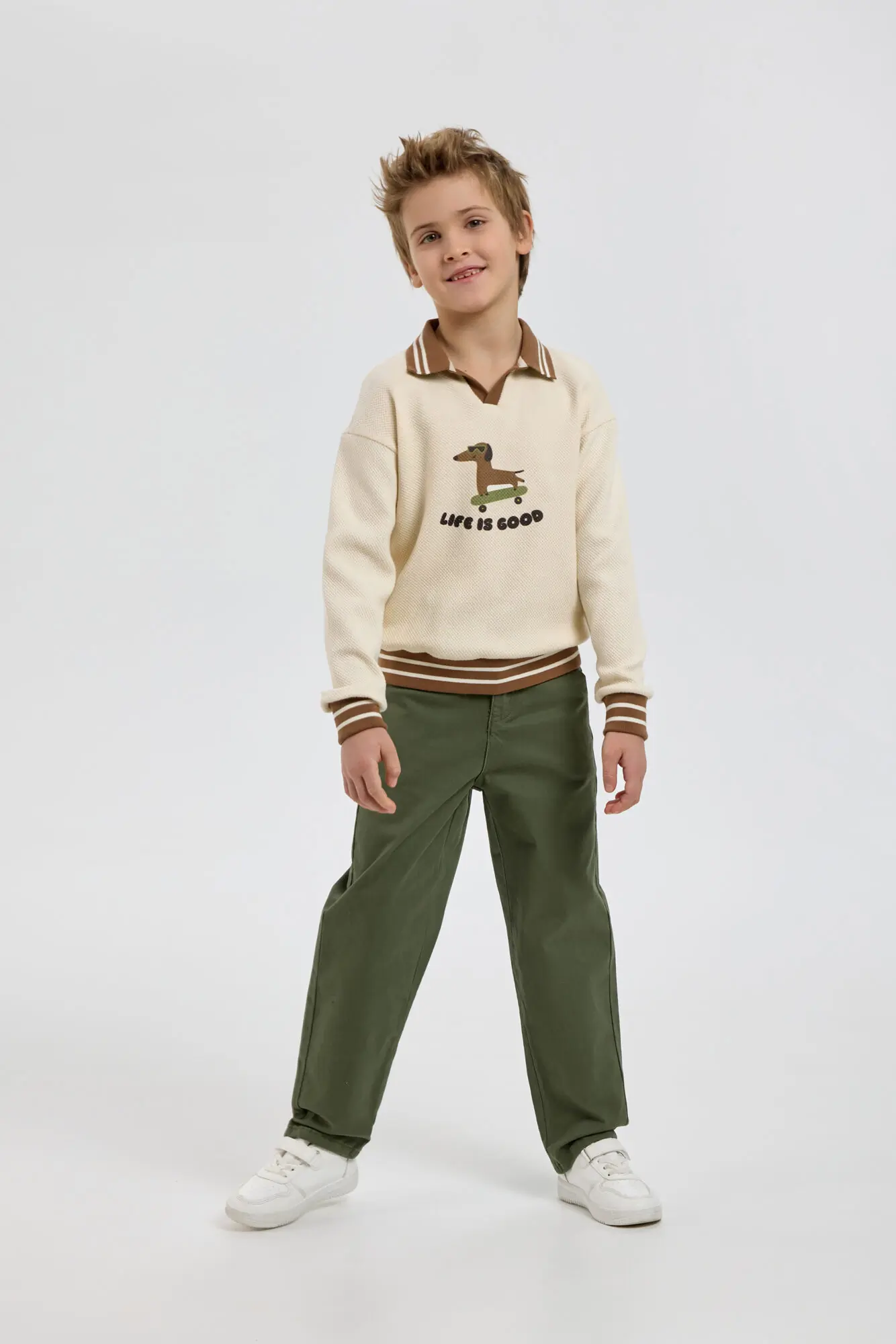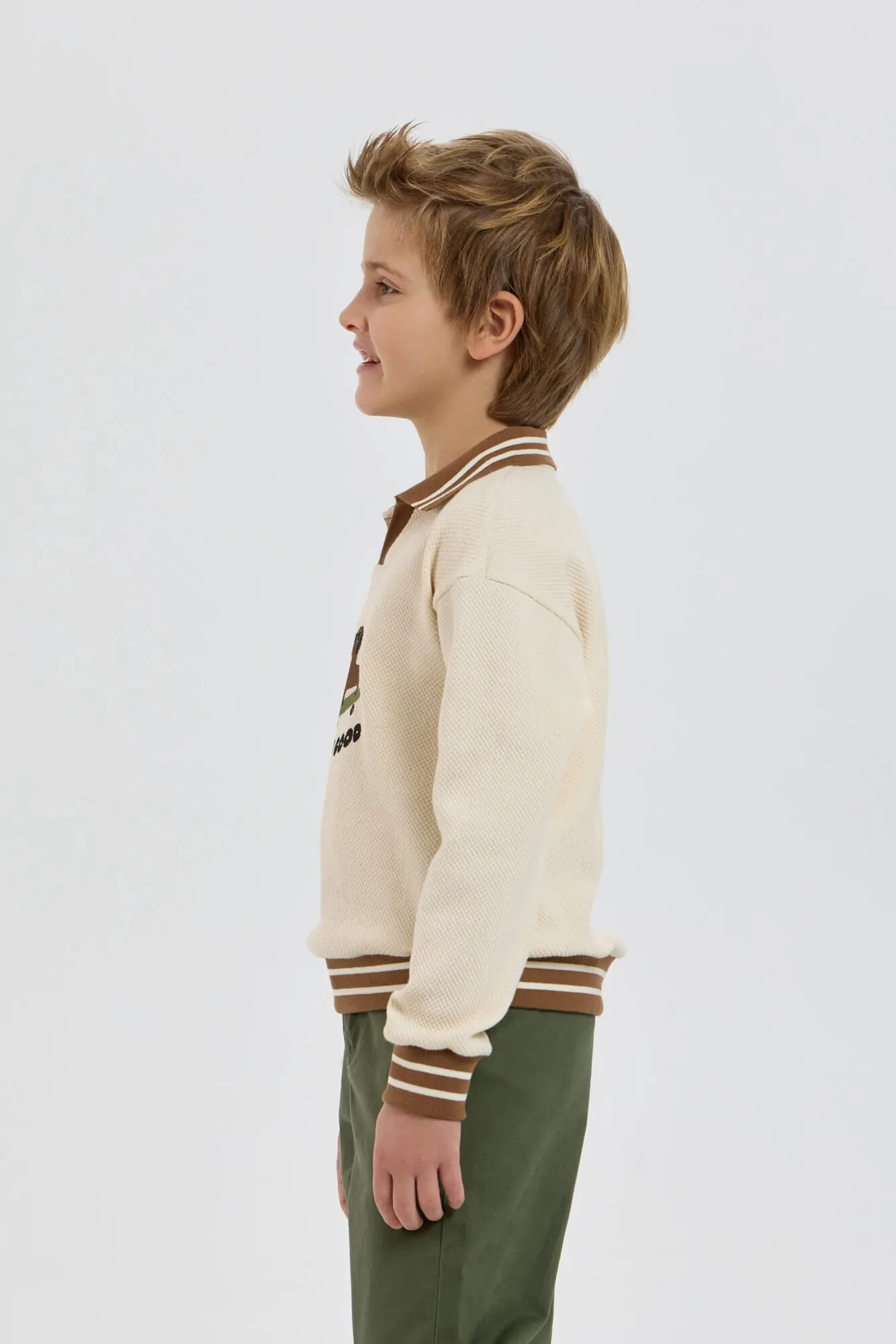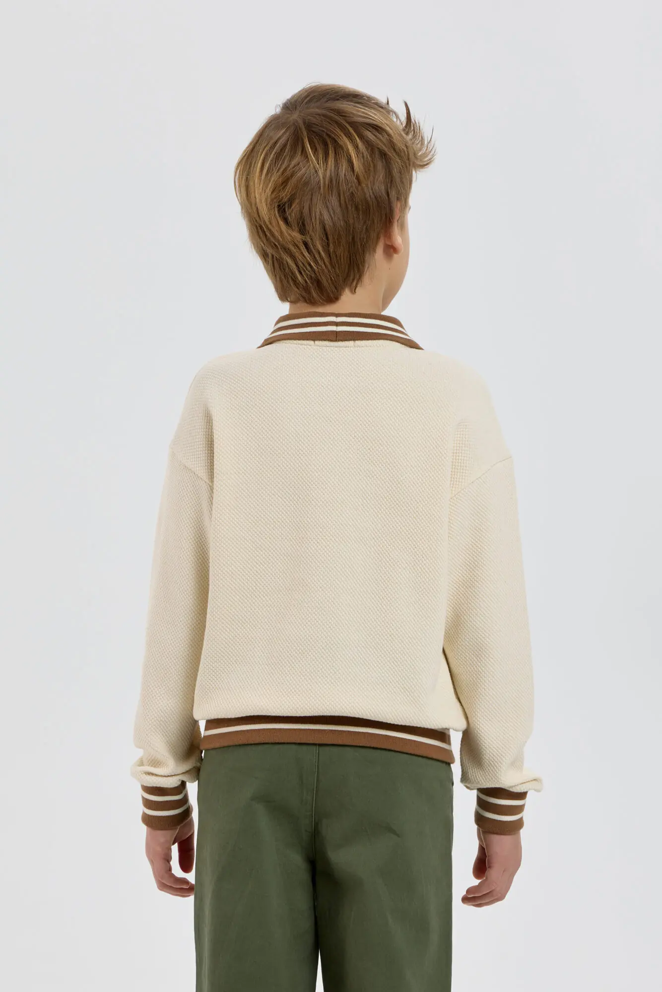 Модный трикотажный джемпер для мальчика – незаменимая вещь, легко сочетающаяся с другими предметами одежды. Модель изготовлена из нежной хлопковой ткани, дарящей уют и сохраняющей тепло в прохладную погоду. Свободный крой, ... V-образный вырез горловины и оригинальный рисунок создают современный и стильный образ. Контрастная резинка на отложном воротнике, манжетах и по низу добавляет уникальности этому изделию. Бежевый джемпер превосходно сочетается как с джинсами, так и с классическими брюками.