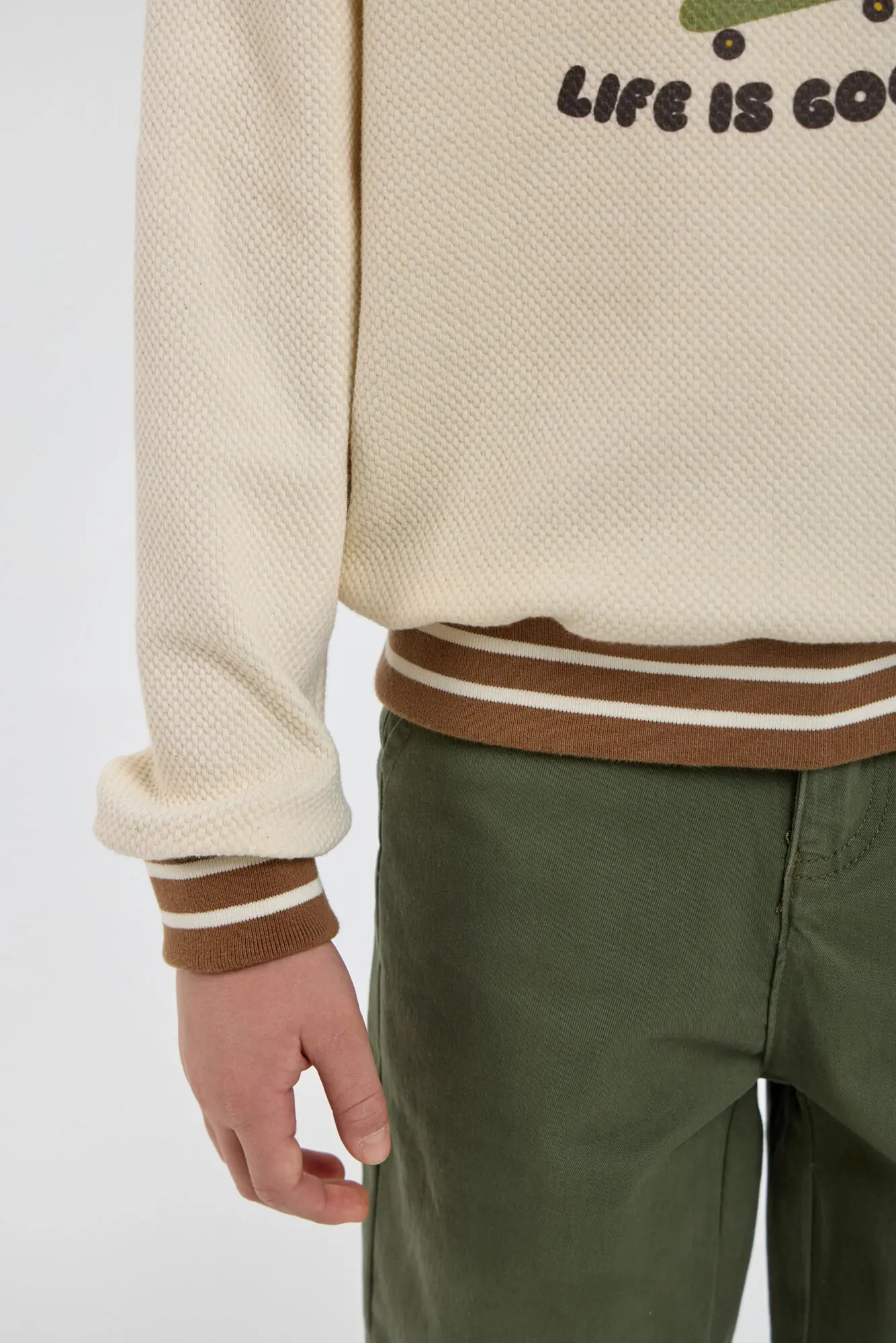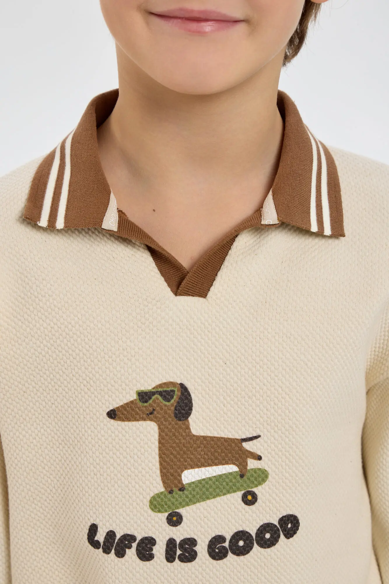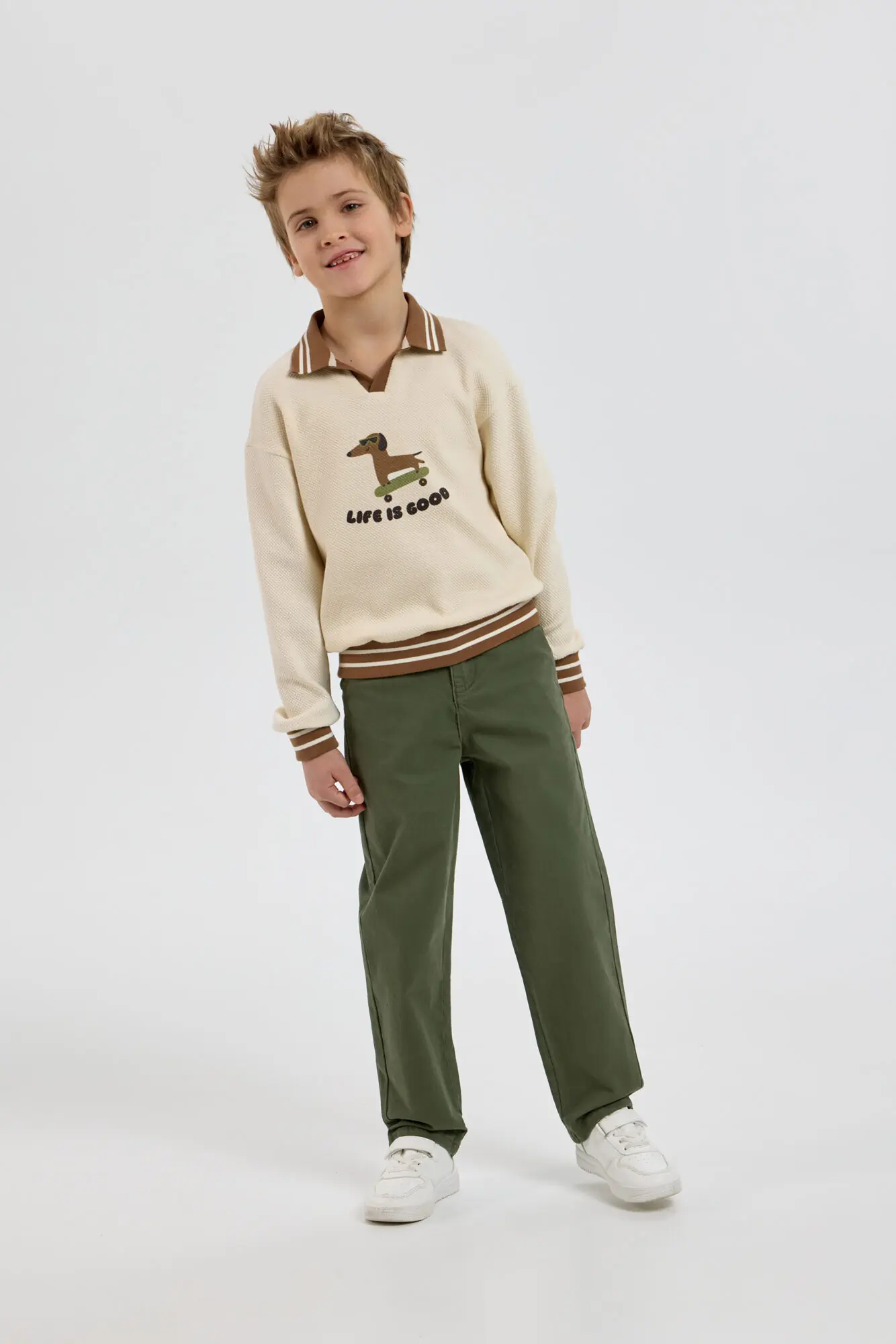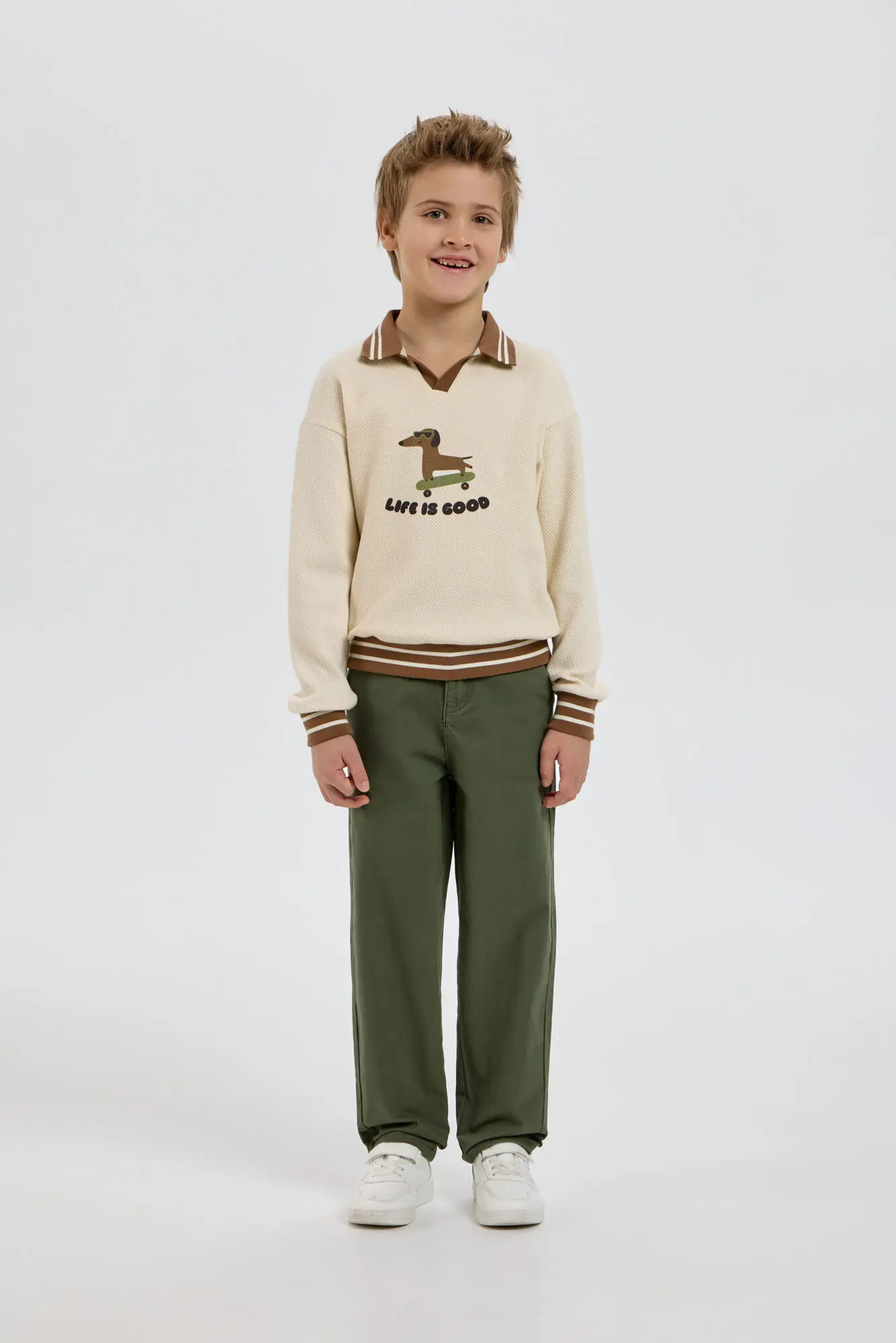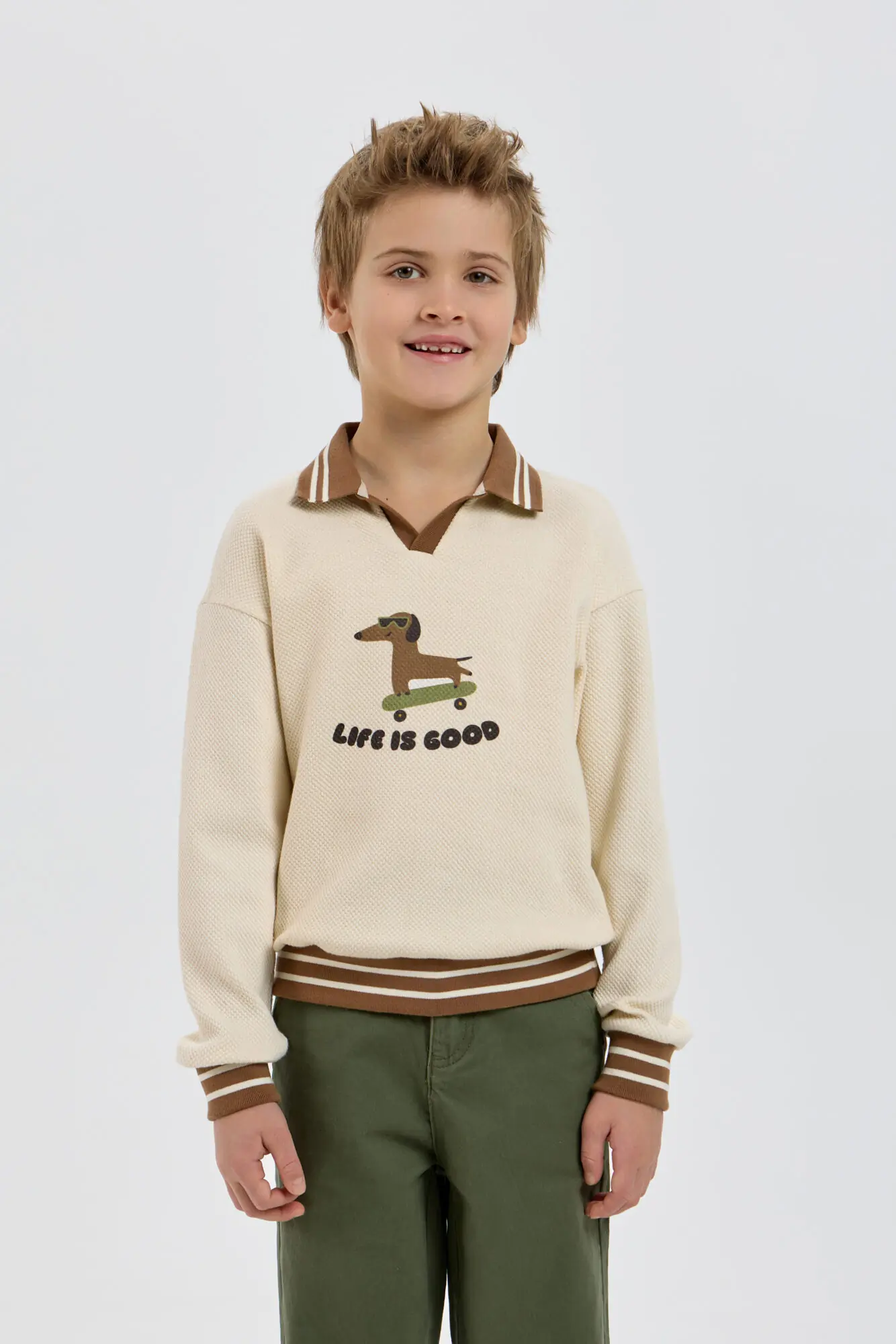 Модный трикотажный джемпер для мальчика – незаменимая вещь, легко сочетающаяся с другими предметами одежды. Модель изготовлена из нежной хлопковой ткани, дарящей уют и сохраняющей тепло в прохладную погоду. Свободный крой, ... V-образный вырез горловины и оригинальный рисунок создают современный и стильный образ. Контрастная резинка на отложном воротнике, манжетах и по низу добавляет уникальности этому изделию. Бежевый джемпер превосходно сочетается как с джинсами, так и с классическими брюками.