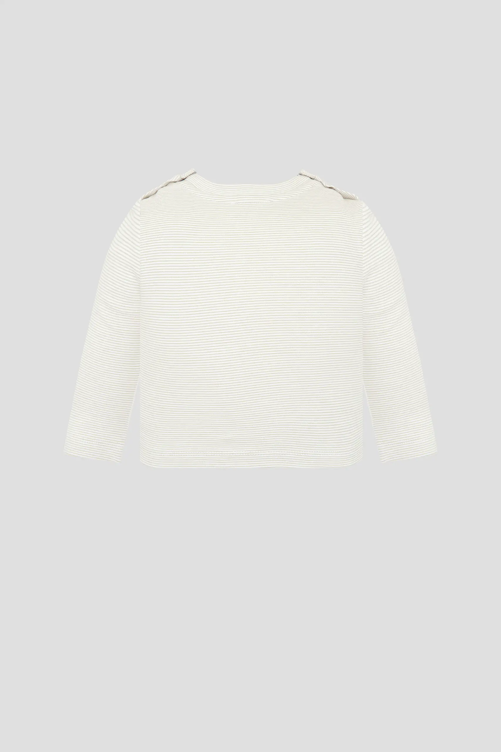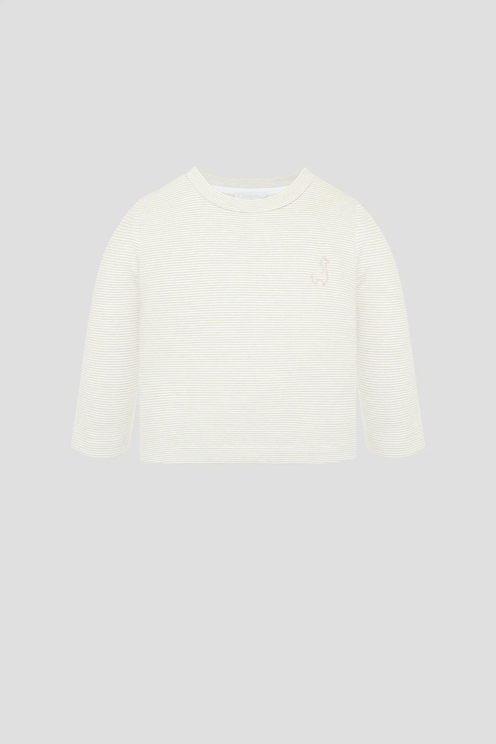Джемпер из мягкого трикотажа выполнен в теплом оттенке экрю. Полосатый рисунок никогда не теряет своей актуальности и очень украшает дизайн. На груди расположена вышивка в виде ... альпаки. Джемпер с круглым вырезом горловины, в качестве застежек выступают кнопки, расположенные по бокам от горловины. Натуральный хлопок в составе ткани поддерживает оптимальную температуру, хорошо пропускает воздух, что гарантирует малышу абсолютный комфорт.