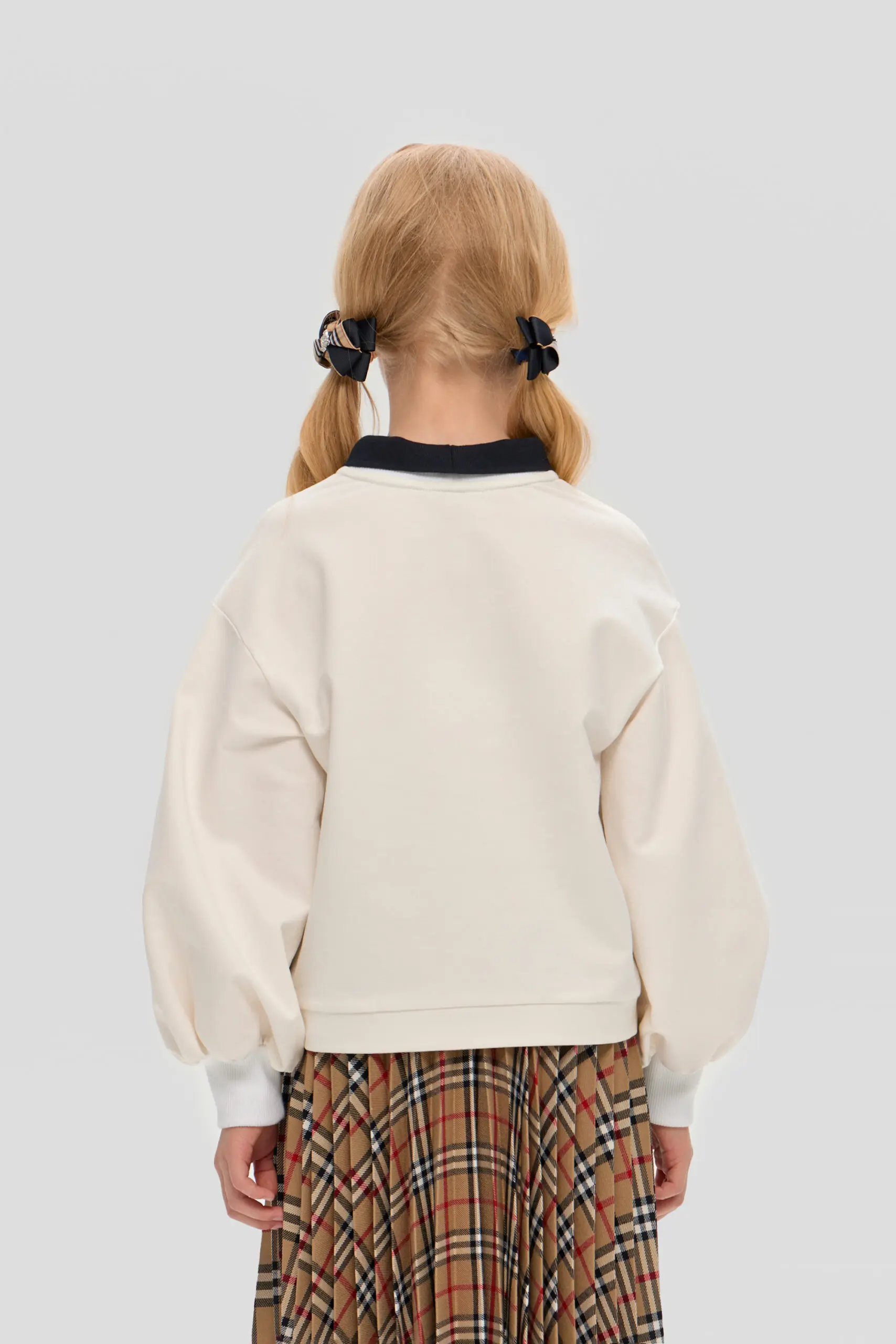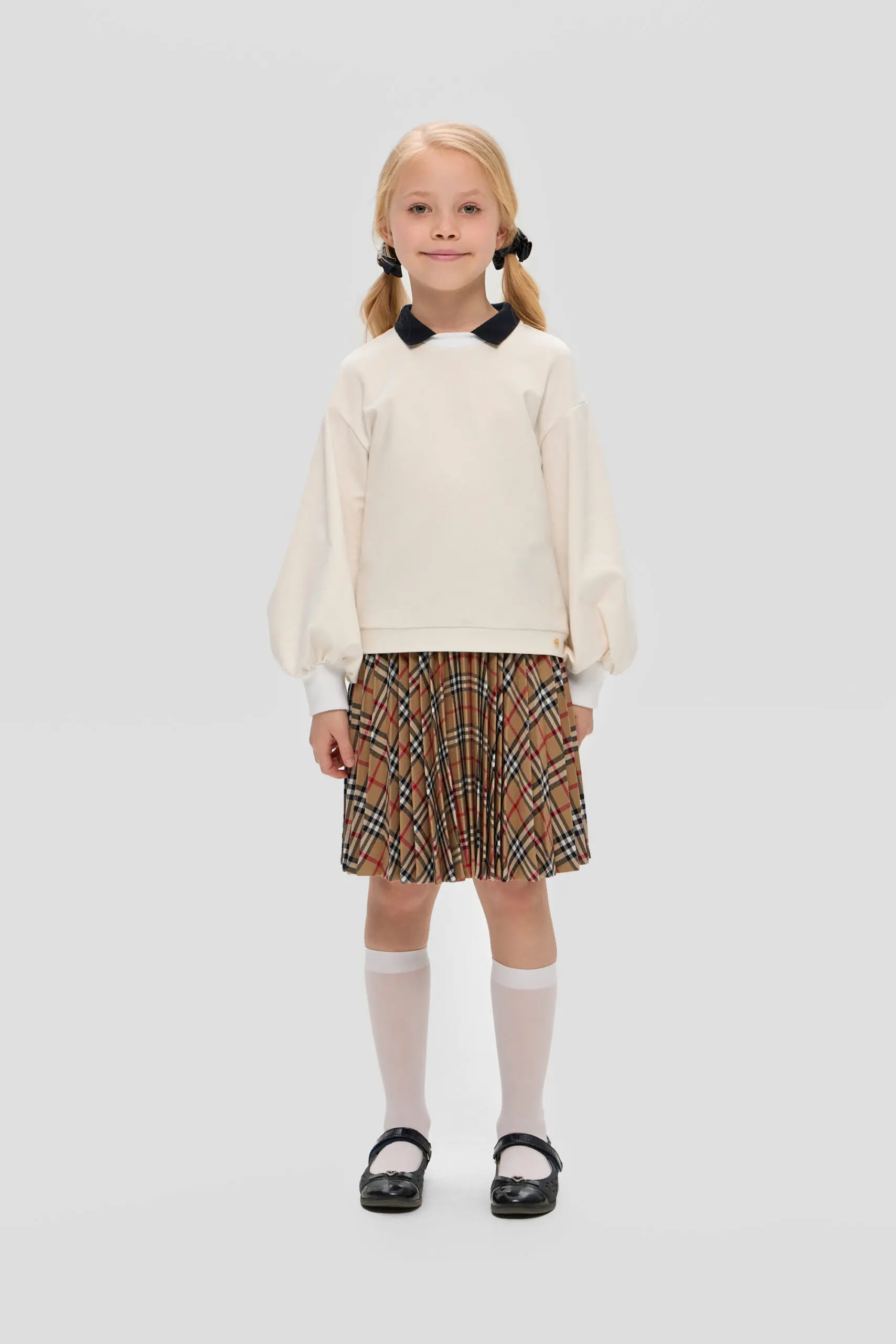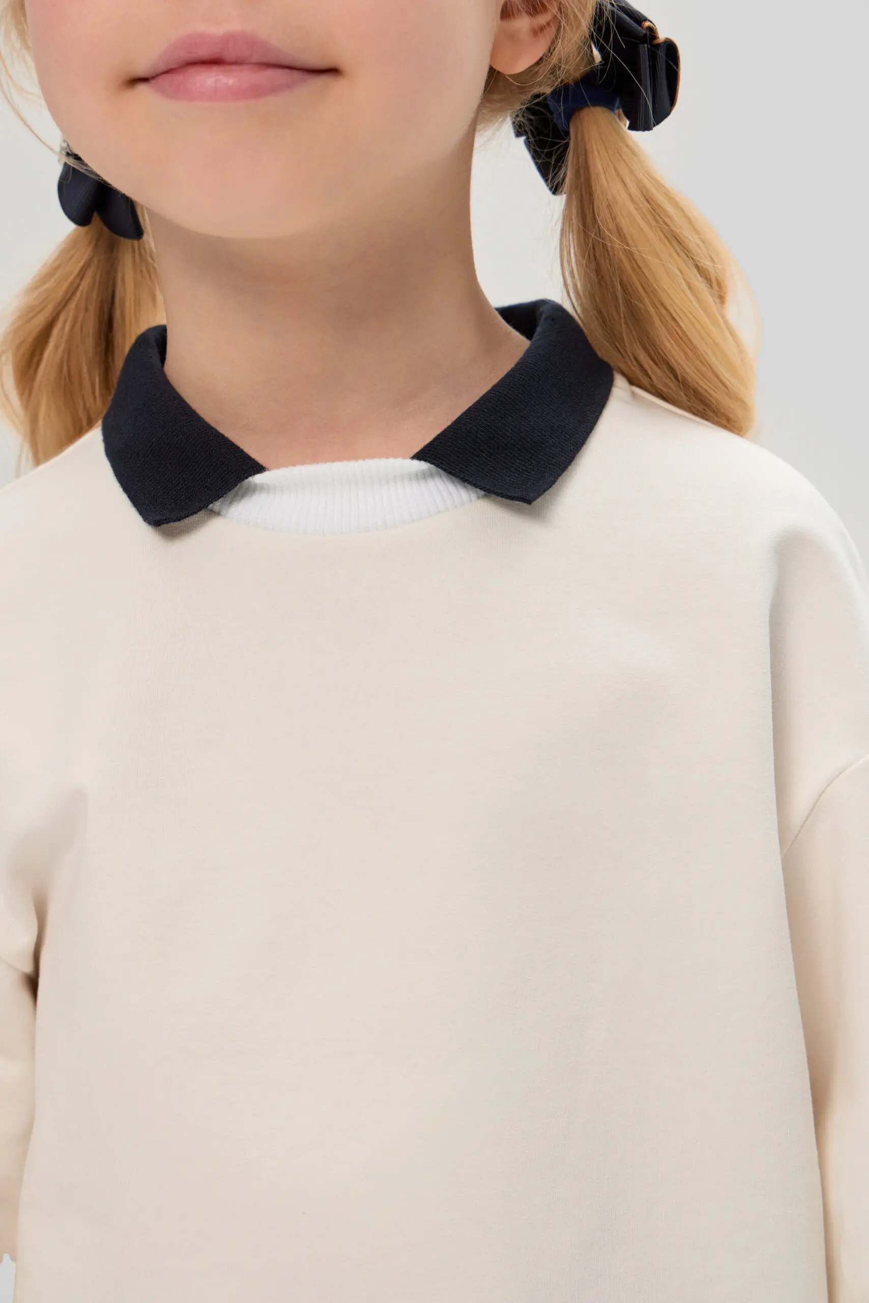 Стильный джемпер для девочки – незаменимый элемент школьной одежды. Модный силуэт свитшота дополненный круглым вырезом горловины с аккуратной отделкой, создает современный образ. Длинные рукава и нижний ... край джемпера снабжены широкими эластичными резинками. Завершает дизайн контрастный, съемный воротник. Этот джемпер идеально комбинируется с юбками и брюками разных стилей.